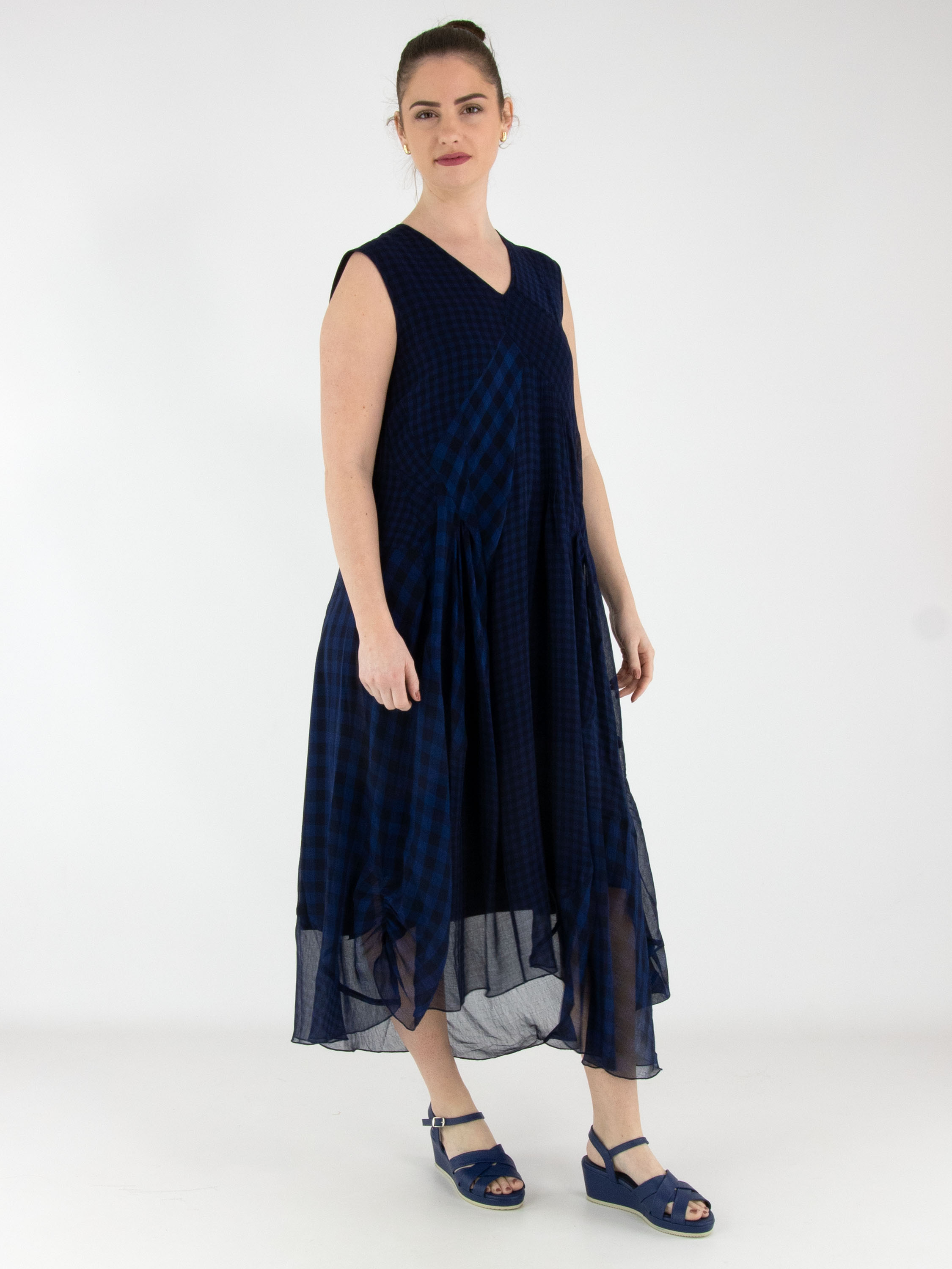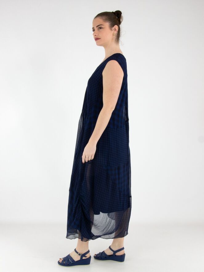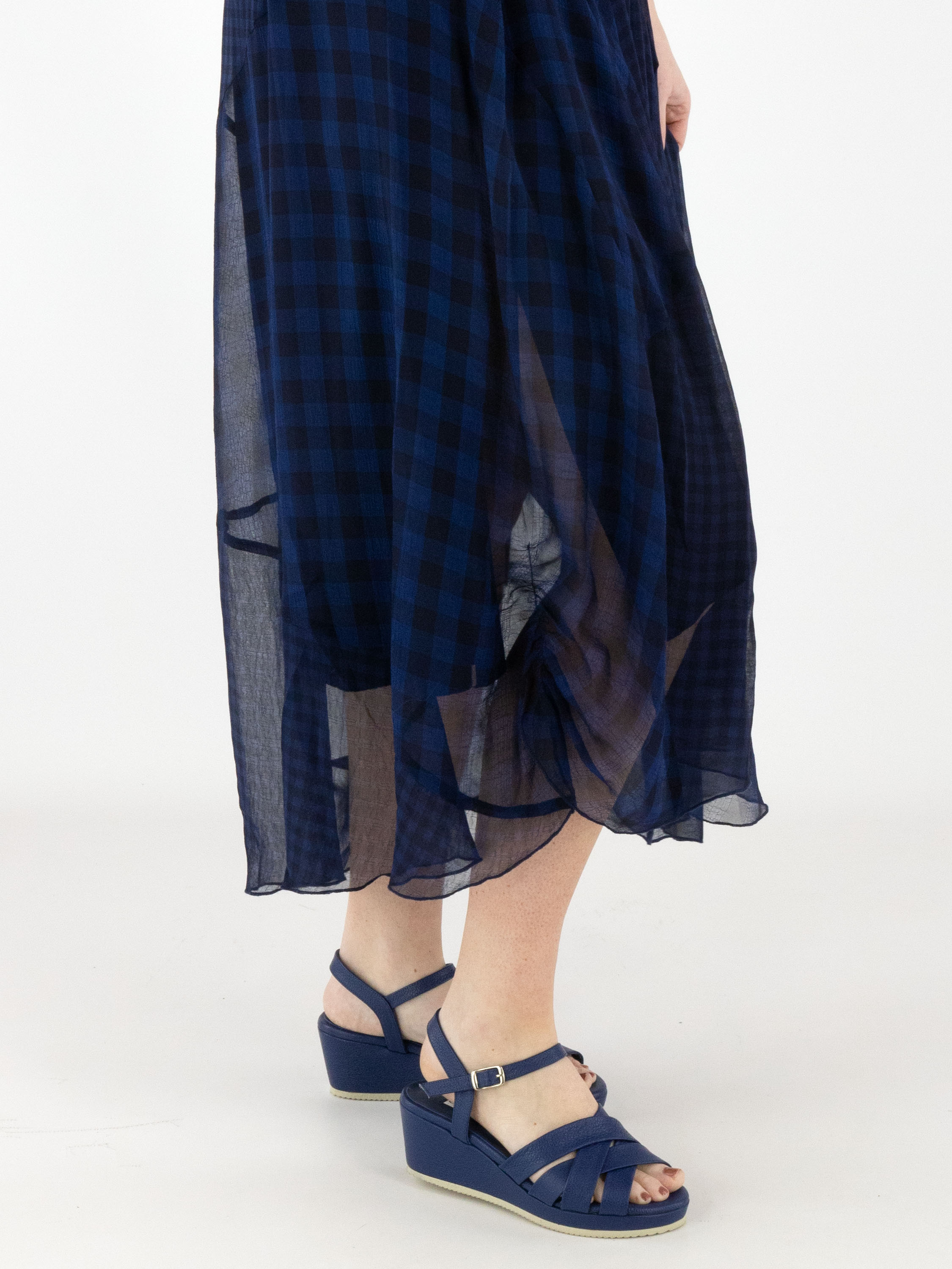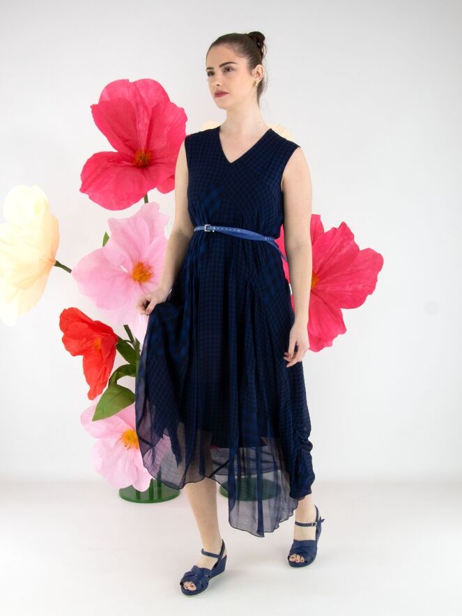 A dress by High made from a matte satin fabric, layered with a transparent checked overlay in various shades of blue. The checked fabric is pleated and folded at selected points and divided by multiple diagonal seams. From the waist, the dress flares into an A-line silhouette. This dress can be hand-washed.