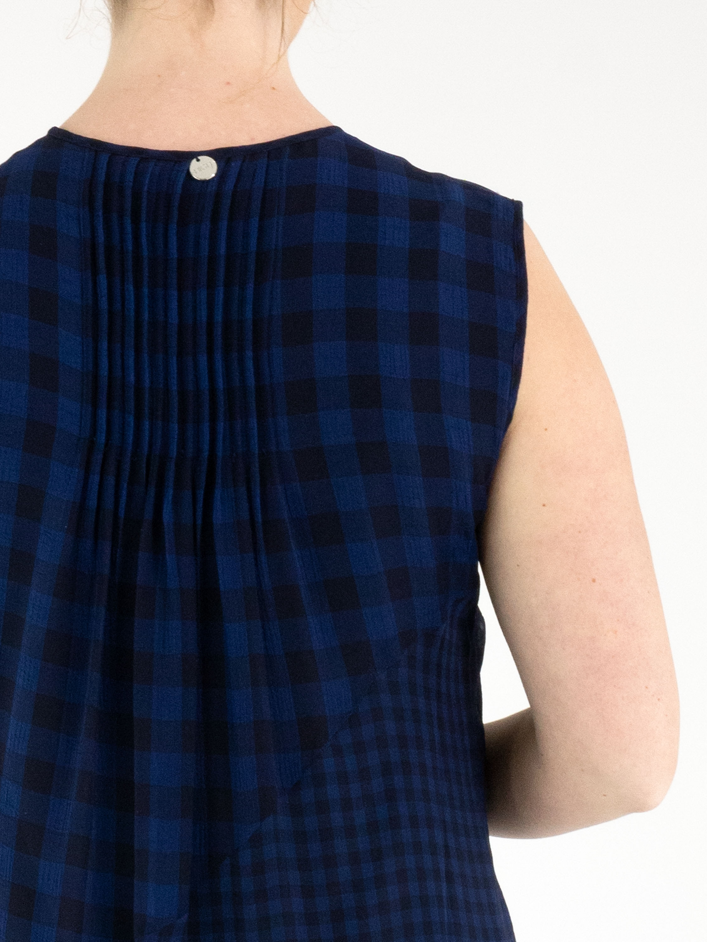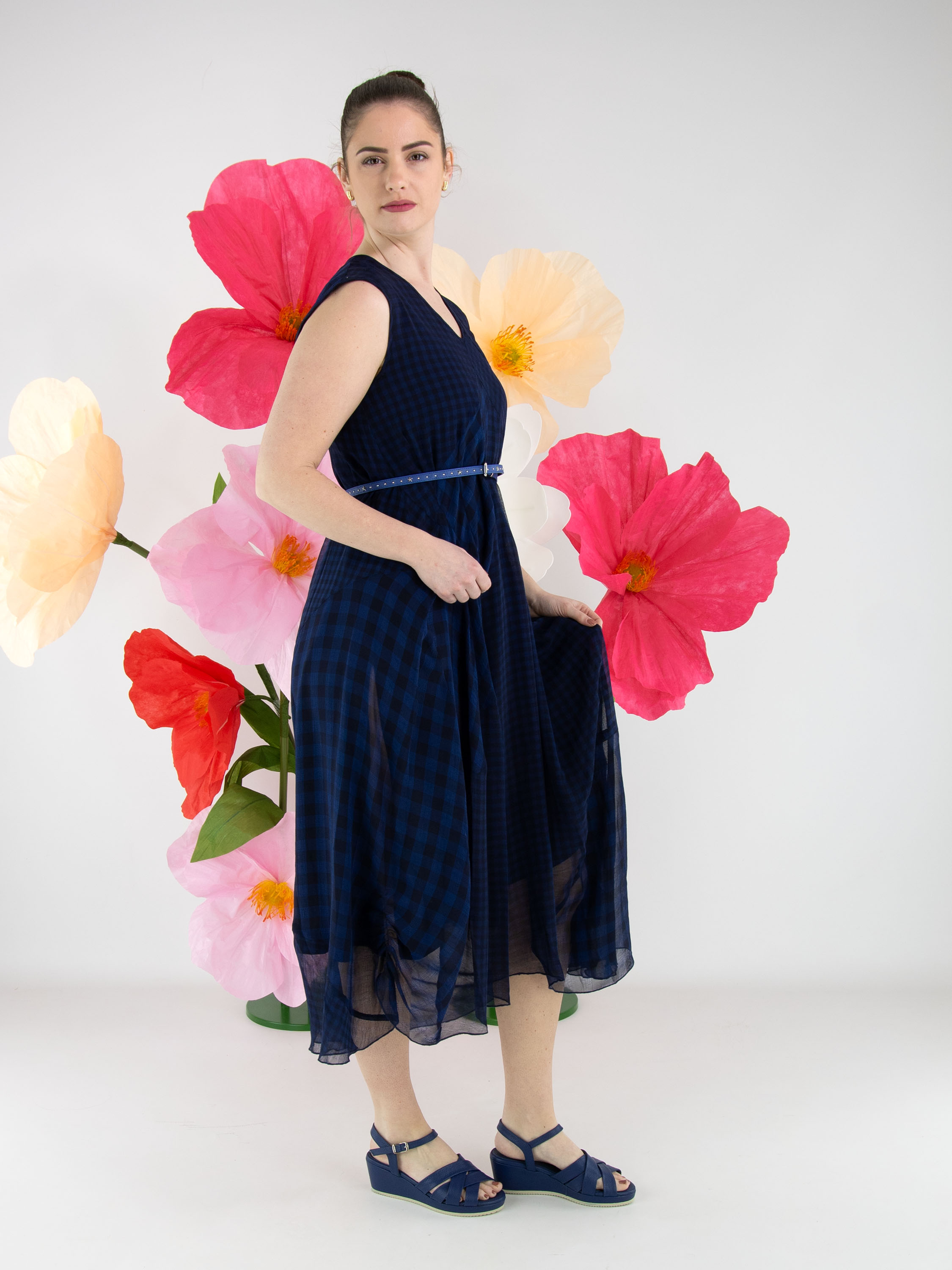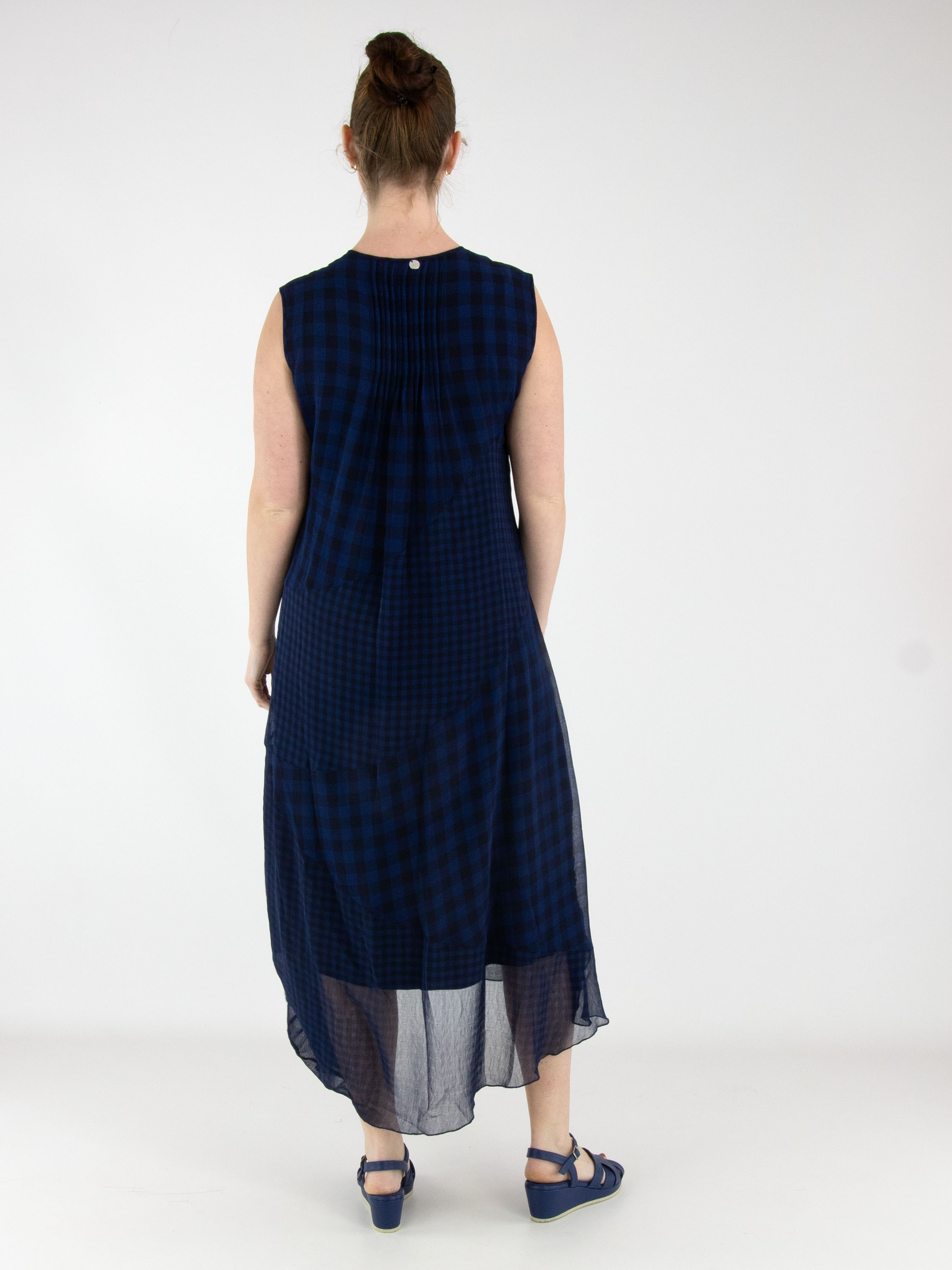 A dress by High made from a matte satin fabric, layered with a transparent checked overlay in various shades of blue. The checked fabric is pleated and folded at selected points and divided by multiple diagonal seams. From the waist, the dress flares into an A-line silhouette. This dress can be hand-washed.