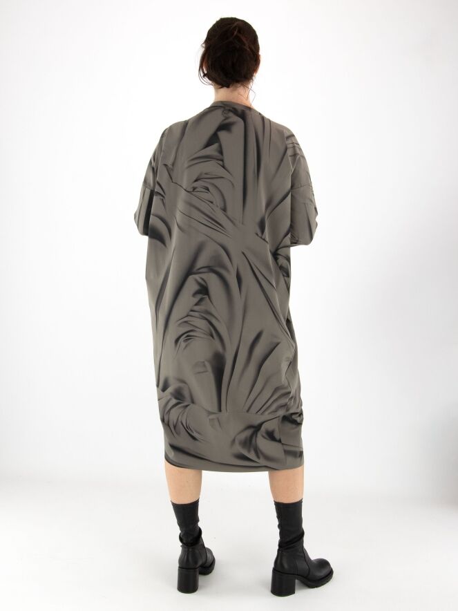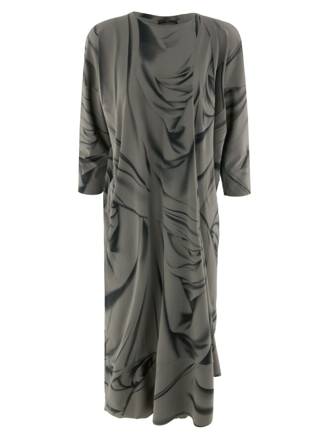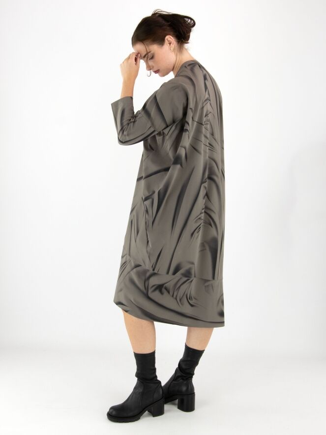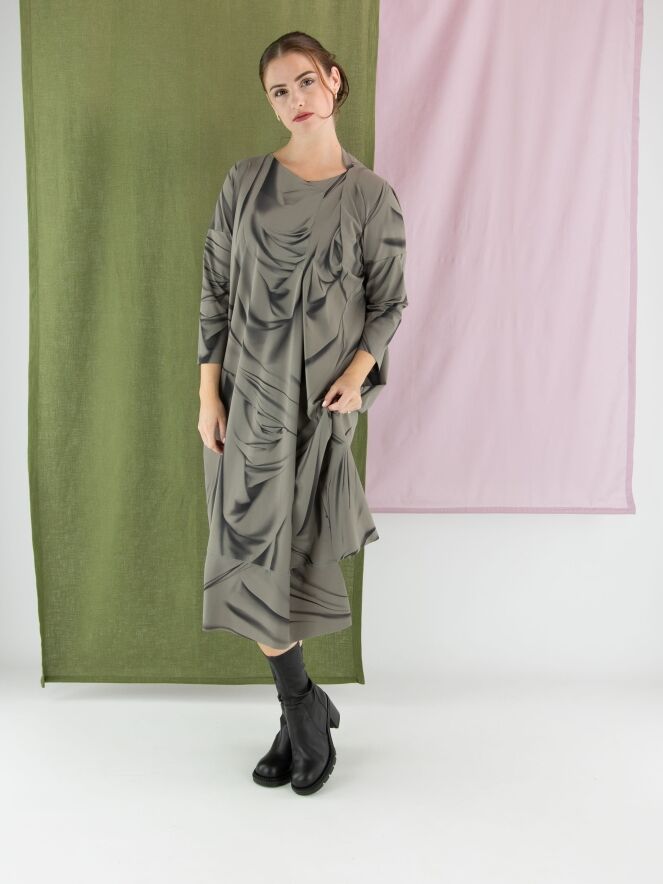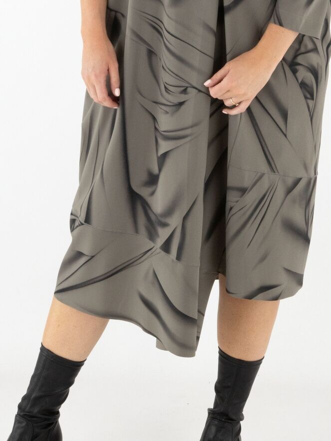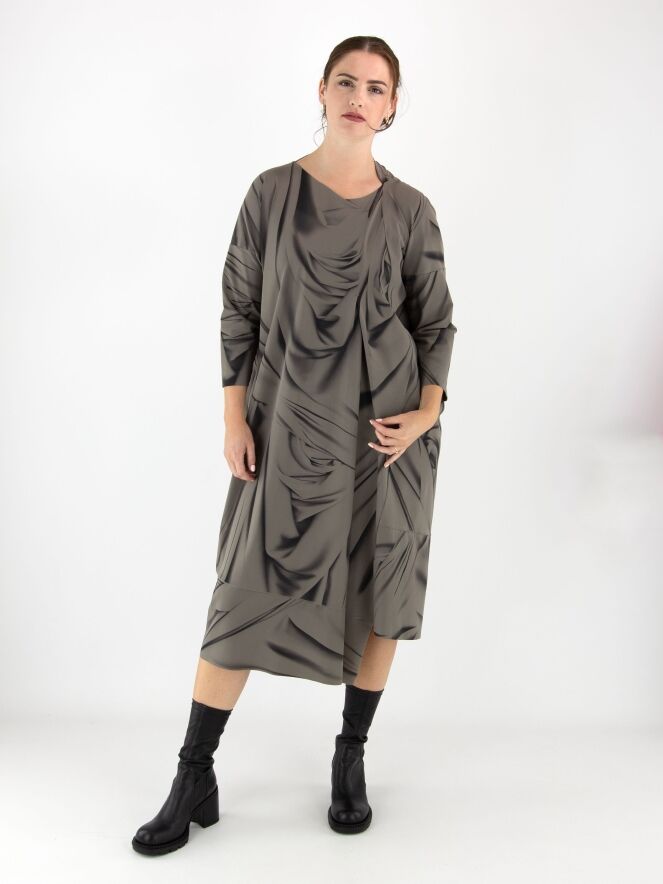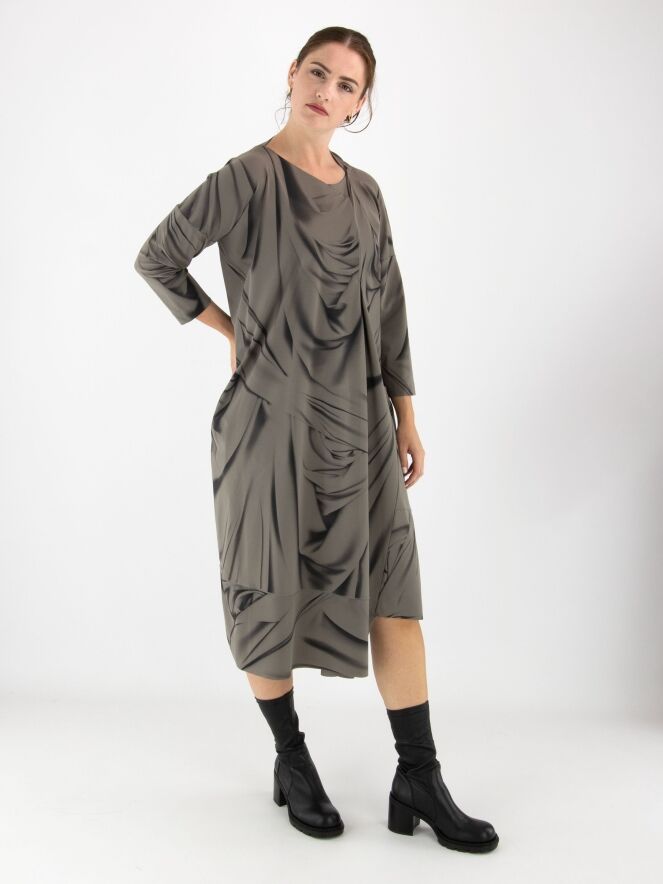 A dress by High featuring a graphic brushed print in black and taupe. The edge of the asymmetric neckline has a decorative overlay. At waist height on the right side, there is a slit pocket. The dress has elbow-length sleeves and can be washed at 30 degrees.