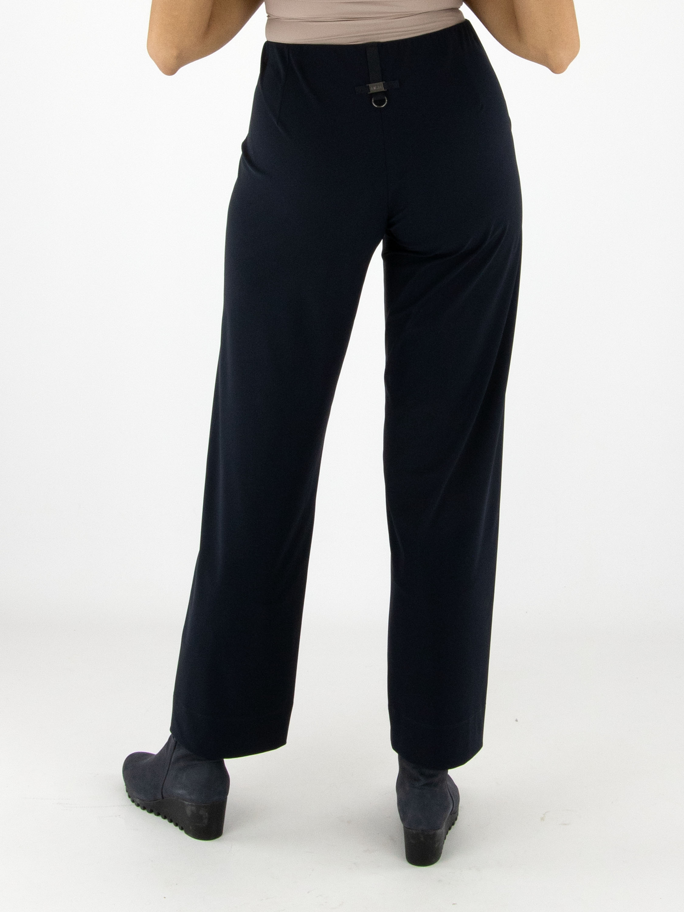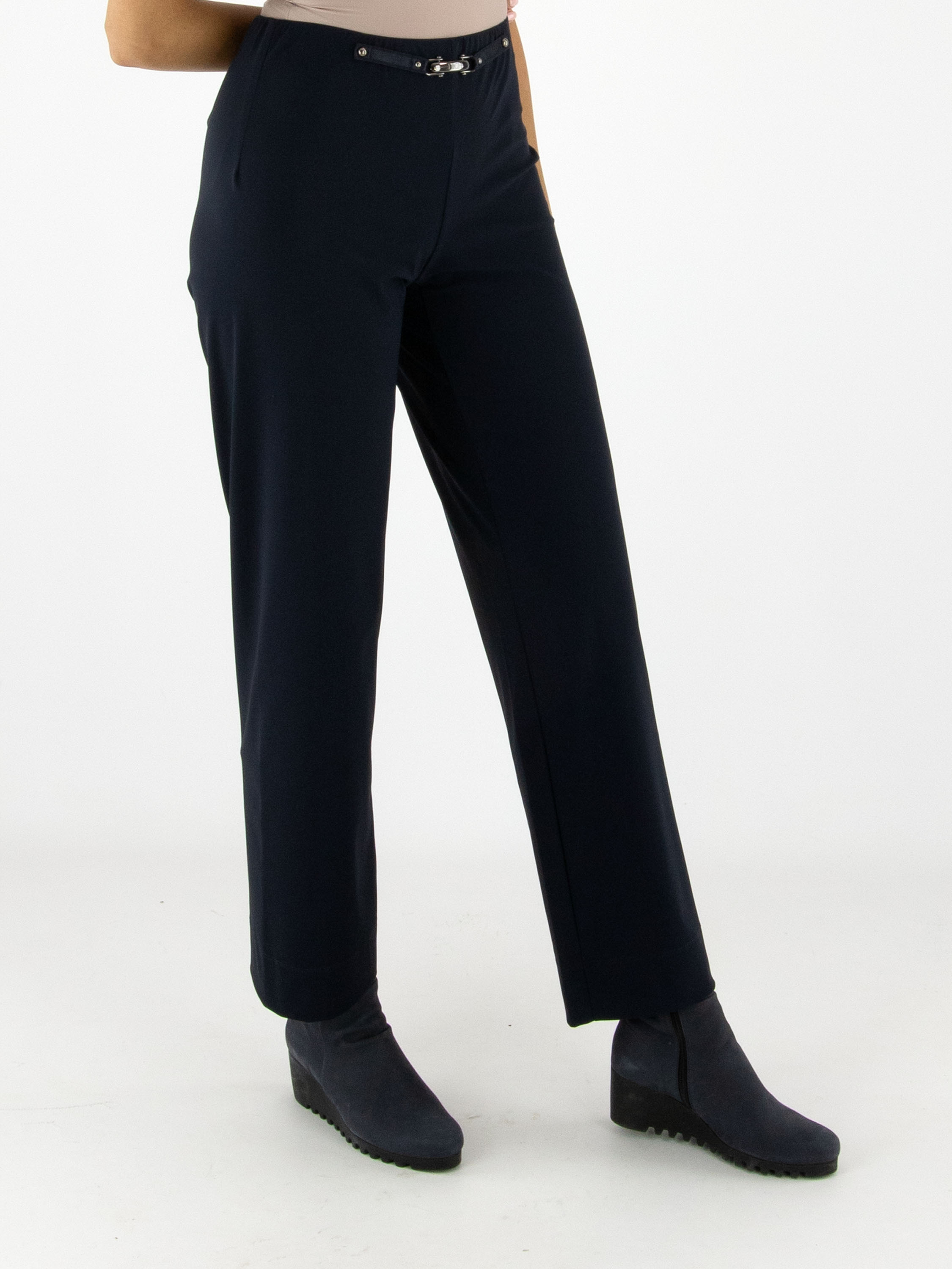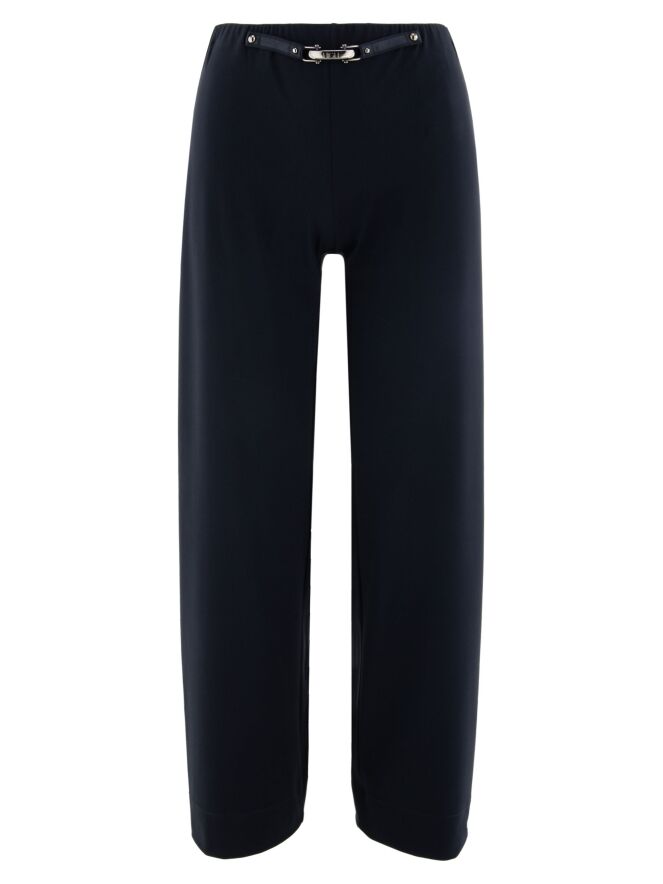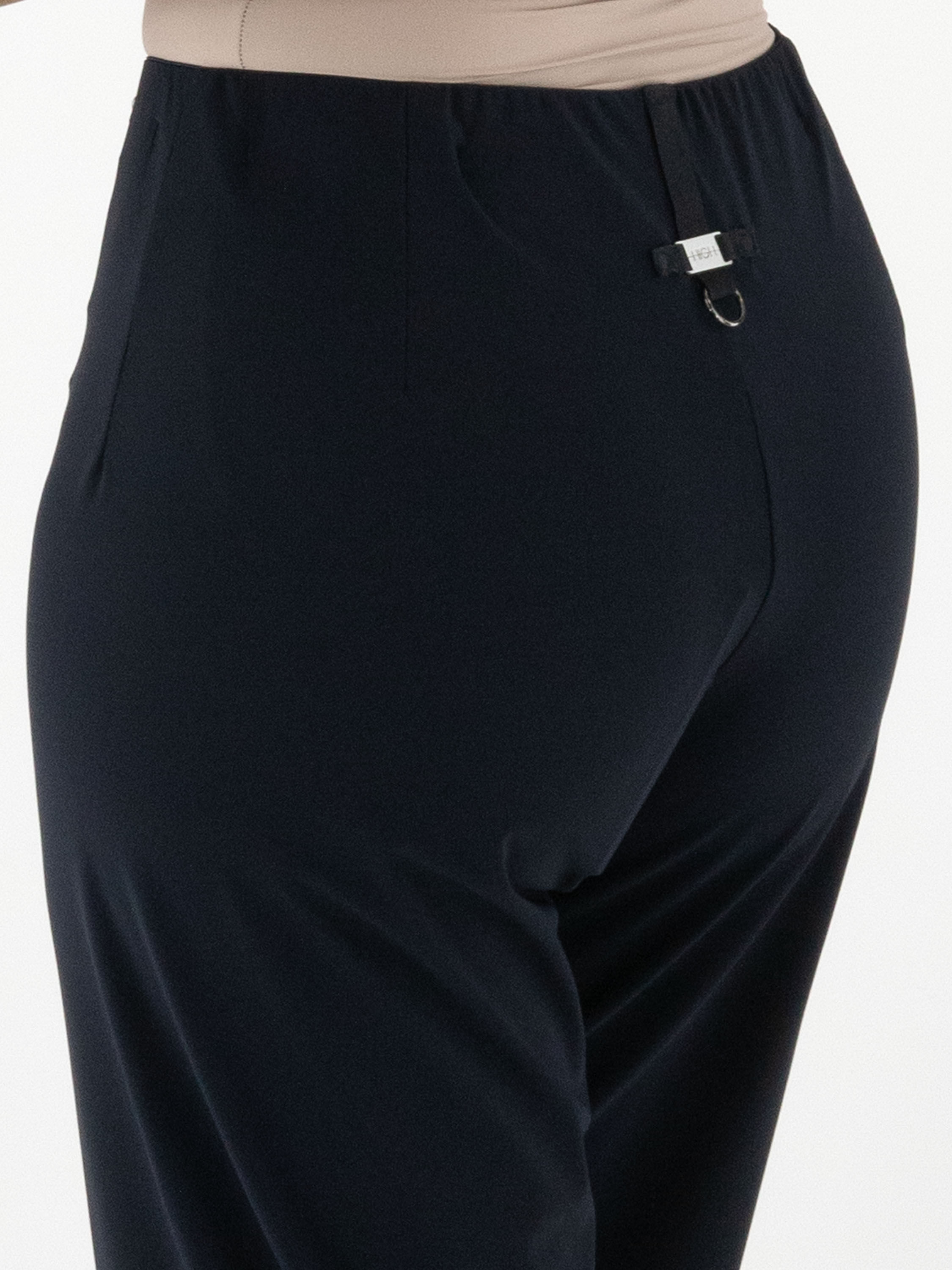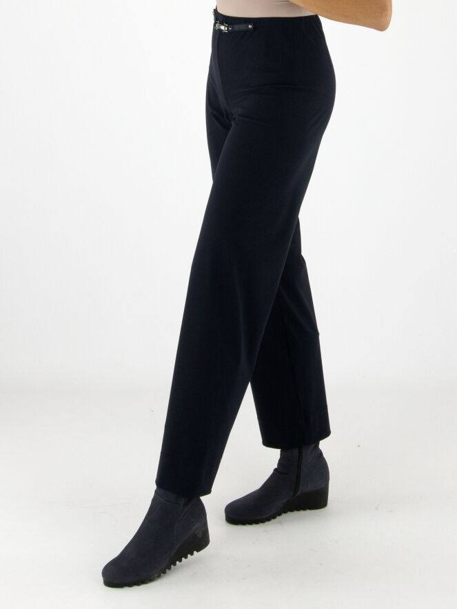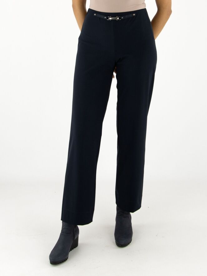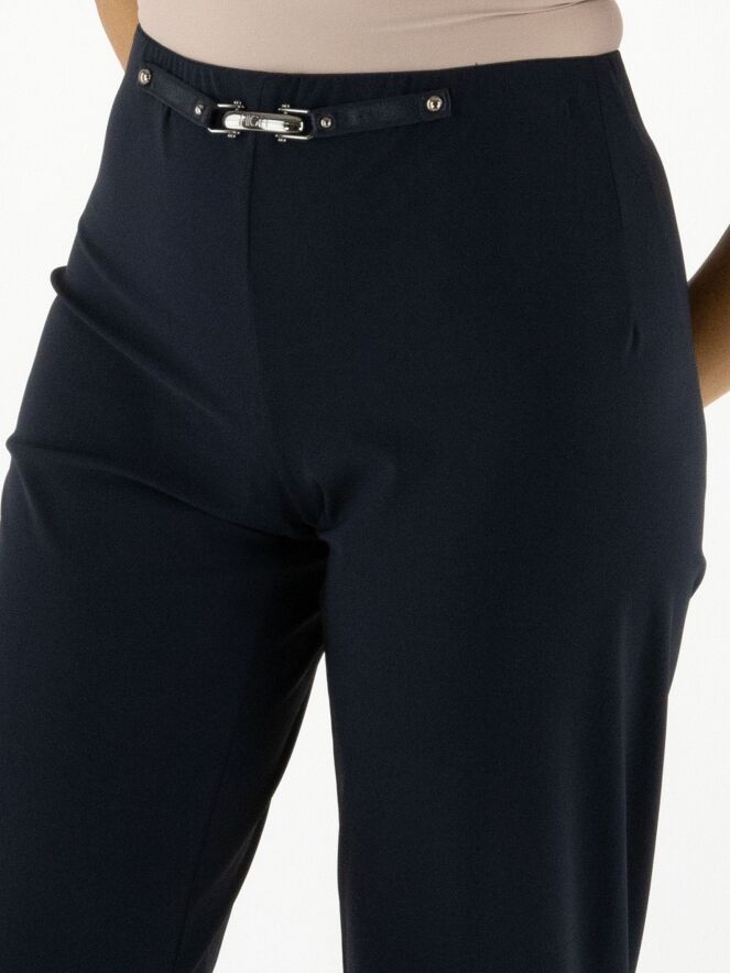 Trousers by High in navy blue. The waistband is elastic. At the front, at waist level, there is a decorative nickel-coloured buckle with two studs. These trousers can be washed at 30 degrees.