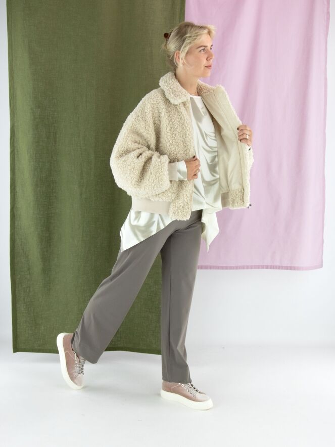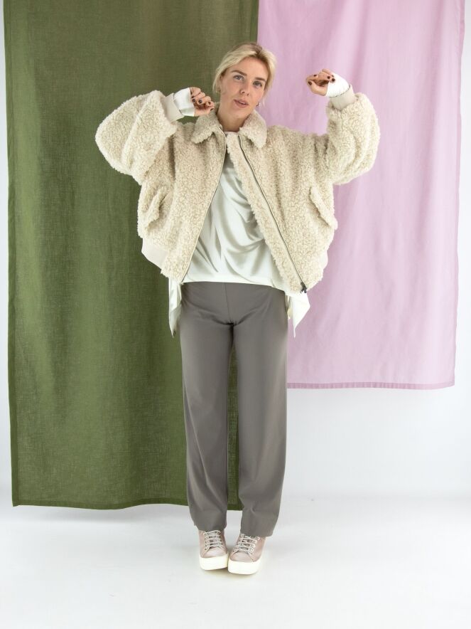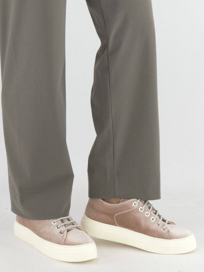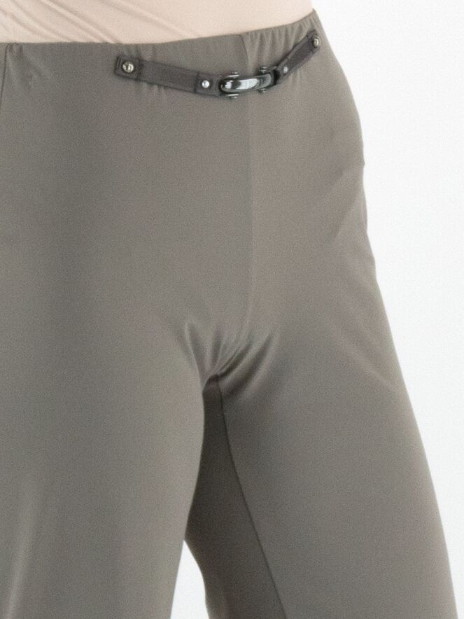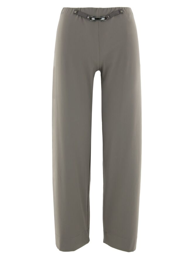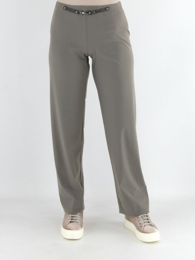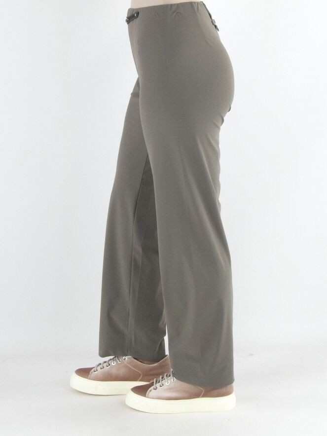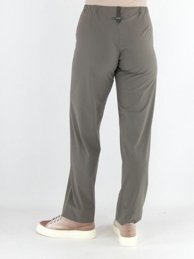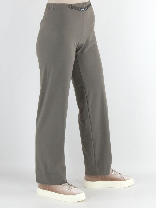Trousers by High in olive green. The waistband is elastic. At the front, at waist level, there is a decorative nickel-coloured buckle with two studs. These trousers can be washed at 30 degrees.