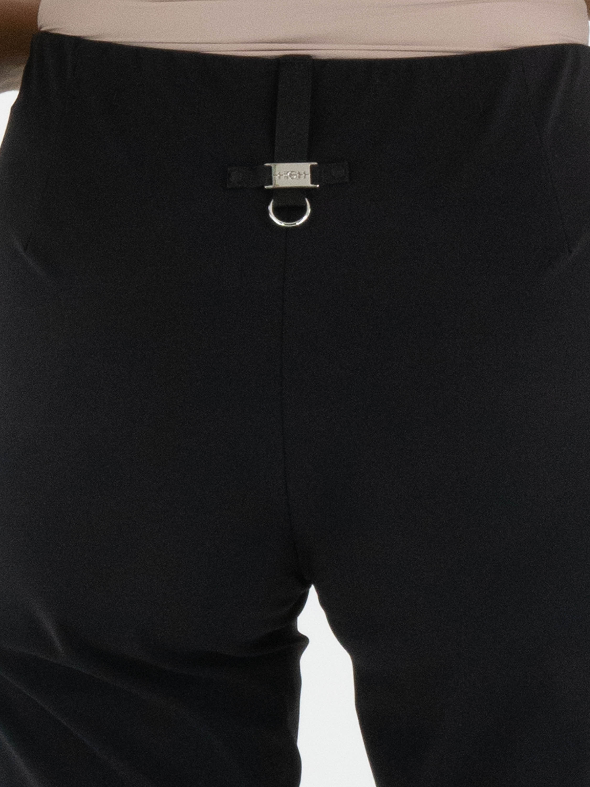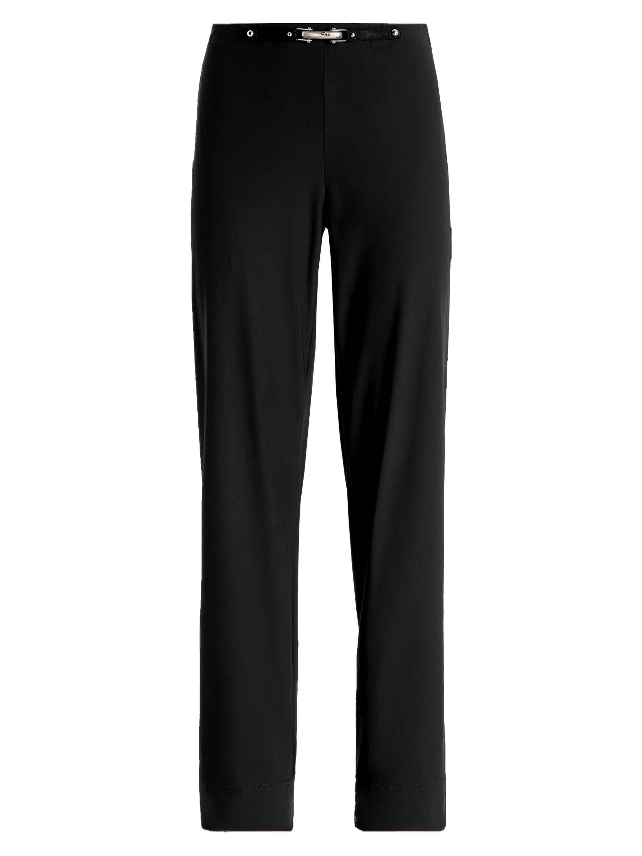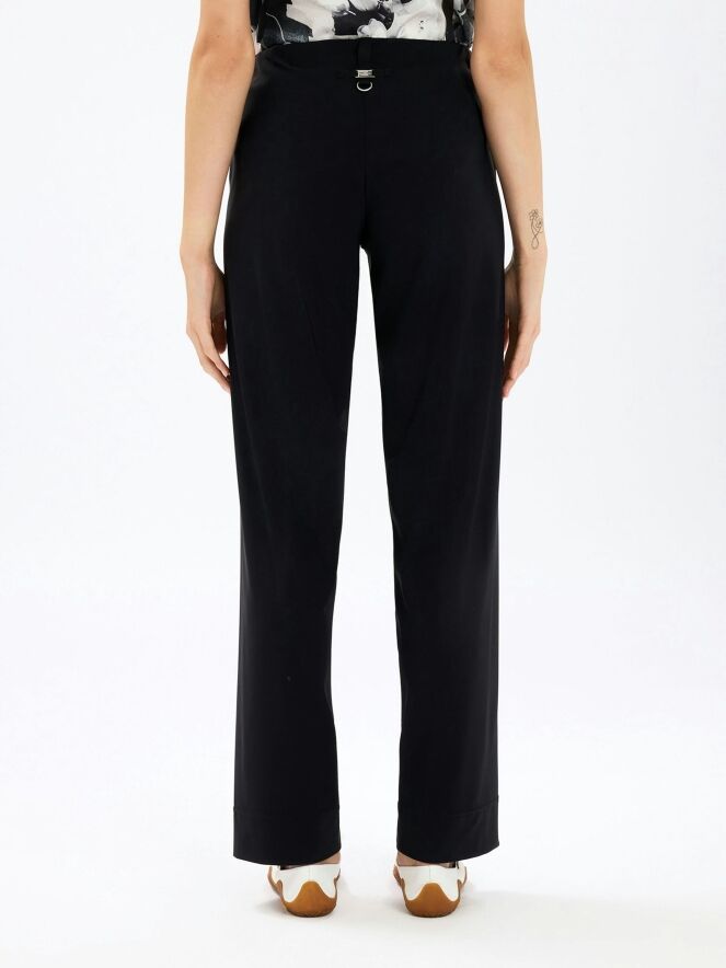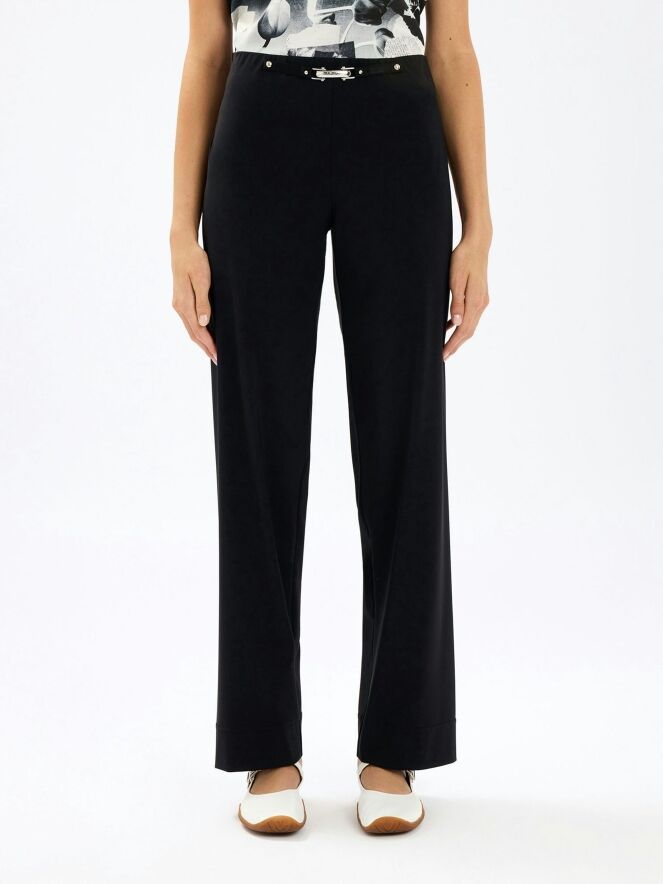 Trousers by High in black. The elastic waistband is accented at the front with a decorative elongated silver-tone bar, adding a refined detail. The straight-cut legs create a timeless and elegant silhouette. These exclusive designer trousers can be washed at 30 degrees.