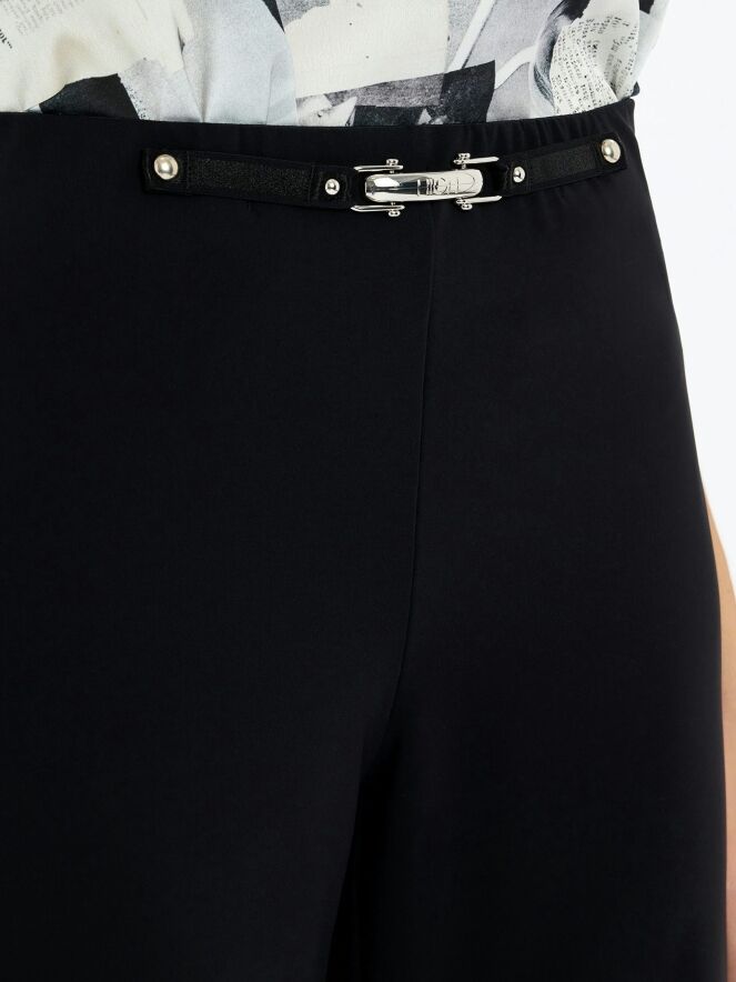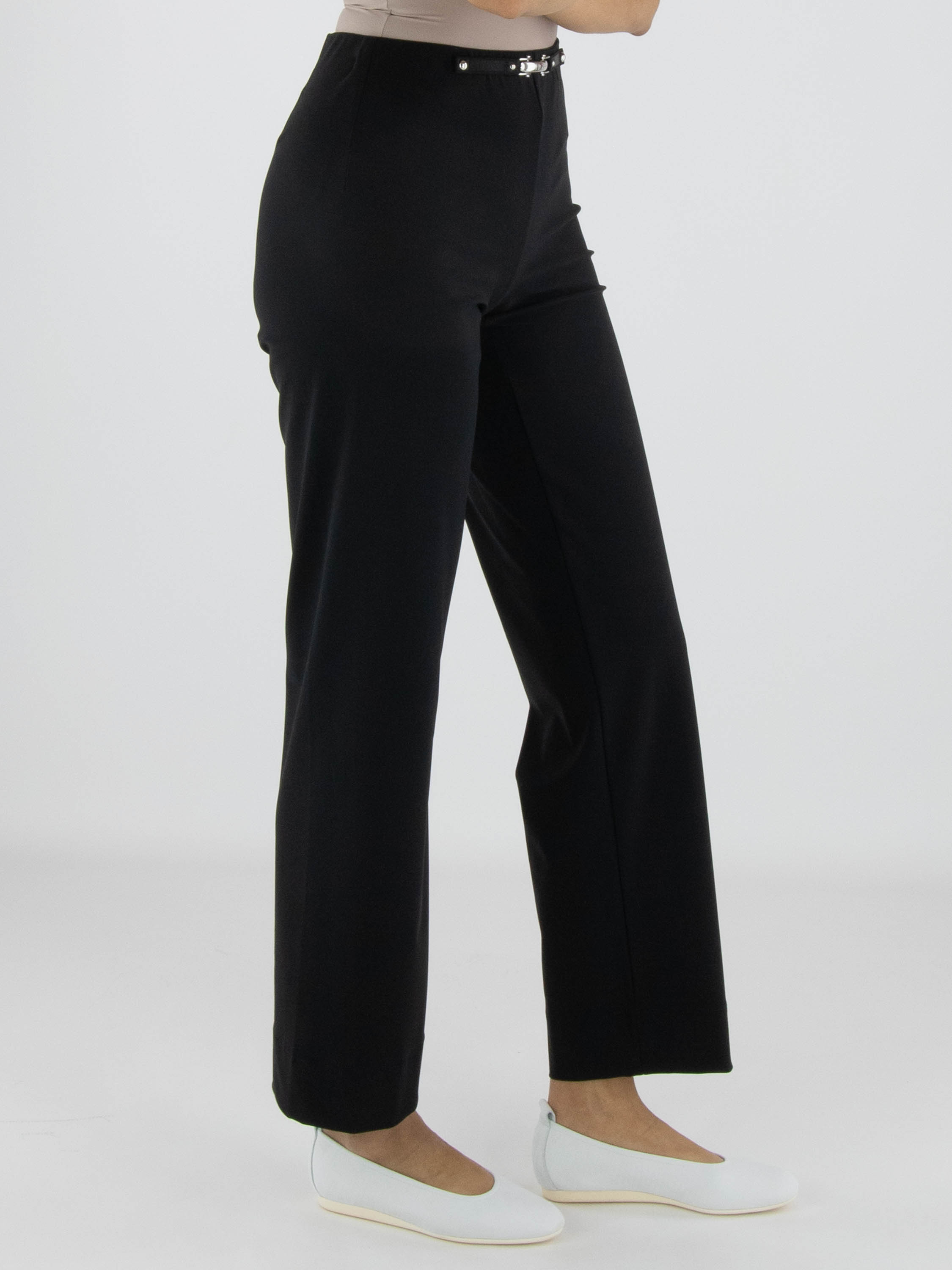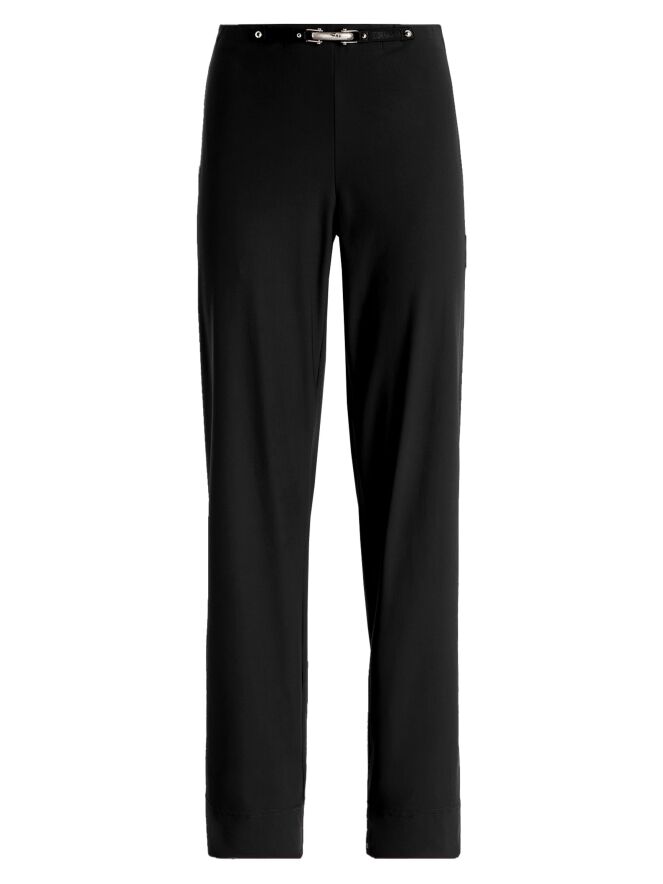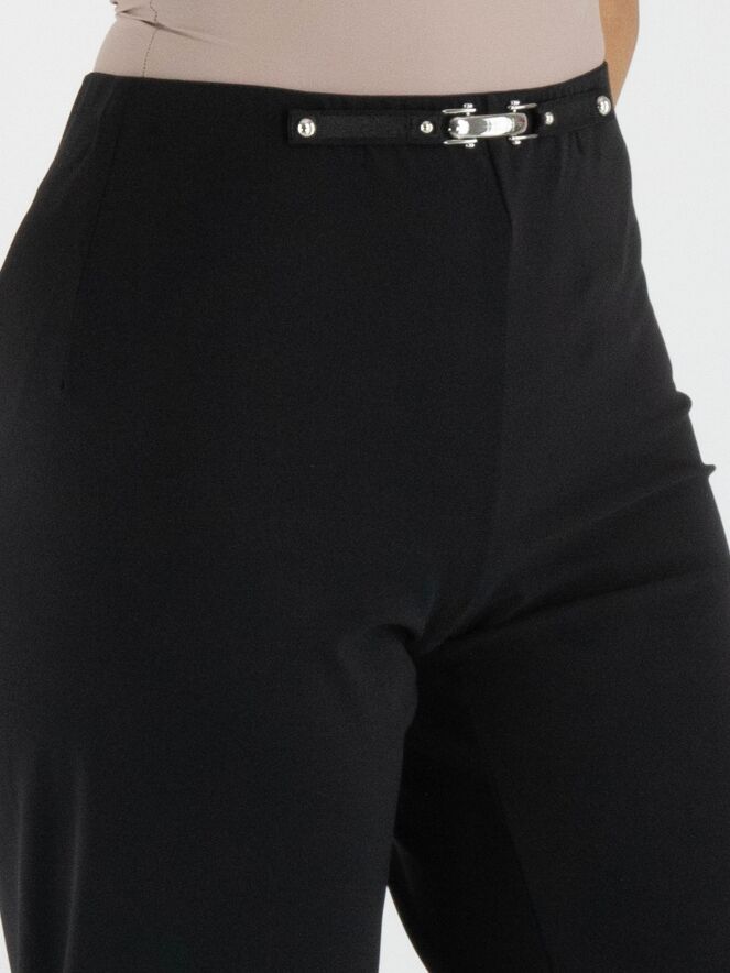 Trousers by High in black. The elastic waistband is accented at the front with a decorative elongated silver-tone bar, adding a refined detail. The straight-cut legs create a timeless and elegant silhouette. These exclusive designer trousers can be washed at 30 degrees.