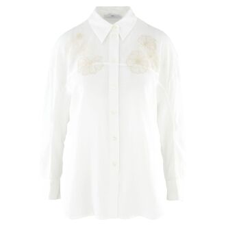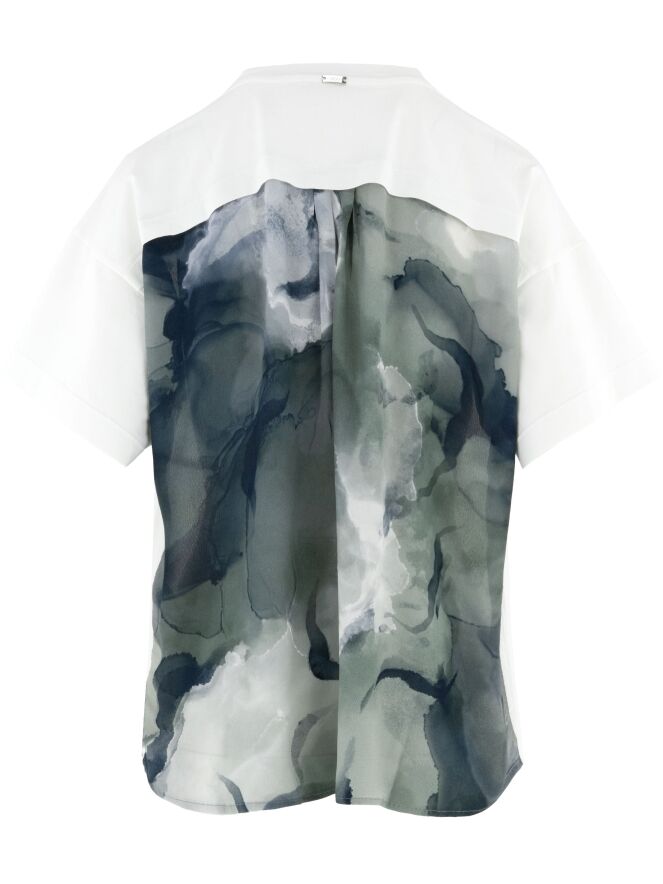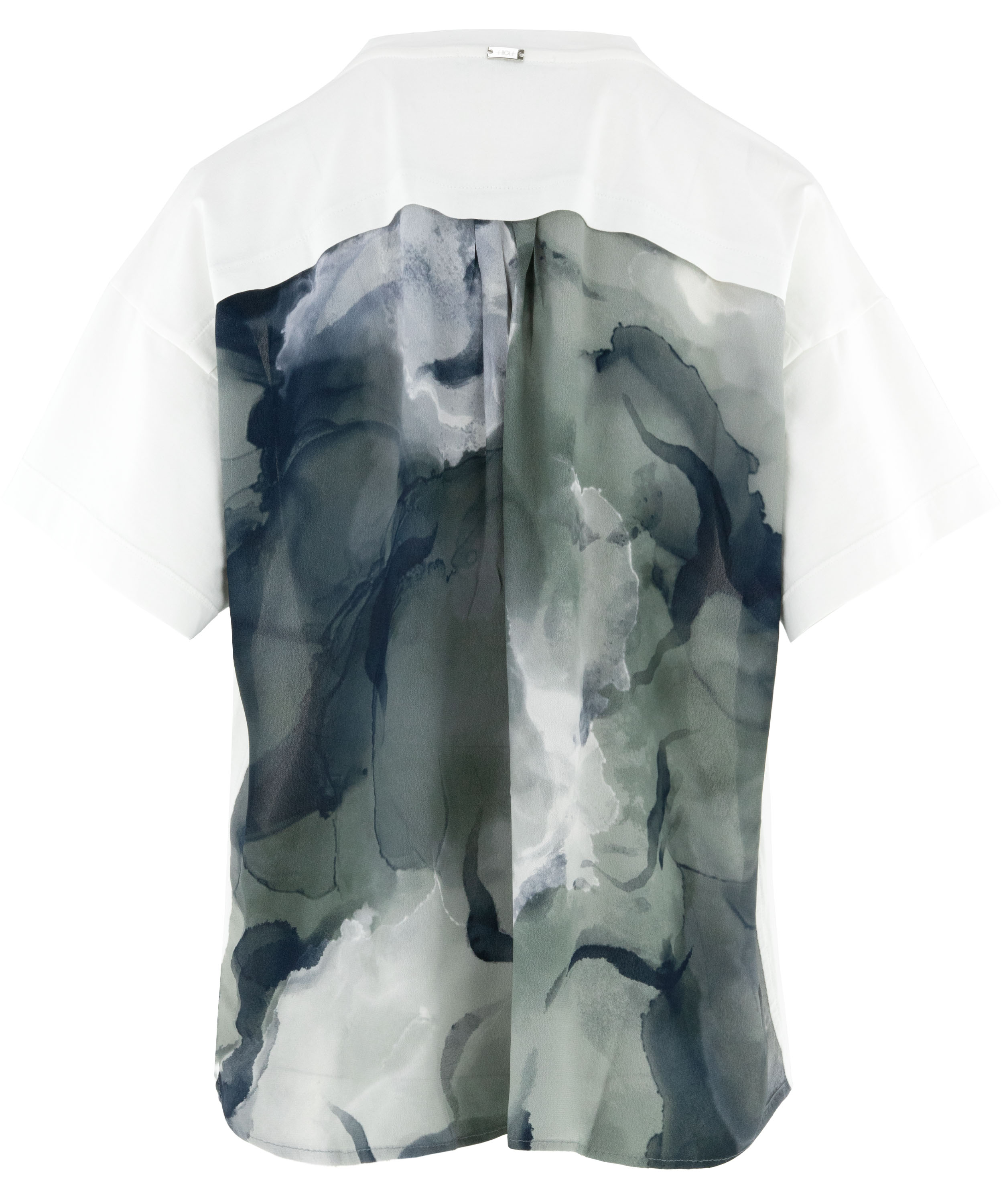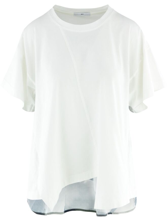 A shirt by High in cream white. At the back, the fabric is slightly transparent and features a graphic print in various shades of grey. At the front, a diagonal decorative seam is applied. This shirt can be hand-washed.
