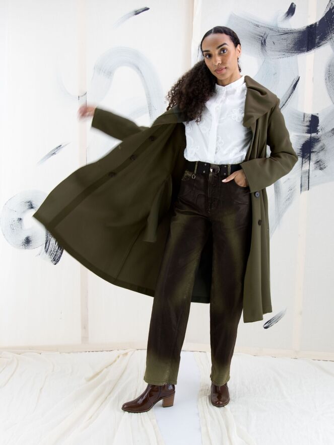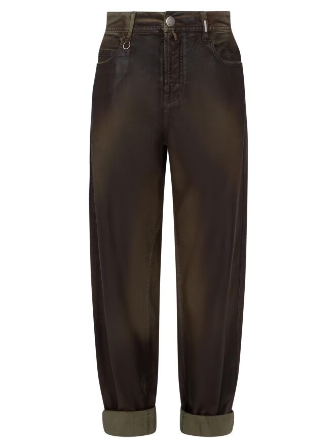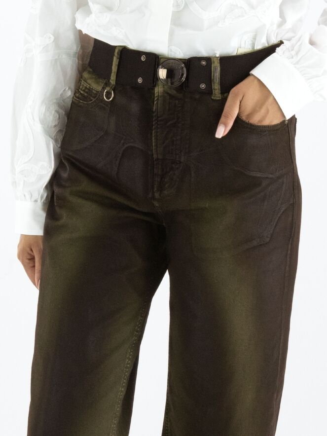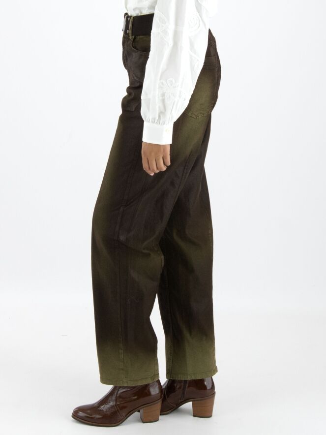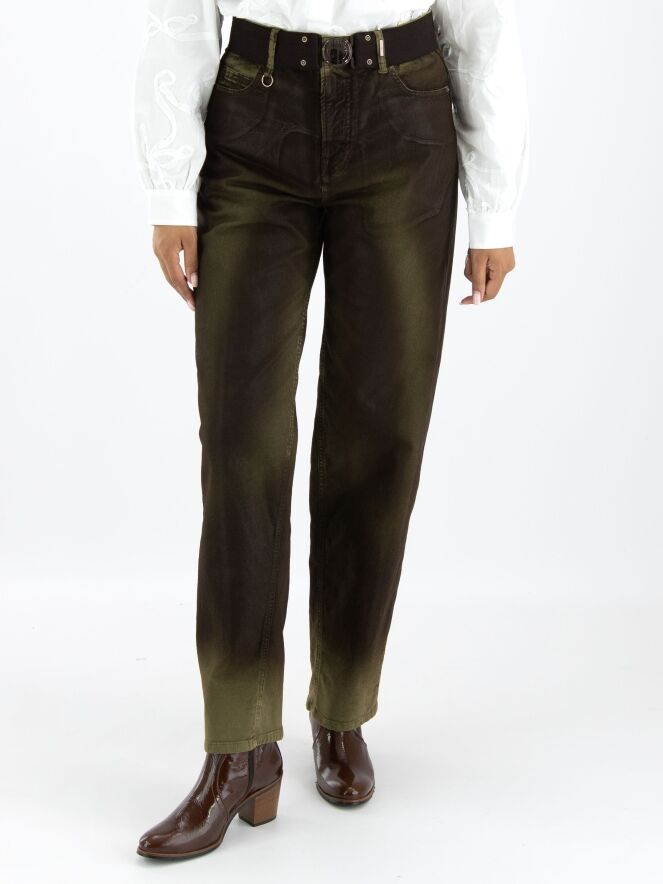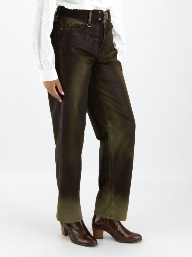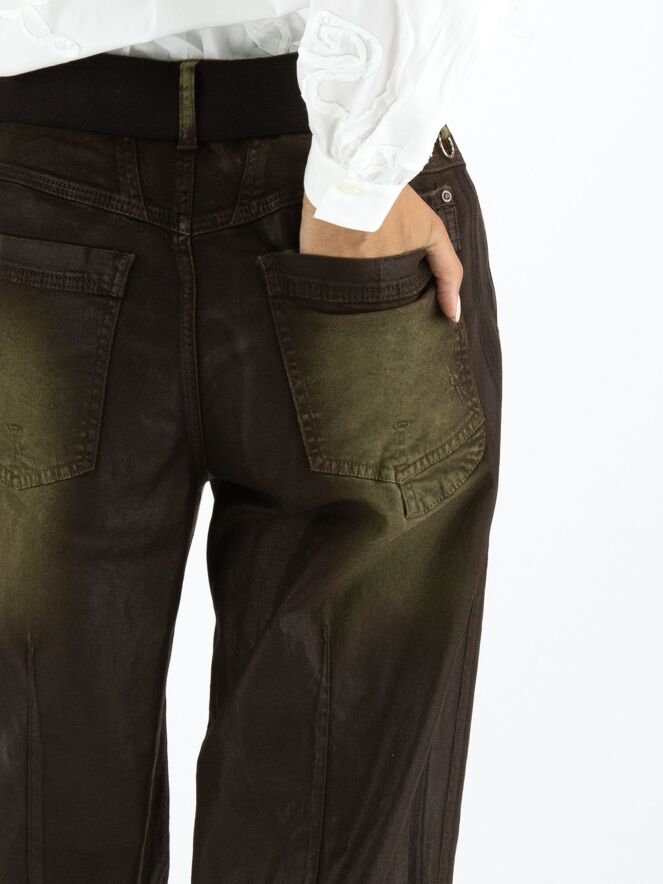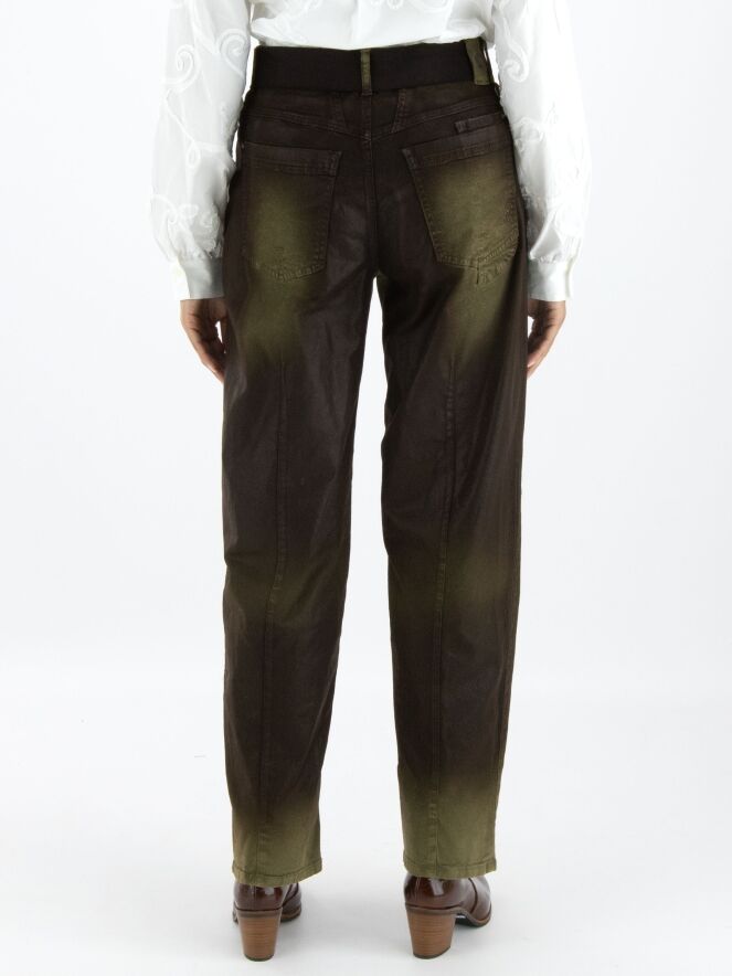 A luxurious waxed jeans with a gradient look due to the wash, featuring multiple shades of khaki. The waistband has a black elastic belt with a nickel-colored round buckle. The jeans are in a 5-pocket style and can be hand-washed.