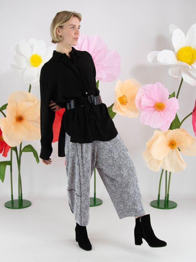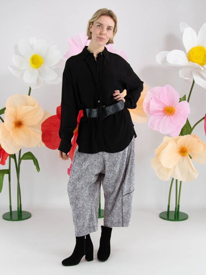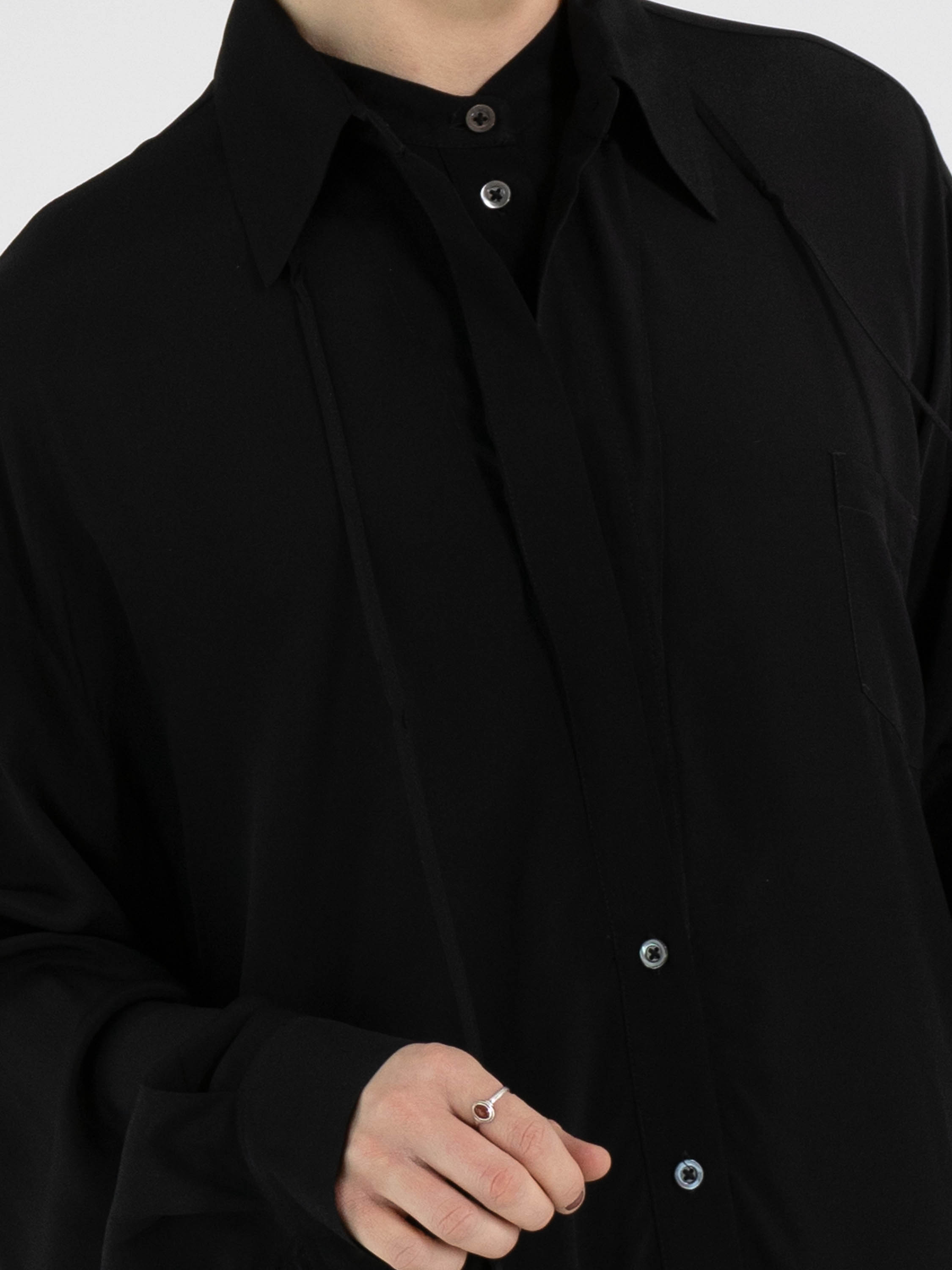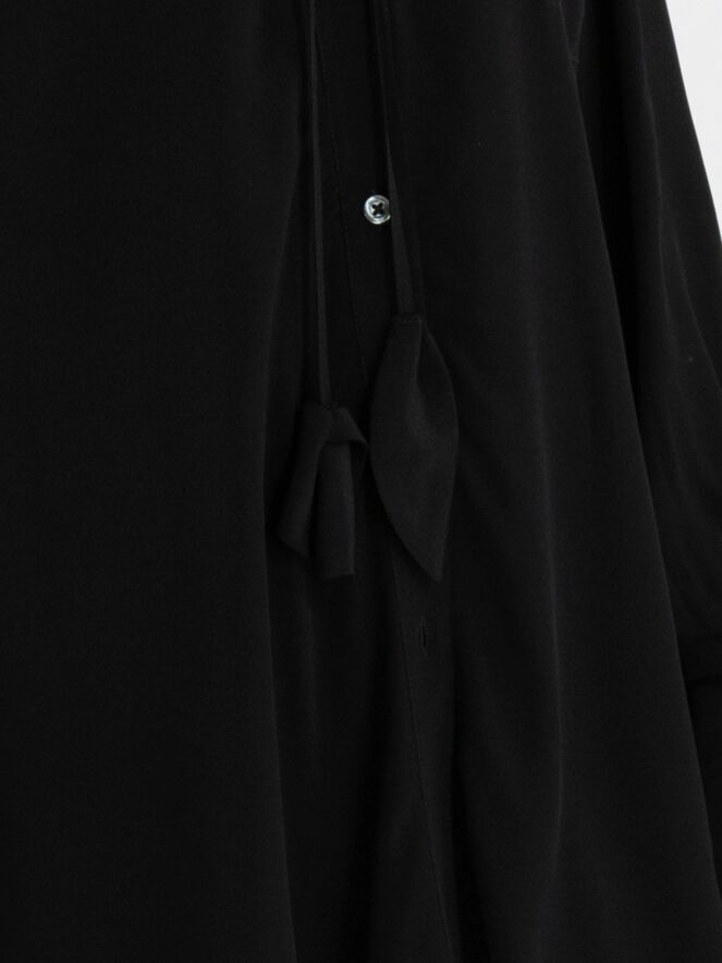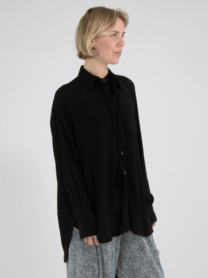 A loose-fitting blouse from High in black. The button fastening is concealed down to below the bust and regular from that point onward. From the right side of the neckline runs a ribbon with a drop-shaped detail at the end. At the bottom, there is a small slit on both sides. This blouse can be hand-washed.
