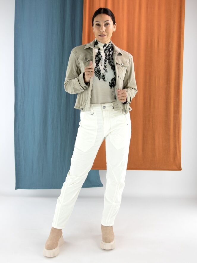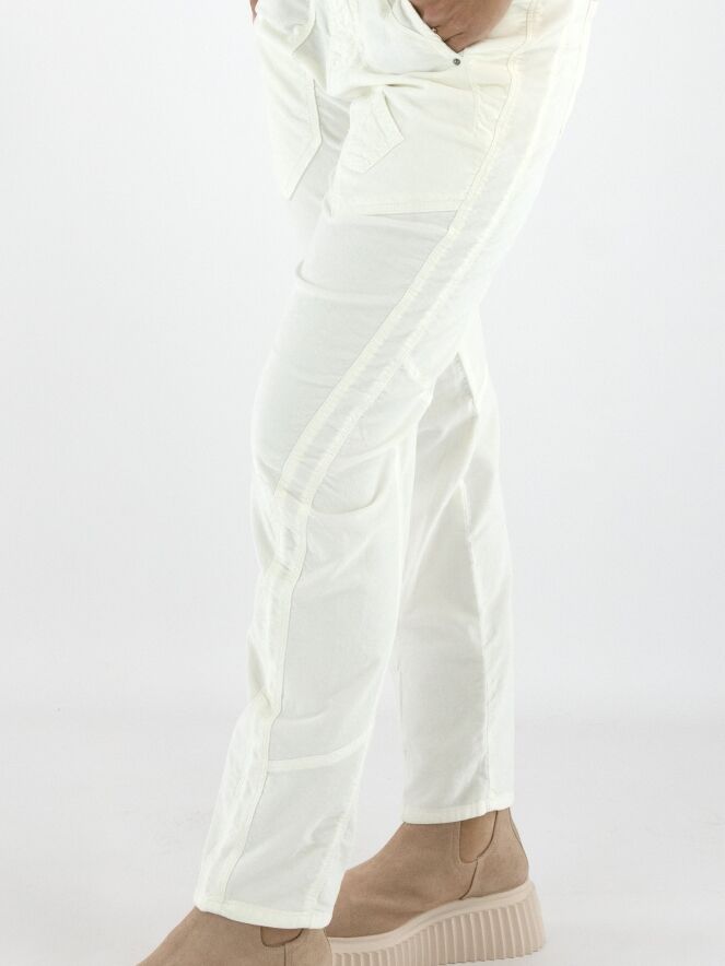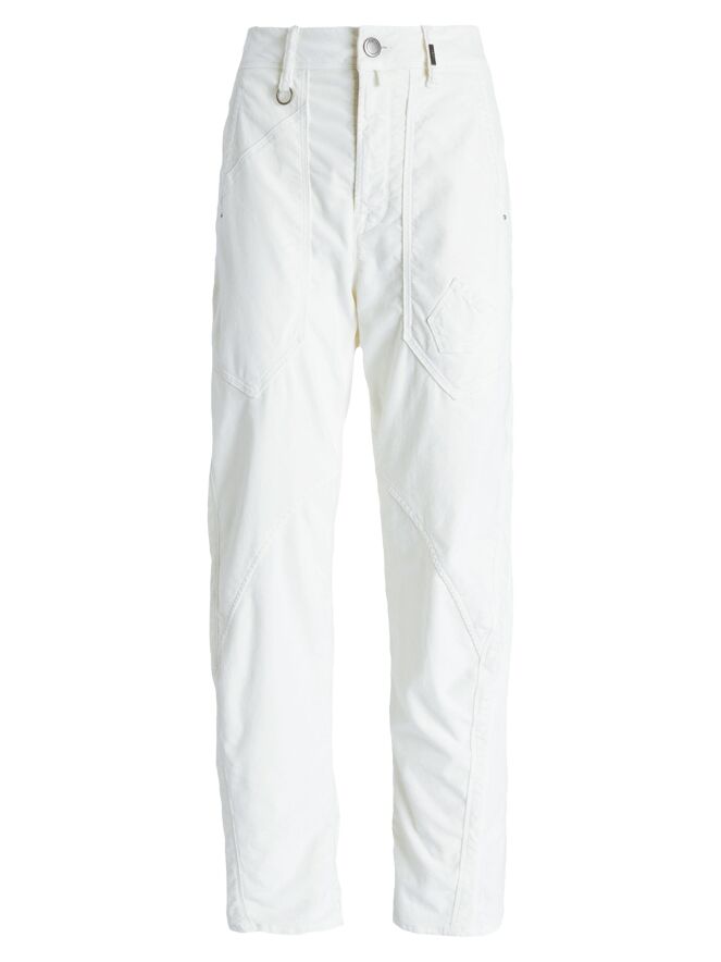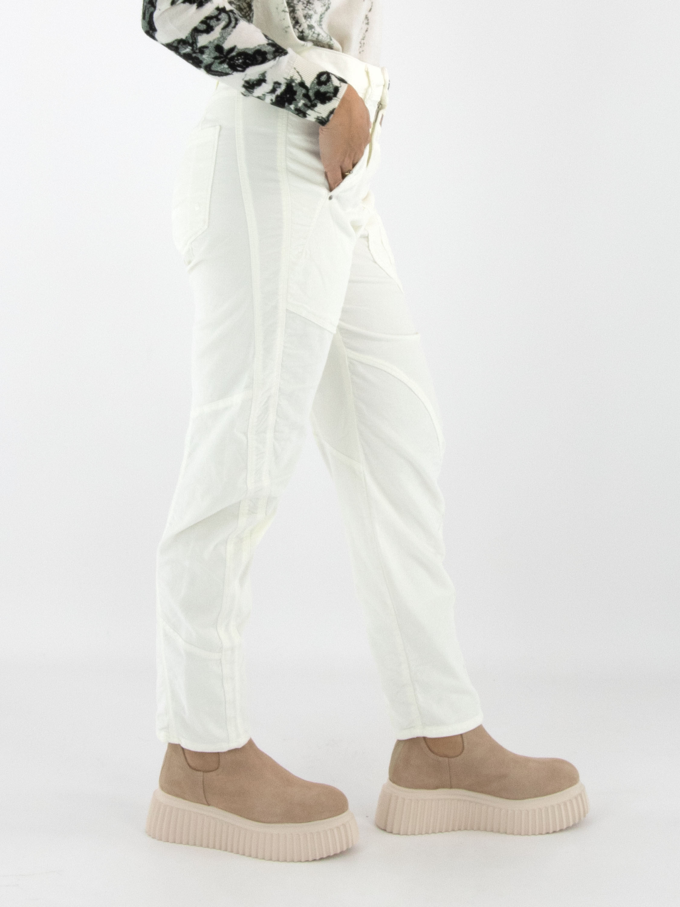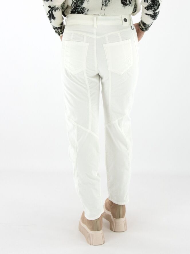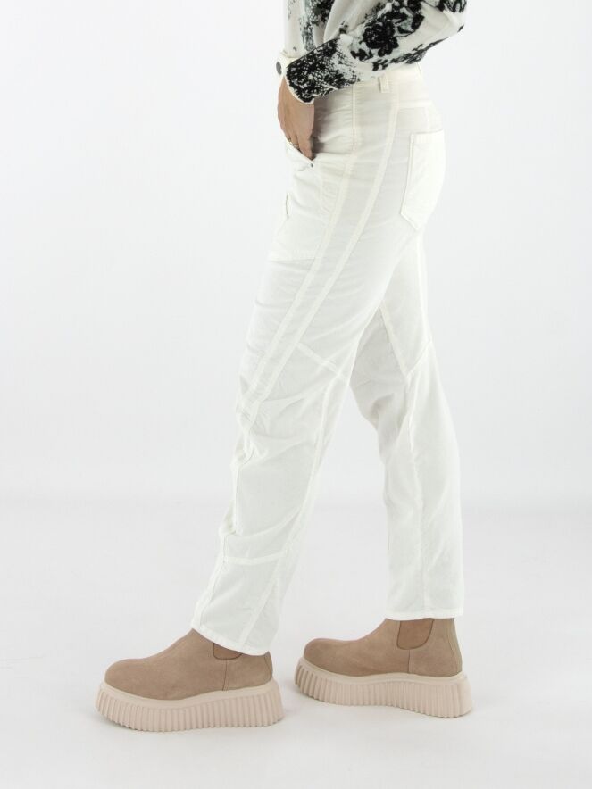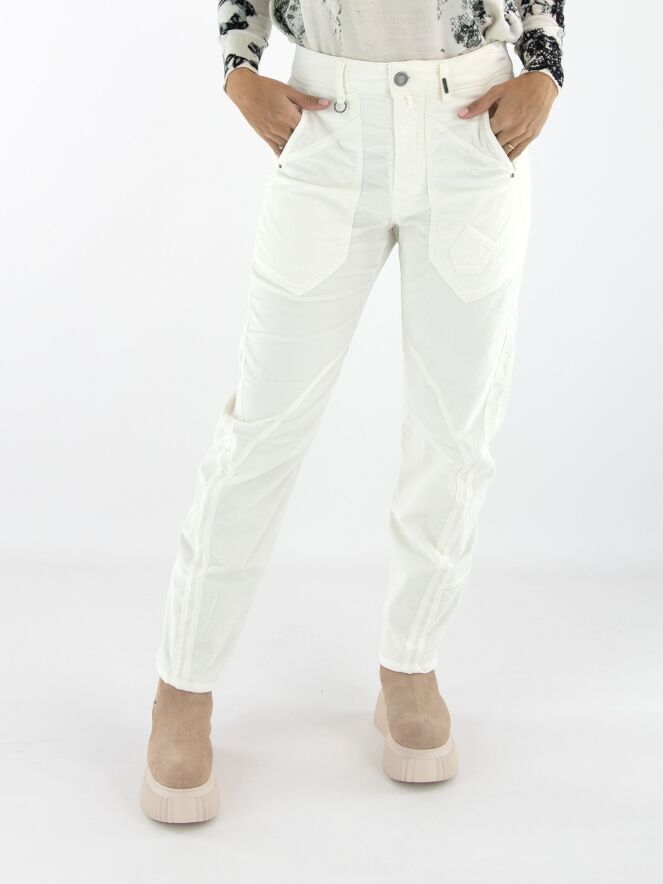 Trousers from High in a soft cotton velour quality in off-white. The design features slit pockets, with a small decorative extra pocket added on the left side. These trousers can be washed at 30 degrees.