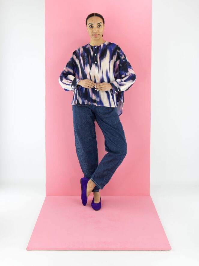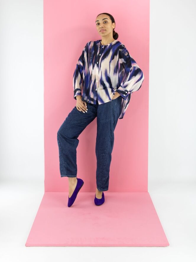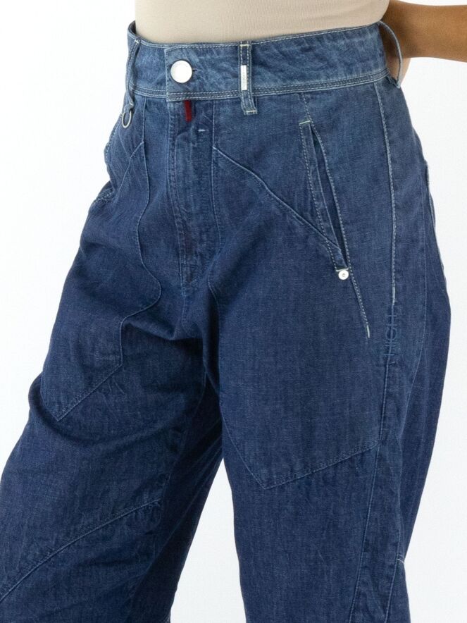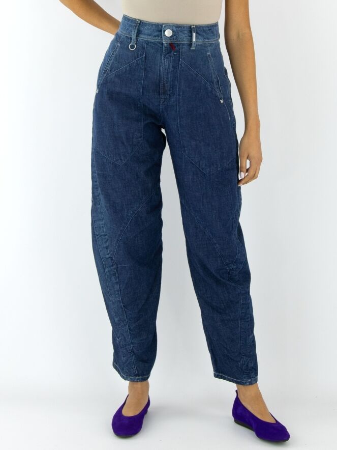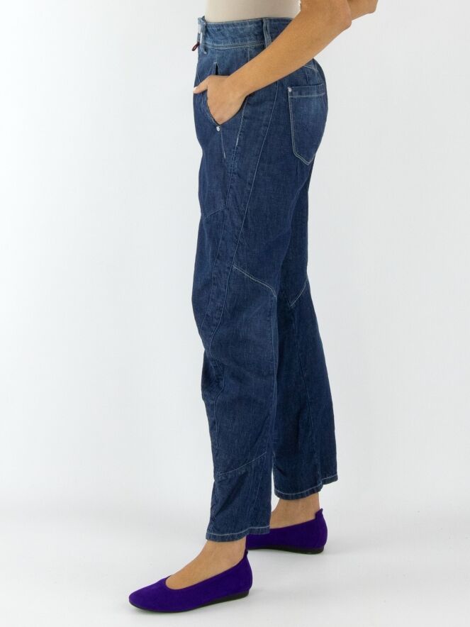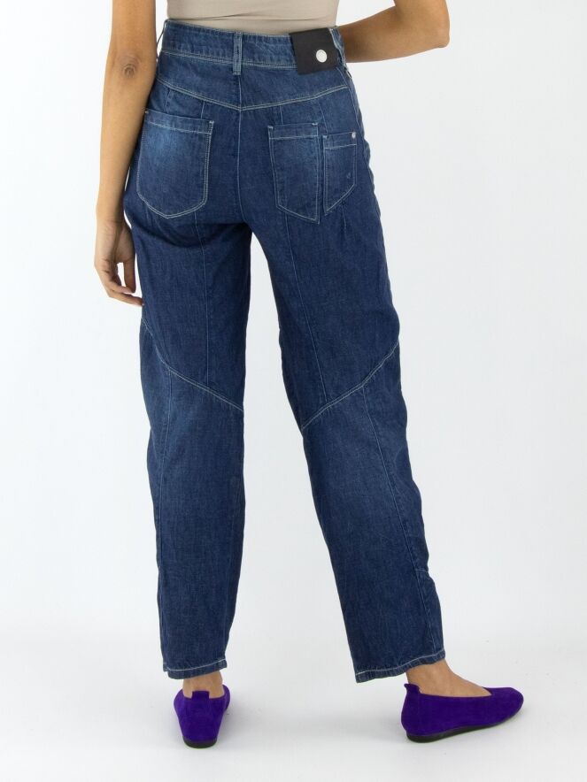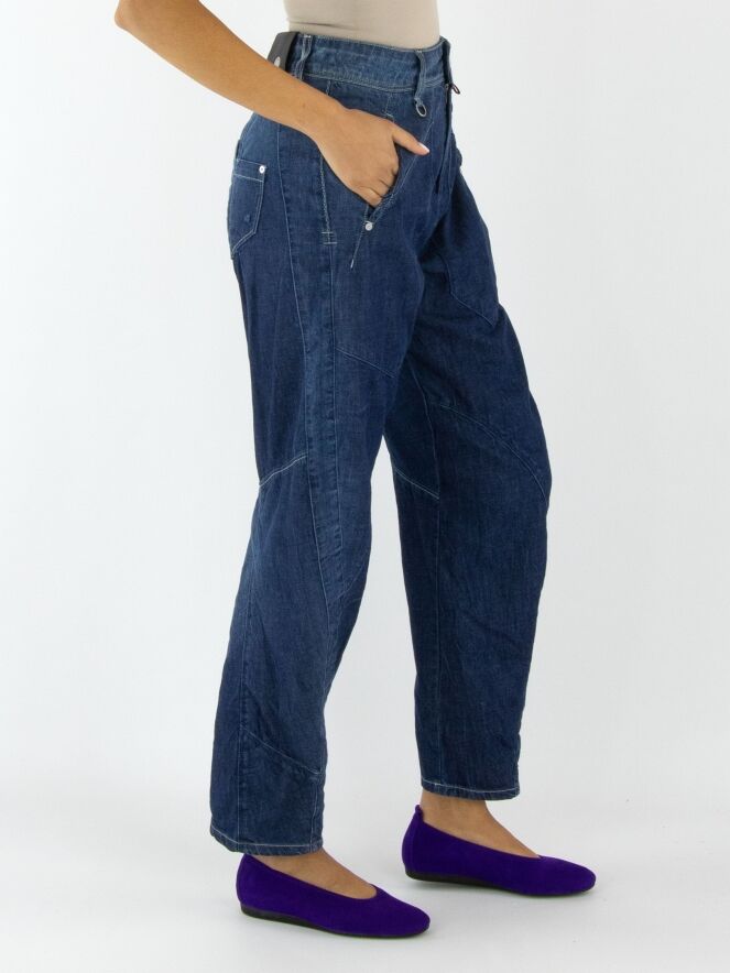 Jeans from High in a soft quality in a dark denim colour. The jeans have a creased look and multiple diagonal stitching. At the back, one of the pockets is decoratively split in two. The pockets on the front are very large. These jeans may be washed at 30 degrees.