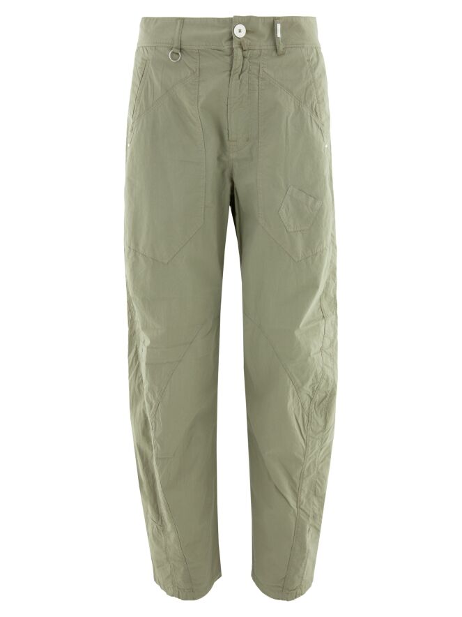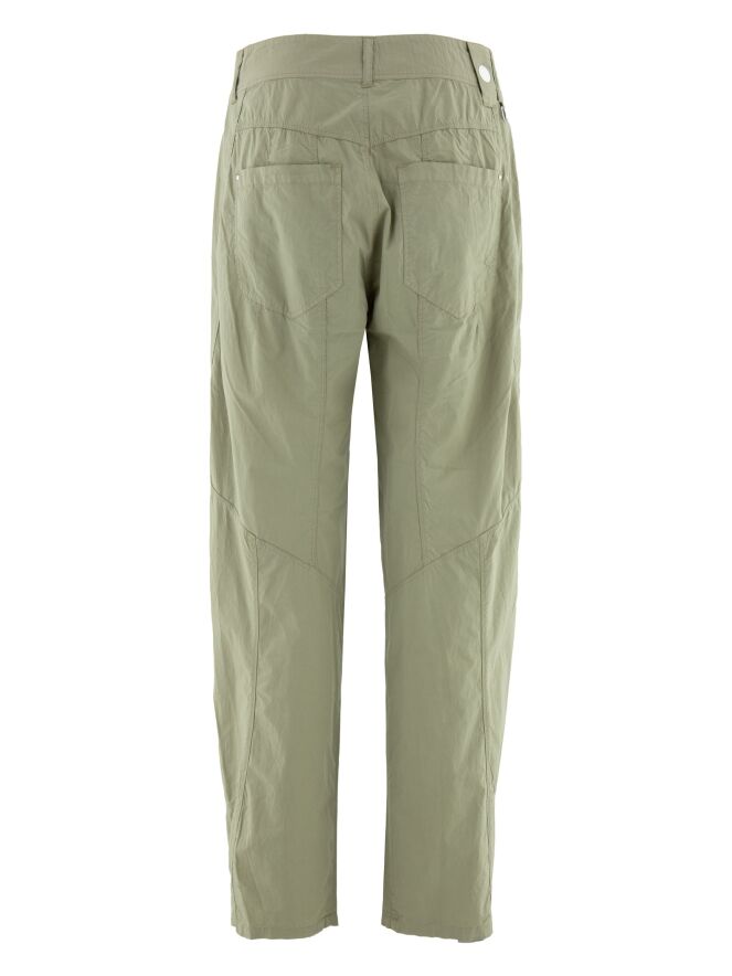 Trousers by High in a lightweight summer cotton quality in olive green. On the left front pocket, a small decorative pocket is applied with diagonal stitching. The trousers feature side pockets and can be washed at 30 degrees.