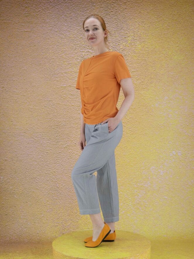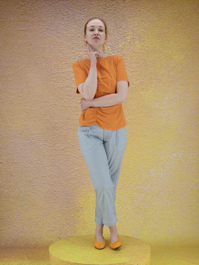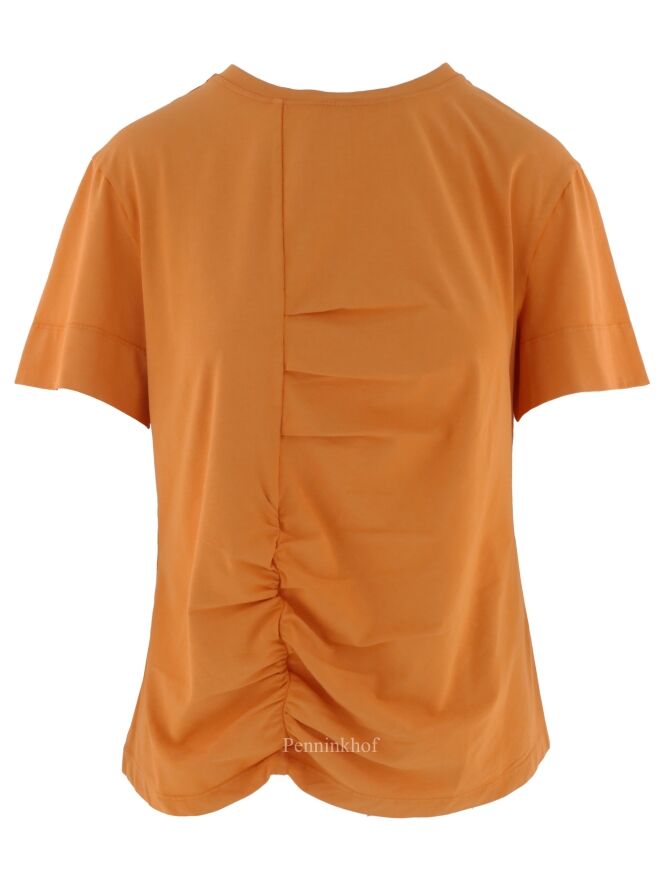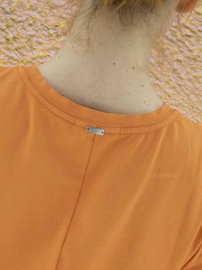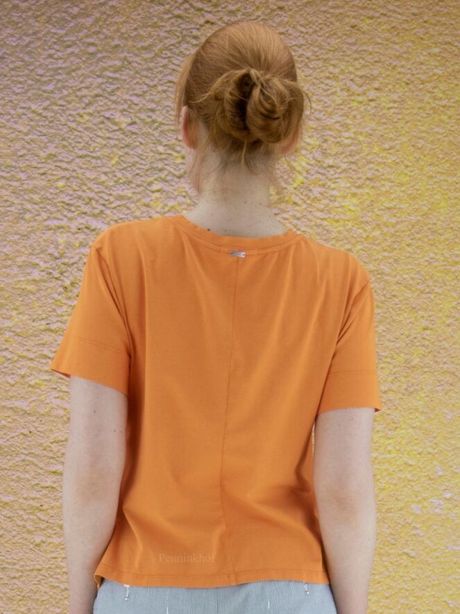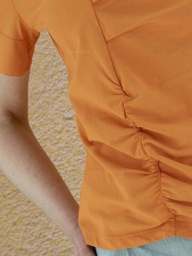 A shirt from High in the color orange. The shirt has short sleeves and a round neckline. On the front of the shirt, left of the center, is a full-length stitching seam with several decorative pleats. This shirt can be hand washed.