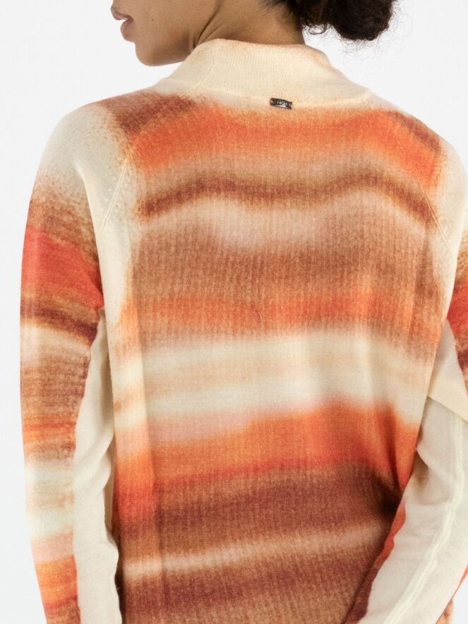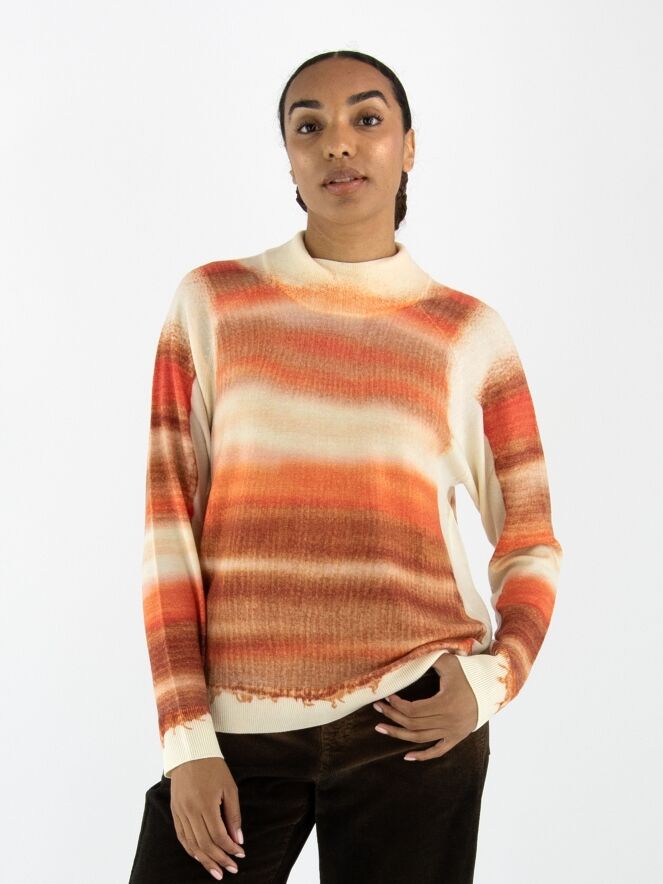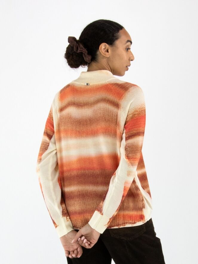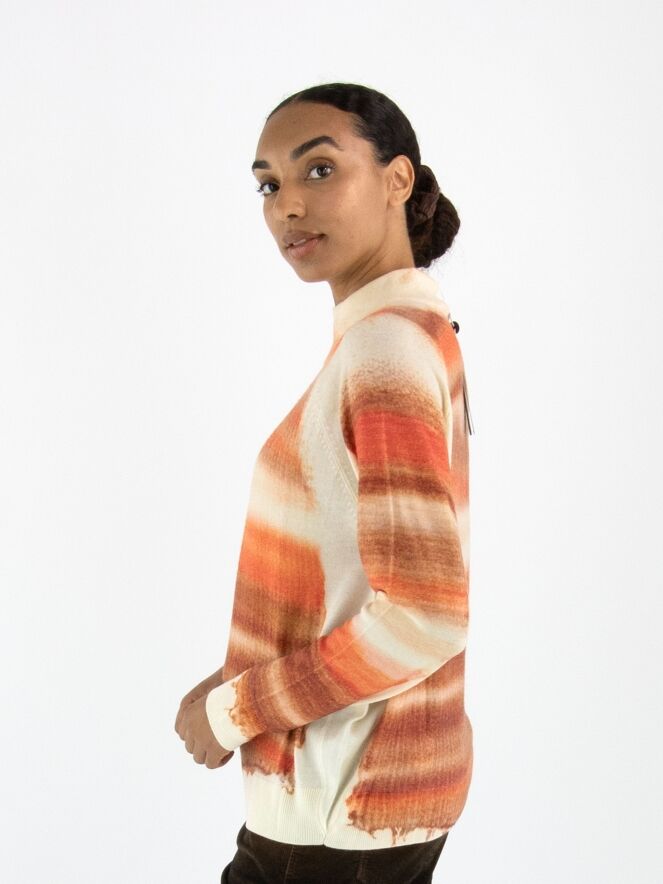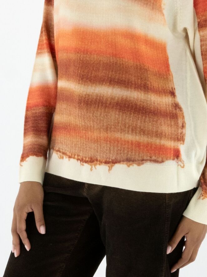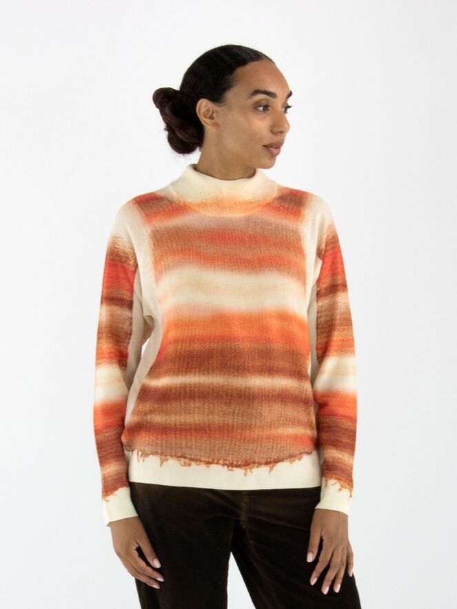 A pullover by High featuring a printed dégradé in various shades of red and off-white. The neckline is finished with a finely ribbed tricot turtleneck. The cuffs and hemline also have fine ribbed tricot borders. This pullover must not be washed.