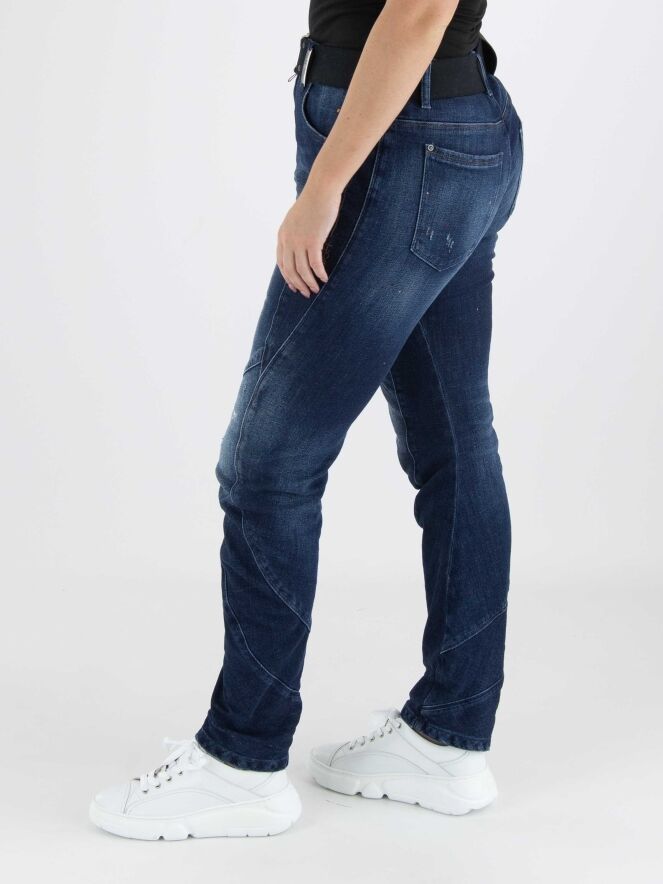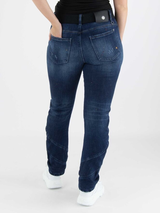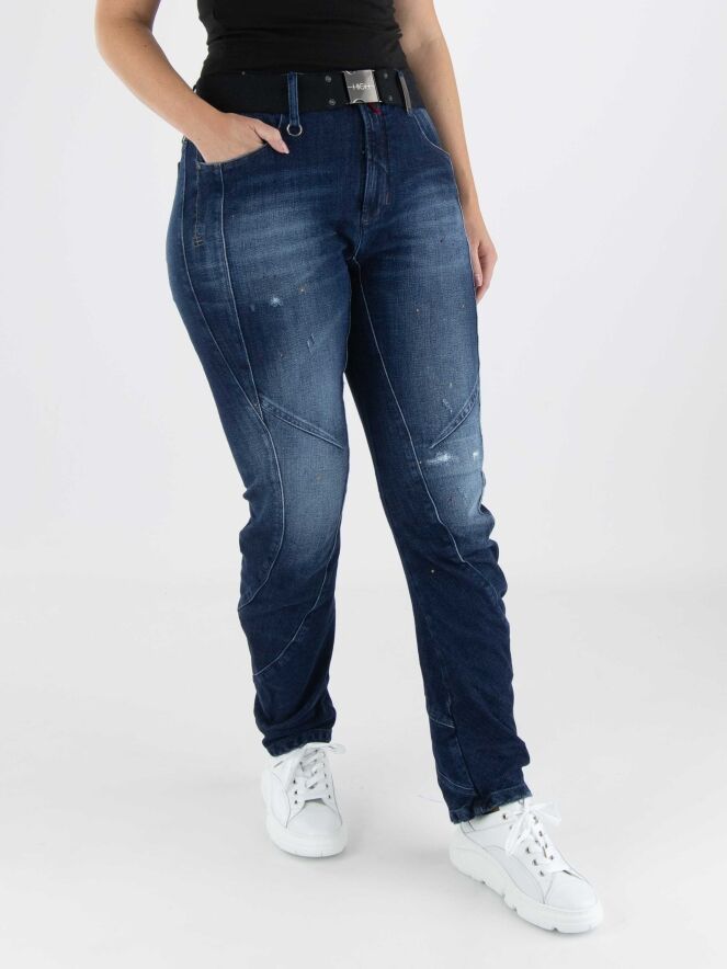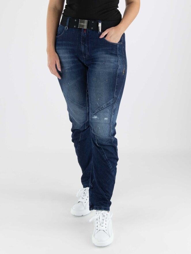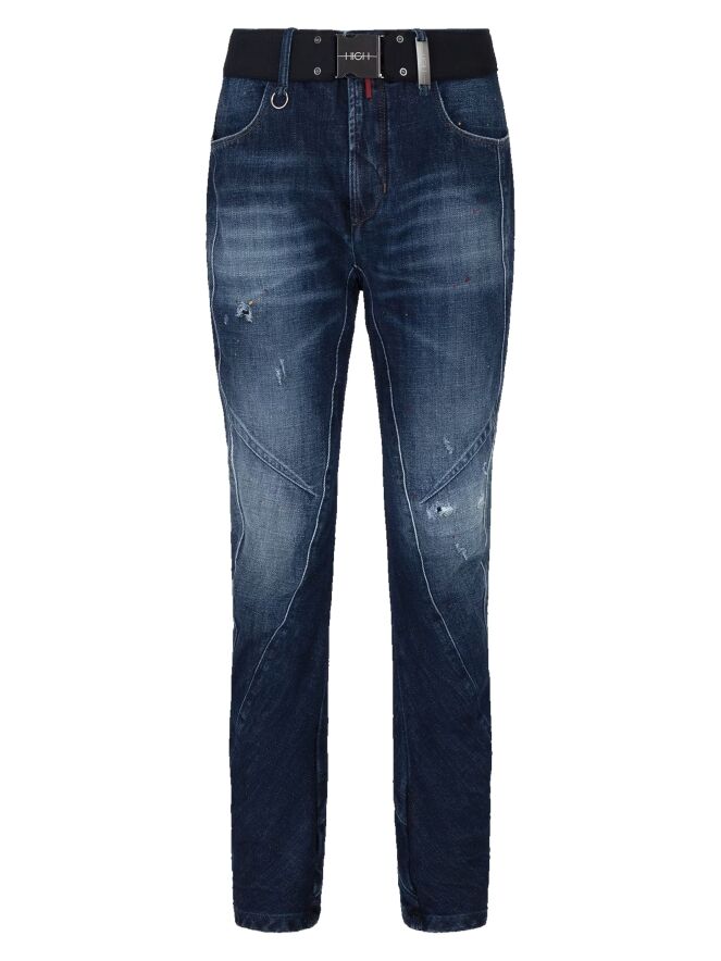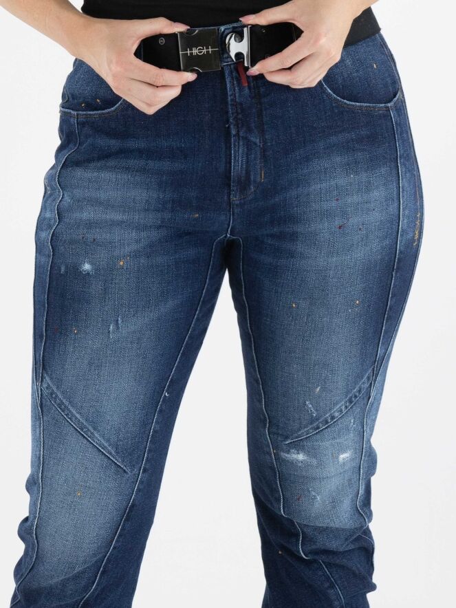 A washed jeans from High in a basic denim color, featuring decorative orange and red paint splatters and worn areas on the upper leg and around the knees. There is a wide cuff at the bottom. The waist features an elastic belt with a square nickel-colored buckle. These jeans can be washed at 30 degrees.