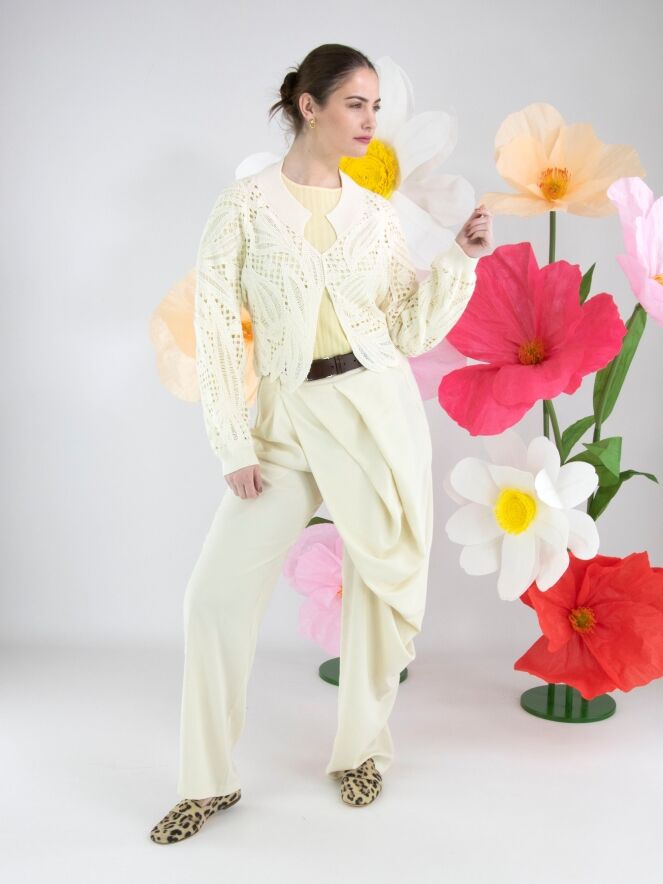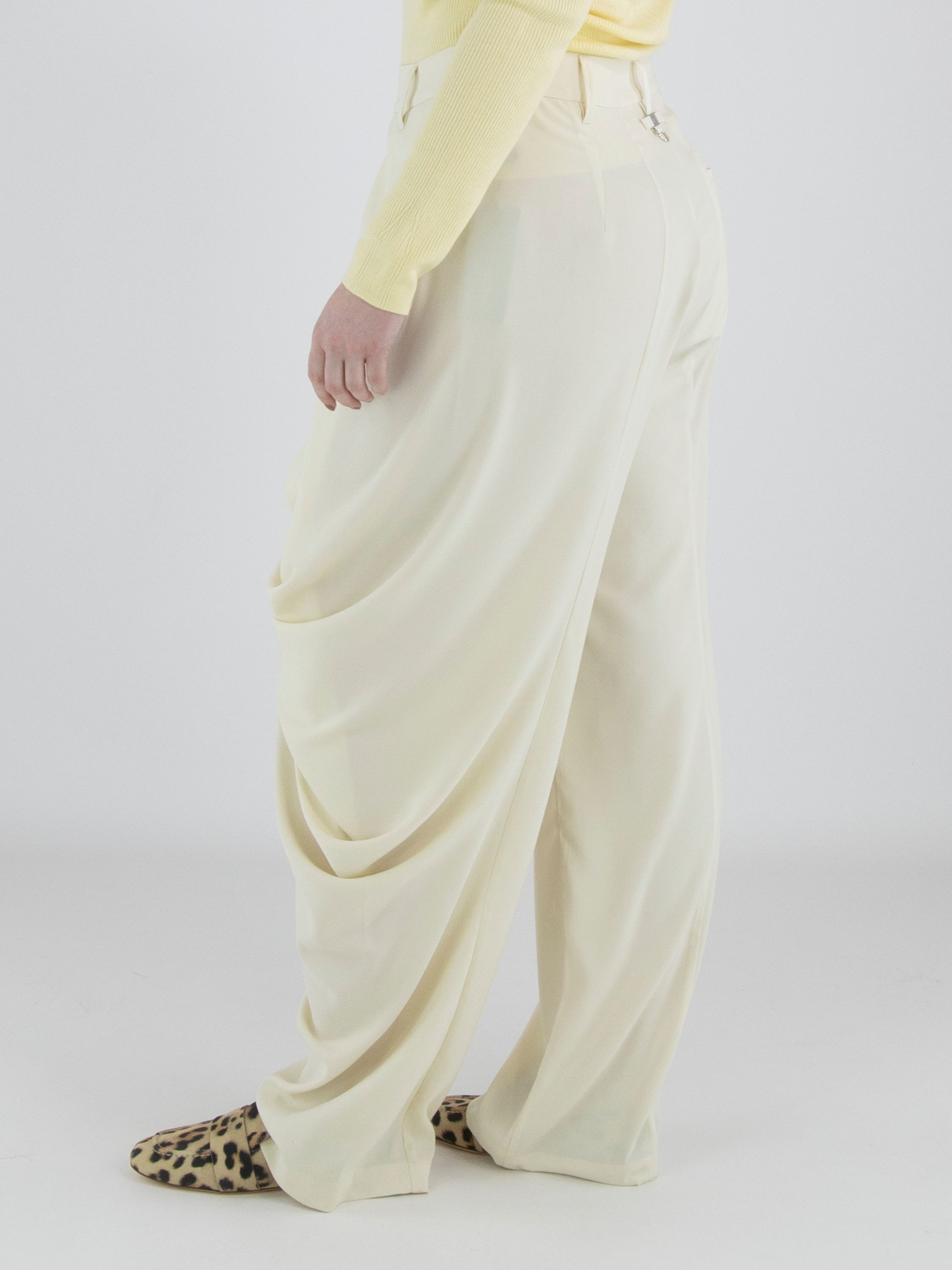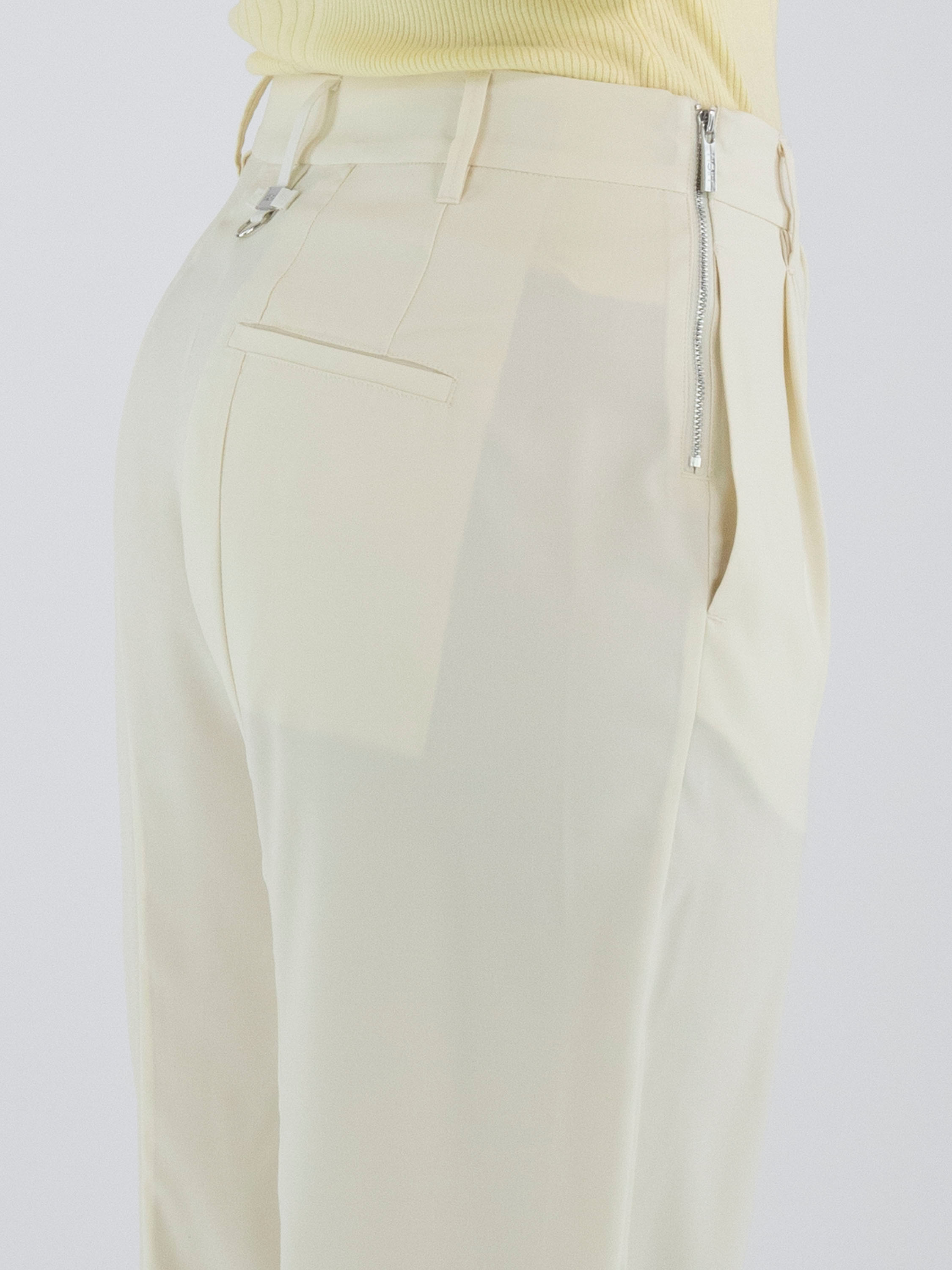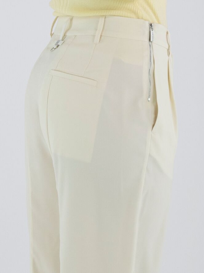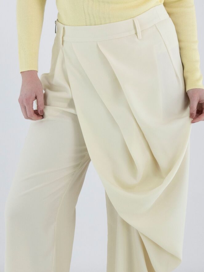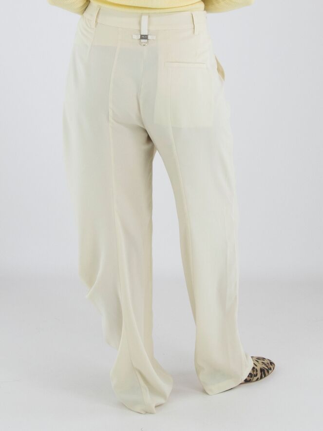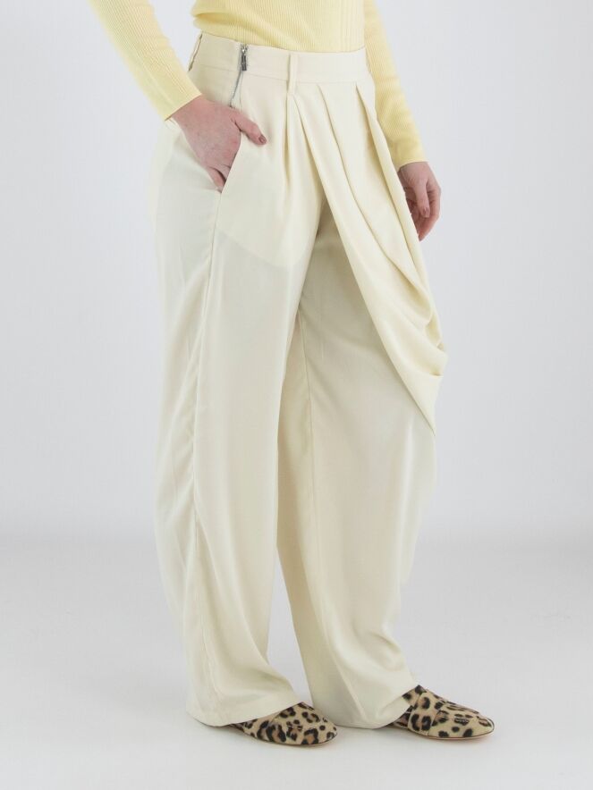 A crepe trouser by High in a soft vanilla shade. At the front, multiple diagonal pleats originate from the waistband, creating a draped effect on the right leg. A zip fastening is positioned at the left side of the waist. The legs are straight-cut. These trousers can be hand-washed.
