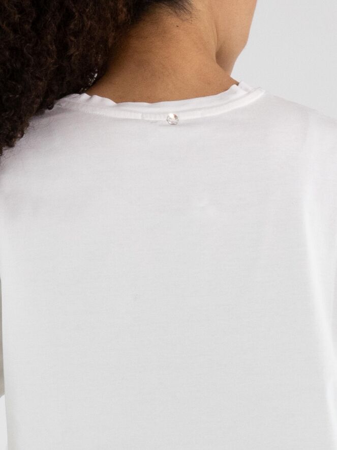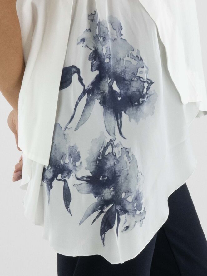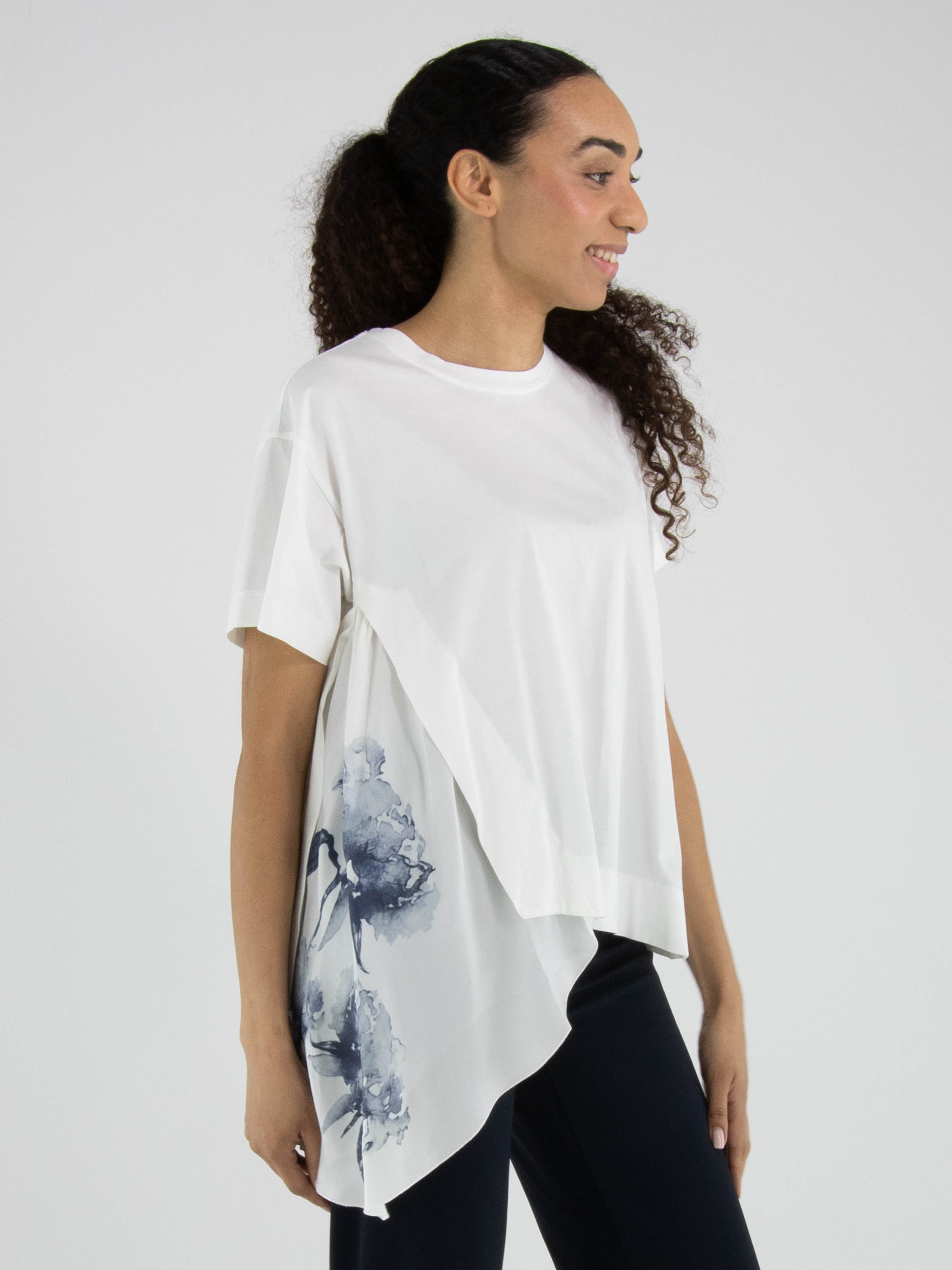 Shirt by High in off-white. An additional panel in matte satin with a graphic orchid print in multiple shades of navy blue is inserted along the right side, creating a bold and artistic contrast. Designed with a round neckline and short sleeves, the piece is enhanced by several diagonal seams that underline its contemporary character. This exclusive designer shirt should be hand-washed.