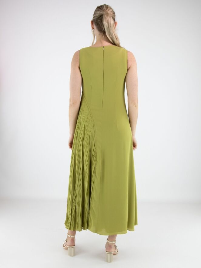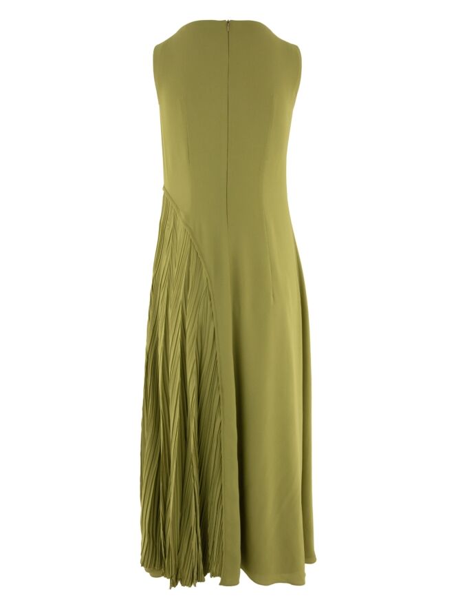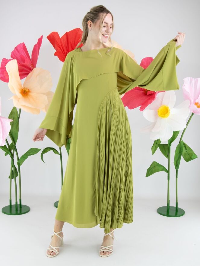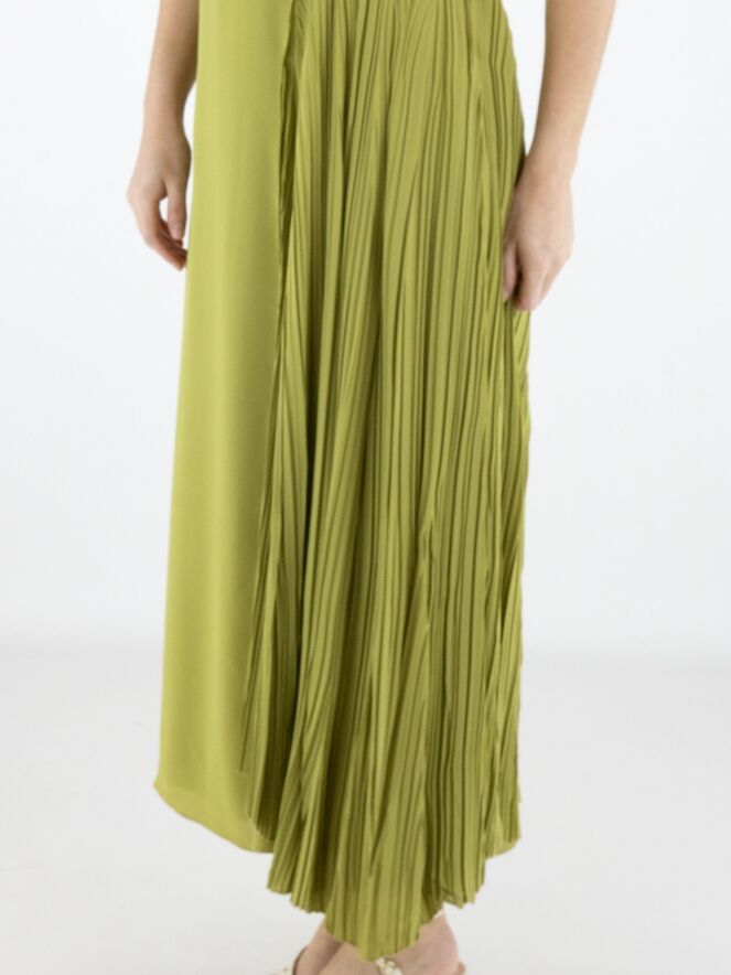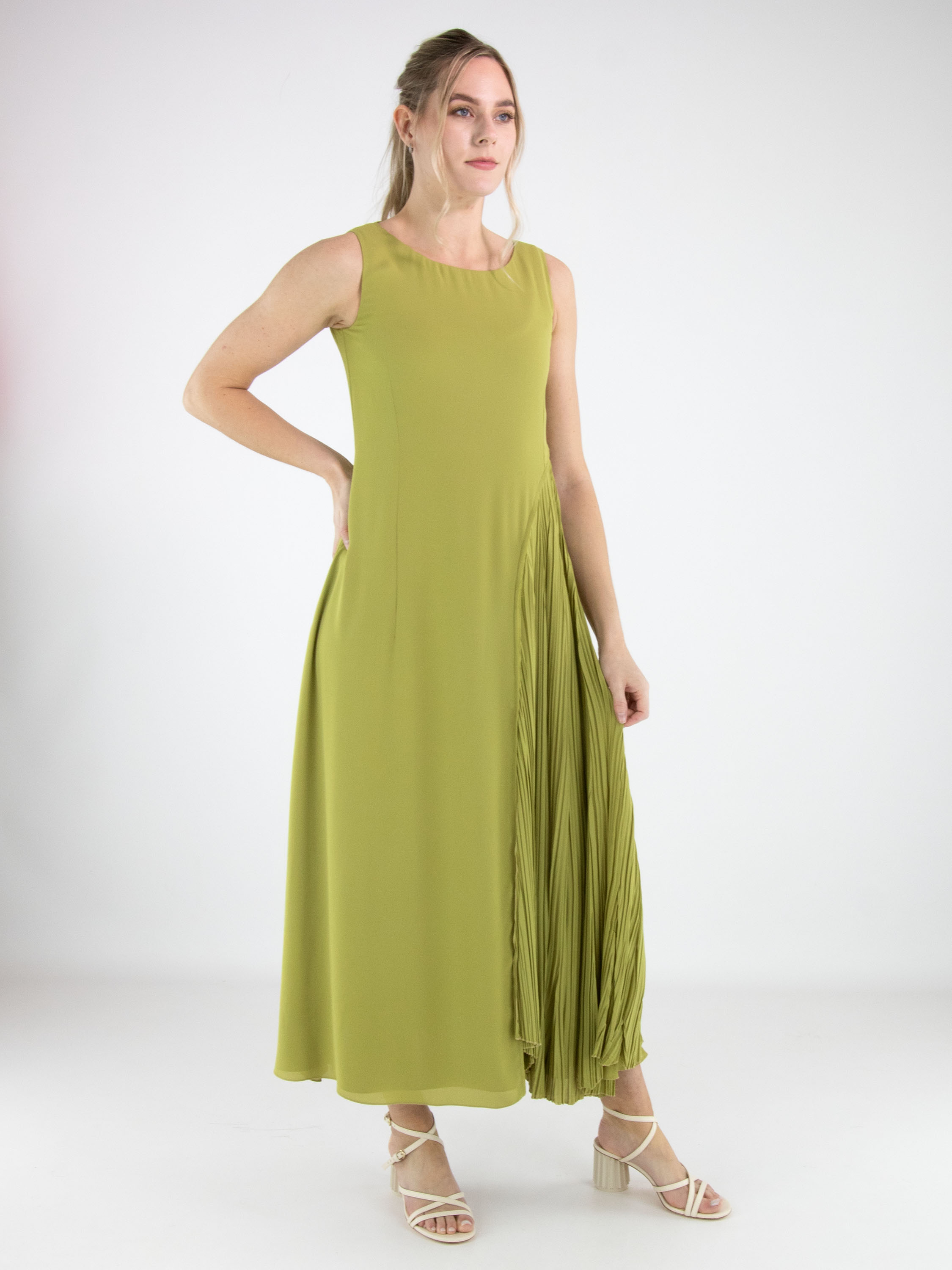 Dress by High in a fresh pistachio green shade. The design consists of two layers of fabric: the lower layer falls straight, creating a clean base, while the upper layer flares gently into an A-line from the waist. On the left side, the upper layer features a finely pleated structure from the waist down with a deep slit reaching the knee, adding movement and elegance. This dress should be hand-washed.
