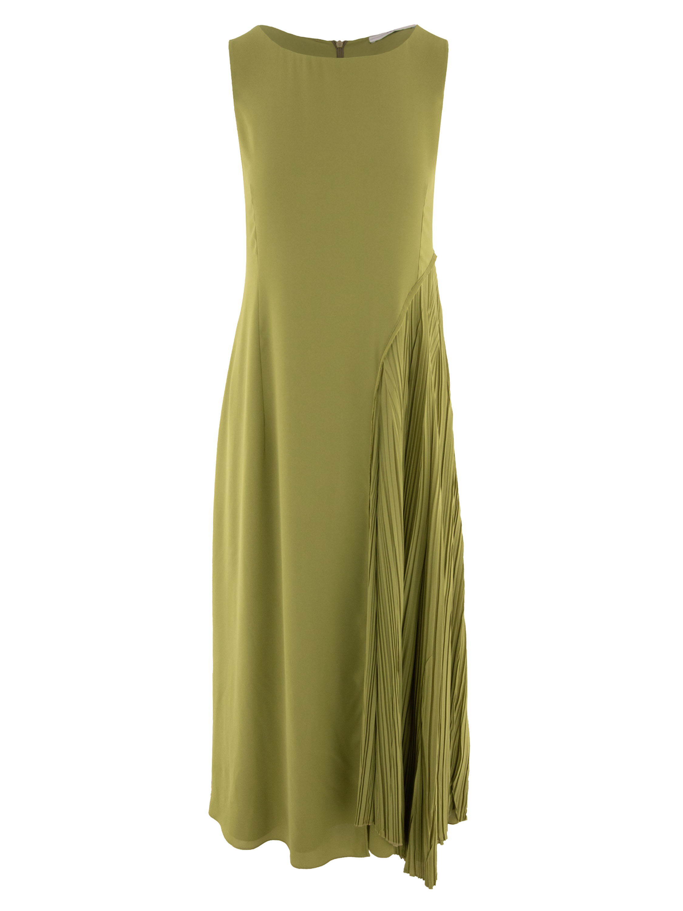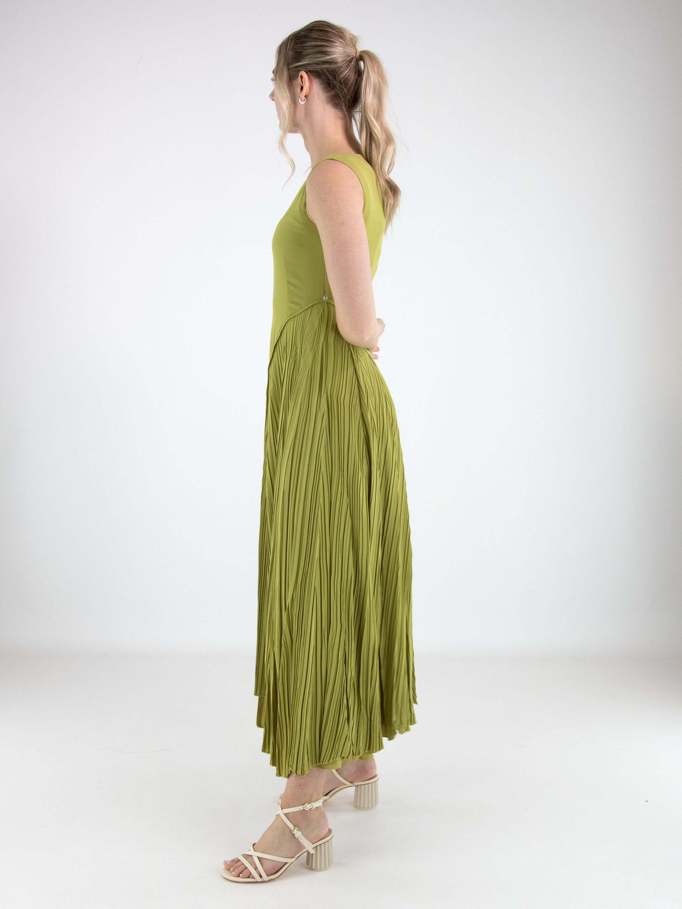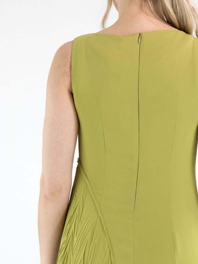 Dress by High in a fresh pistachio green shade. The design consists of two layers of fabric: the lower layer falls straight, creating a clean base, while the upper layer flares gently into an A-line from the waist. On the left side, the upper layer features a finely pleated structure from the waist down with a deep slit reaching the knee, adding movement and elegance. This dress should be hand-washed.