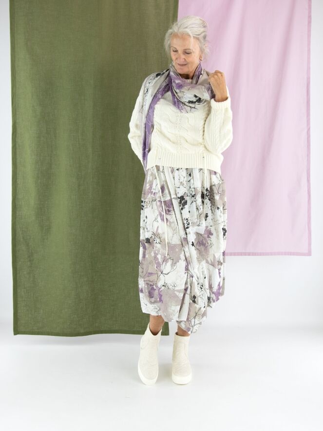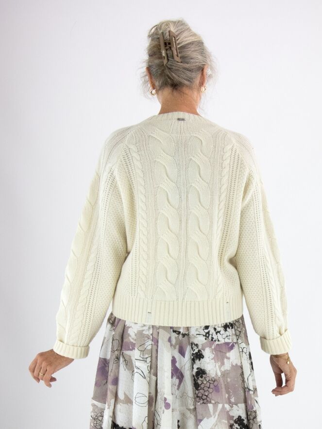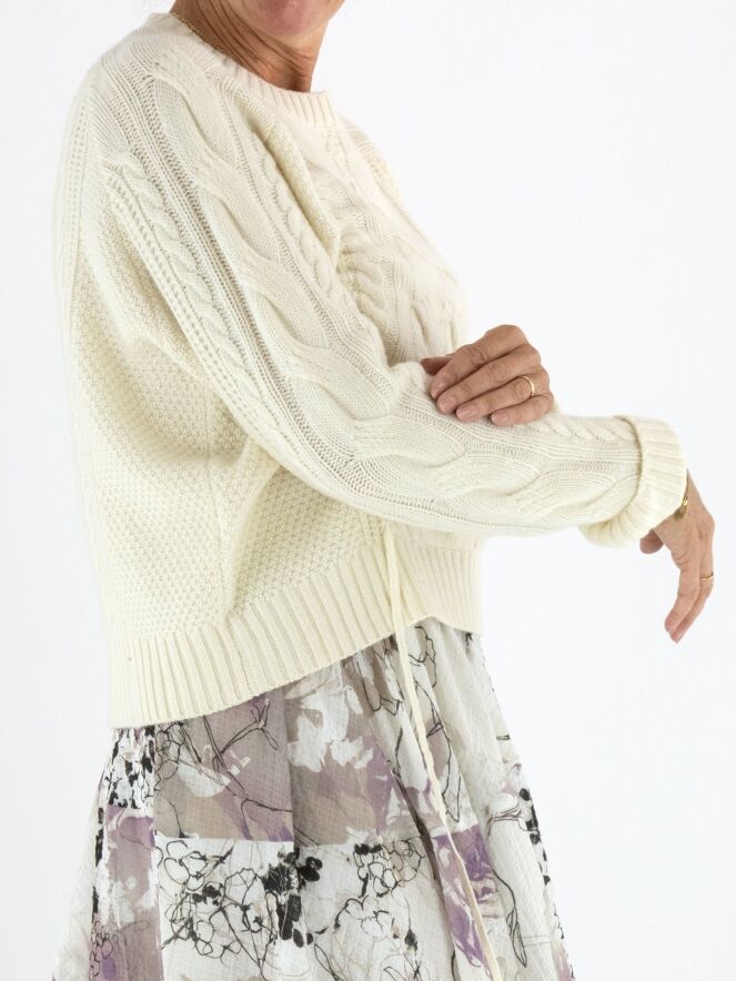 A luxurious cable-knit pullover from High in ivory. The pullover features a round neckline, and at the front, two ribbons extend from the pattern down to the hem. This pullover should be hand-washed.