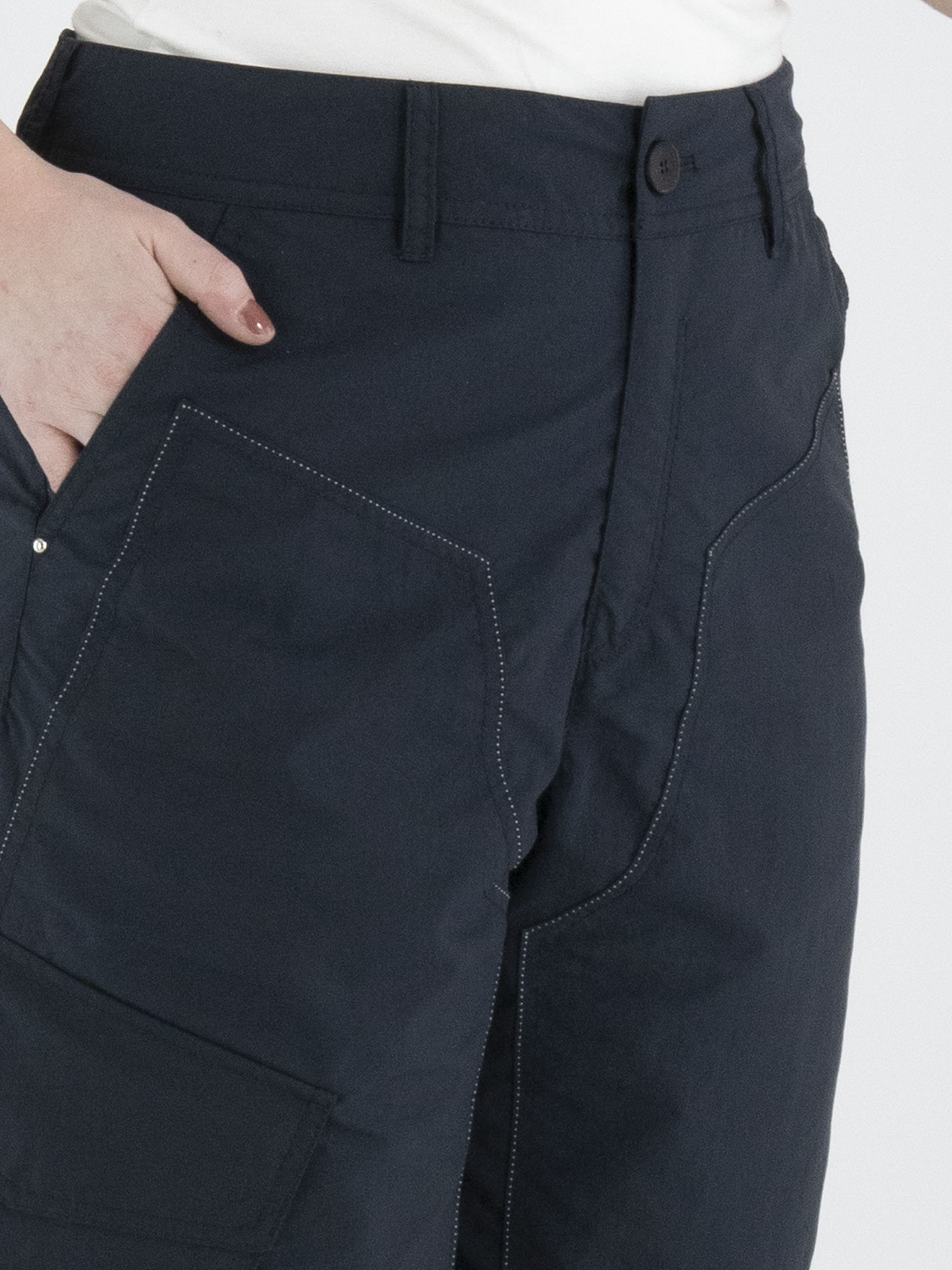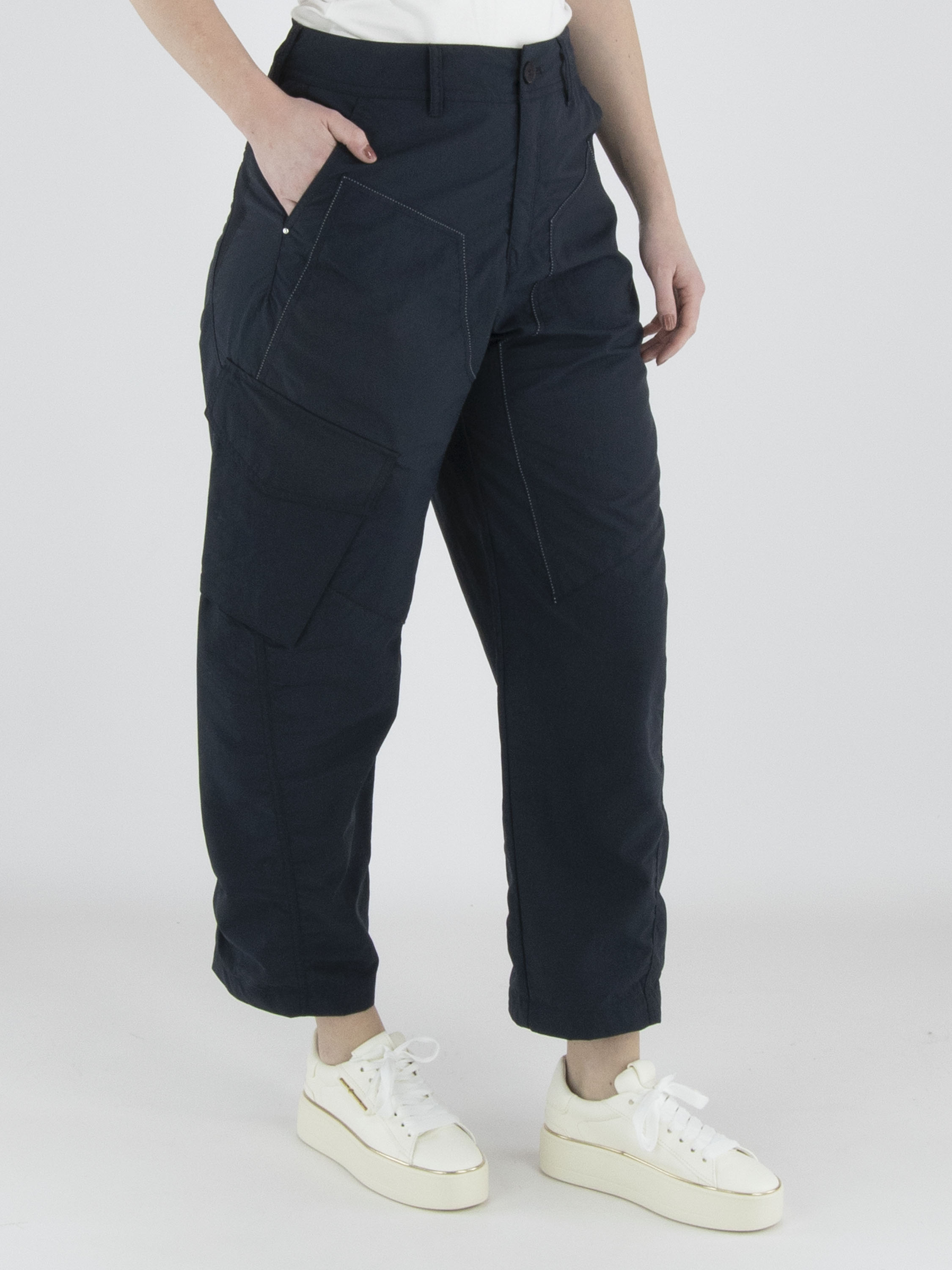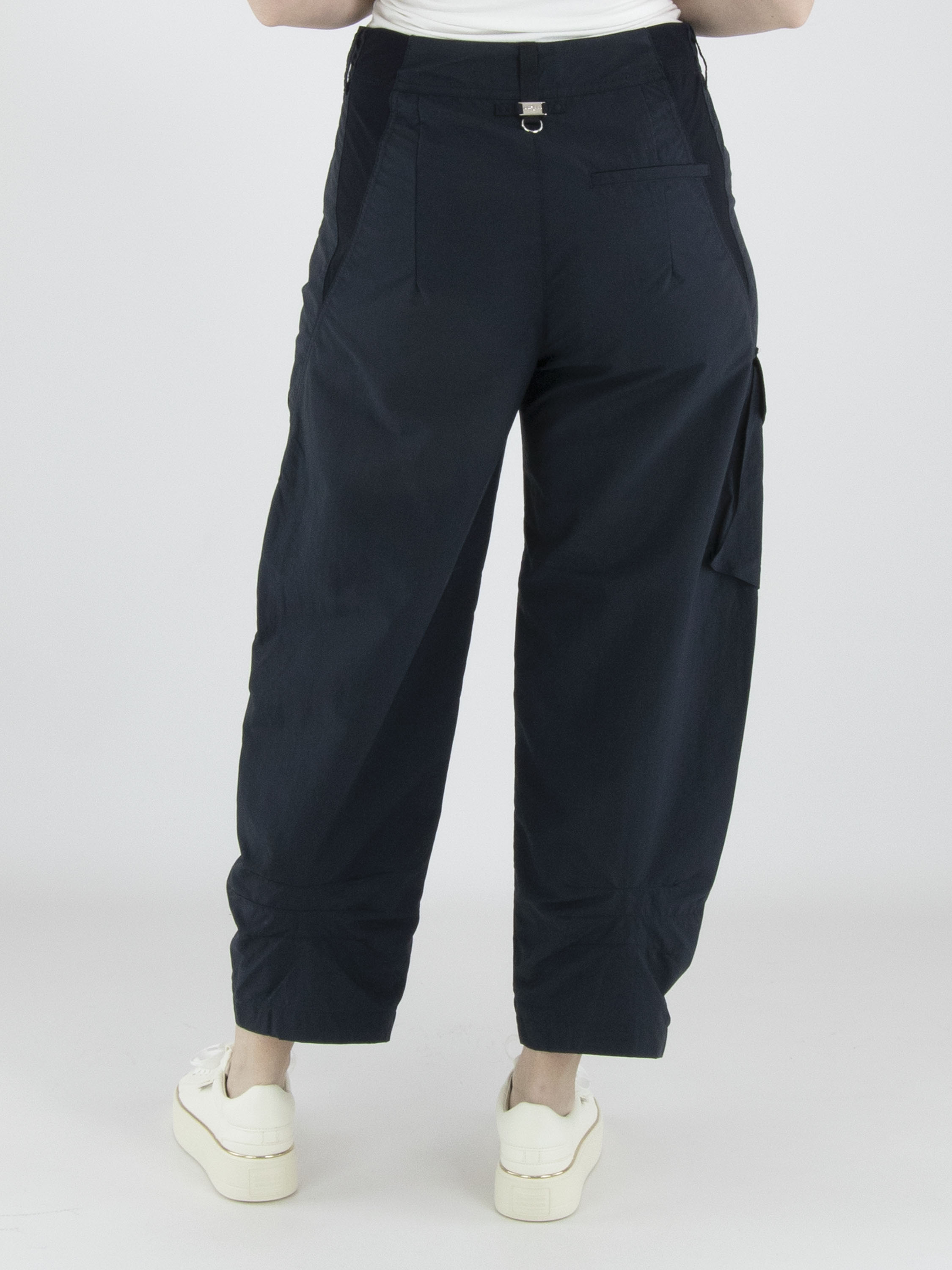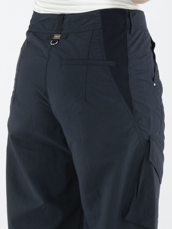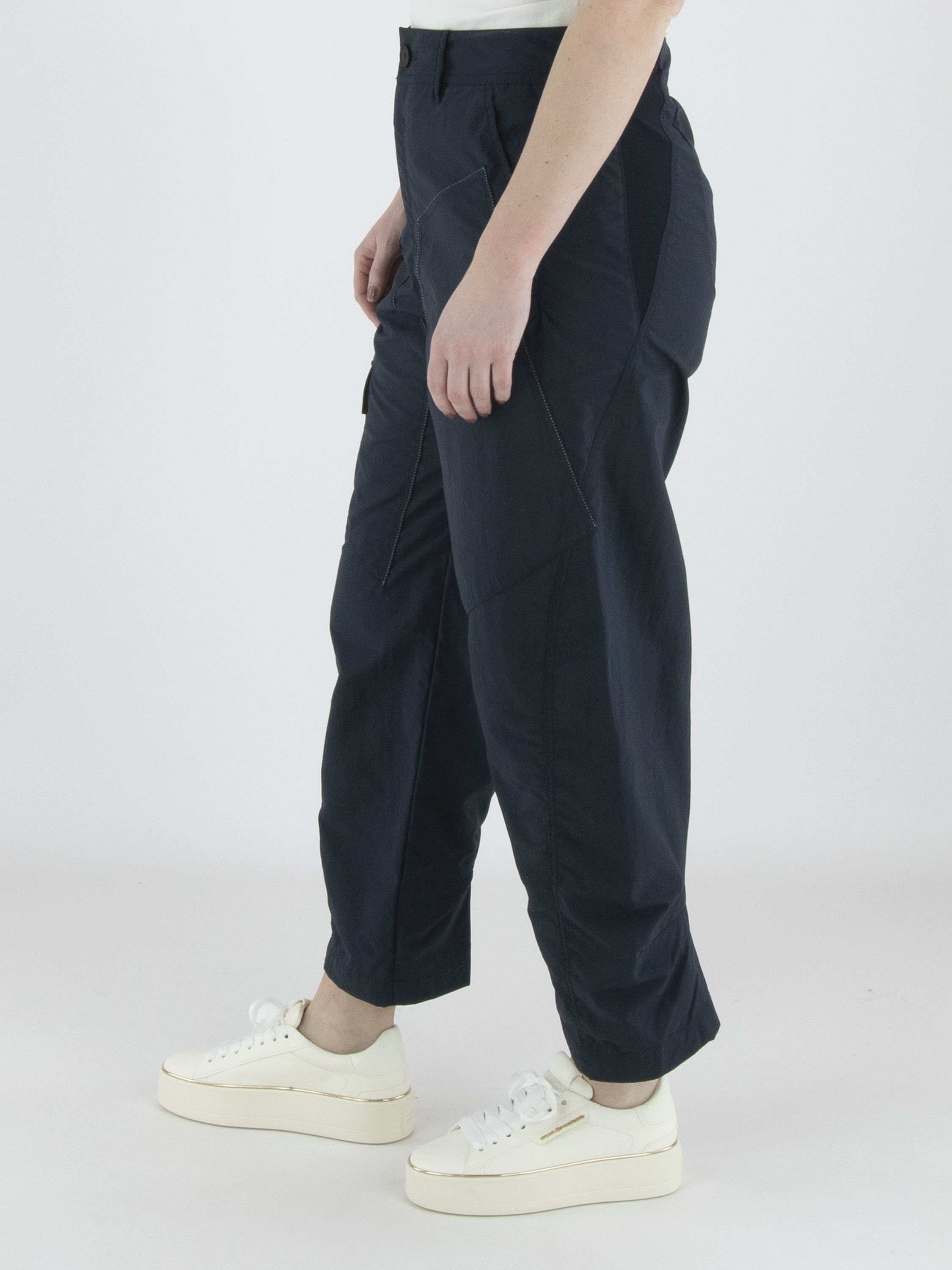 Trousers from High in a navy blue colour. The trousers feature slit pockets and a large diagonal pocket on the right leg at upper-thigh level. At the front, there are several white decorative seams. At the back, an elastic fabric insert runs from the waistband down to the hip, finished with a slit. These trousers can be washed at 30 degrees.