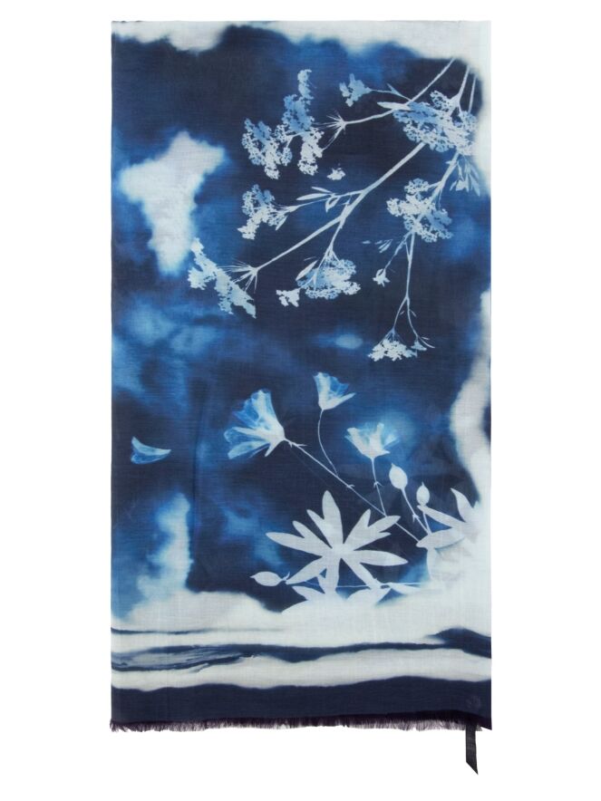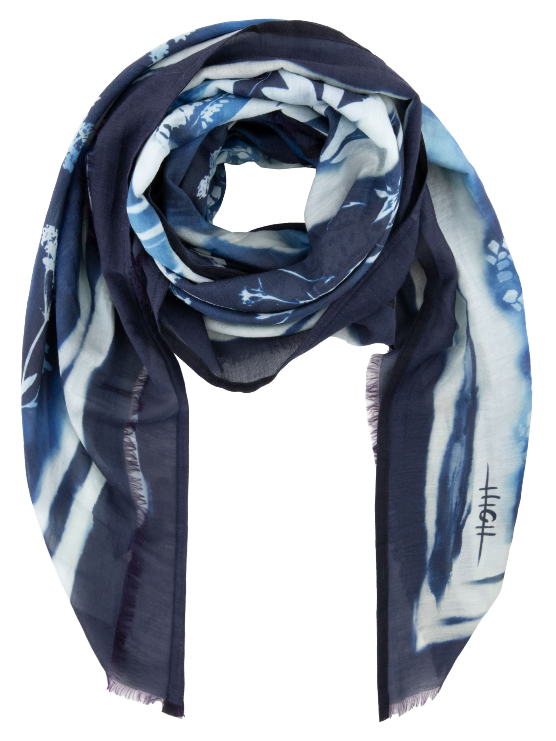 A luxurious, lightly transparent shawl by High featuring a batik-style floral print in various shades of blue. The edges of the shawl are delicately frayed. This shawl must not be washed.