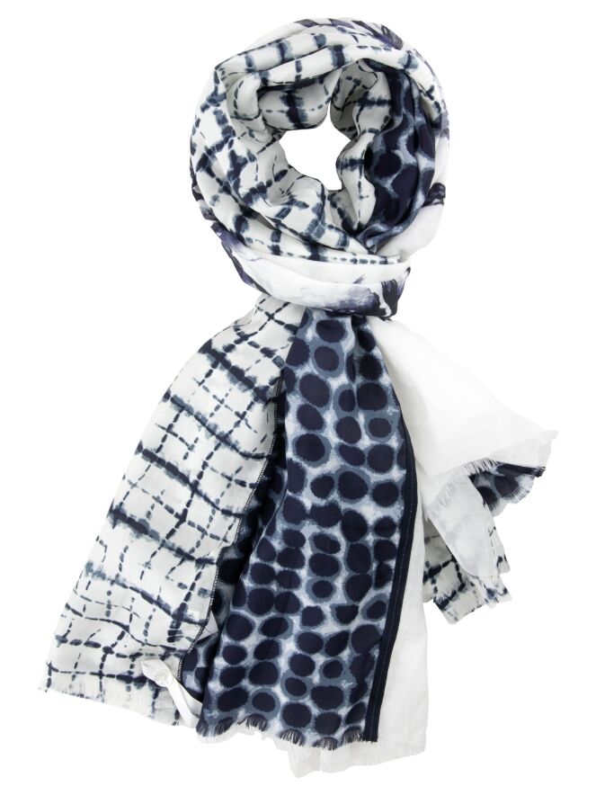 A luxurious, lightly transparent shawl by High featuring a double print. The central section is designed with a graphic watercolour floral print, while both ends are finished with a block print featuring circular motifs. The shawl is executed in various shades of blue combined with cream white. This shawl must not be washed.