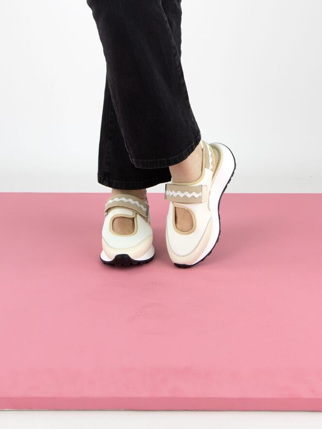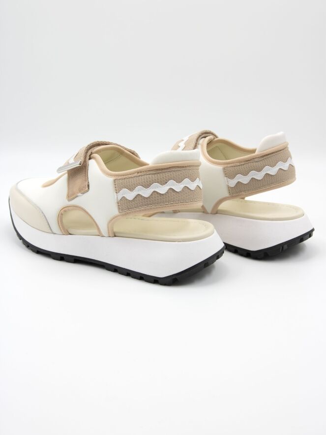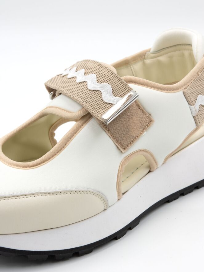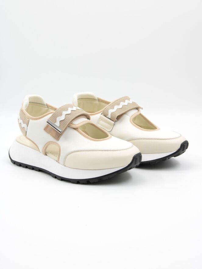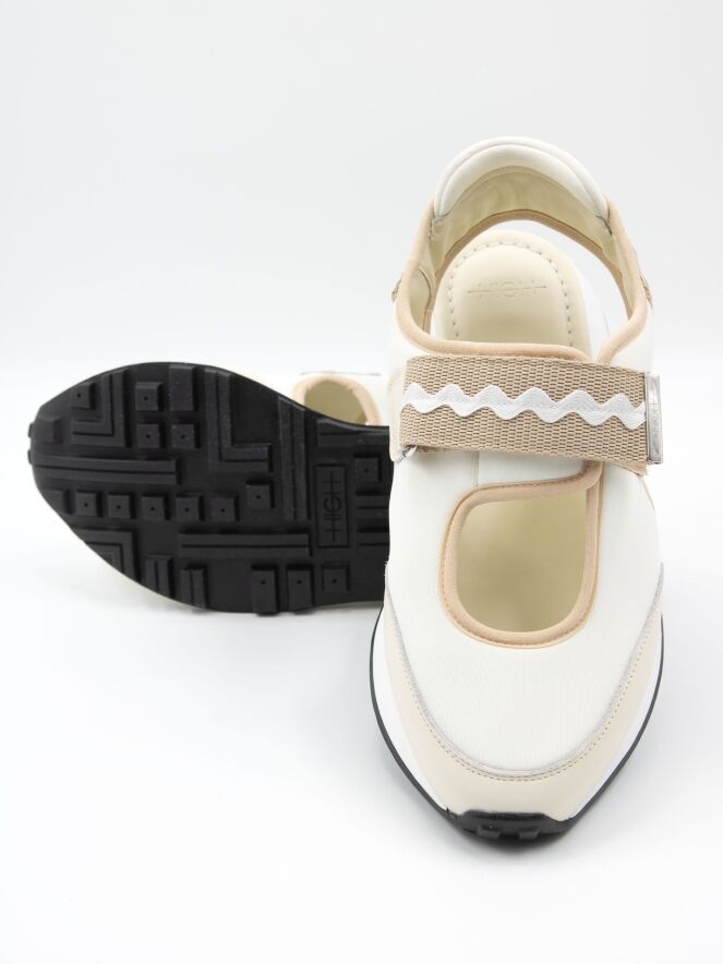 A backless sneaker by High in off-white and beige. An opening is located in the center of the forefoot. The edges are finished with a sand-colored leather trim. The forefoot features a Velcro strap closure. The sole is in a bright white color.