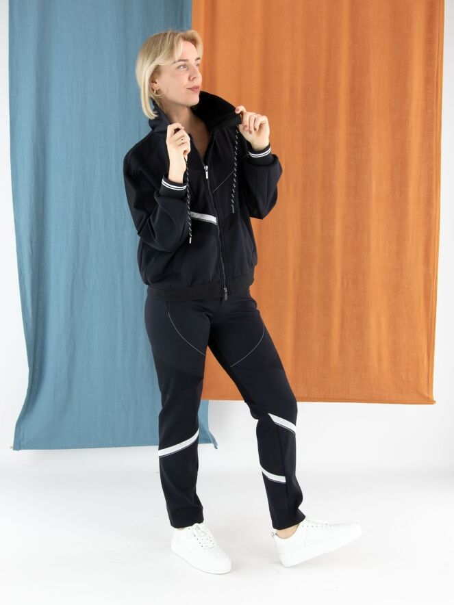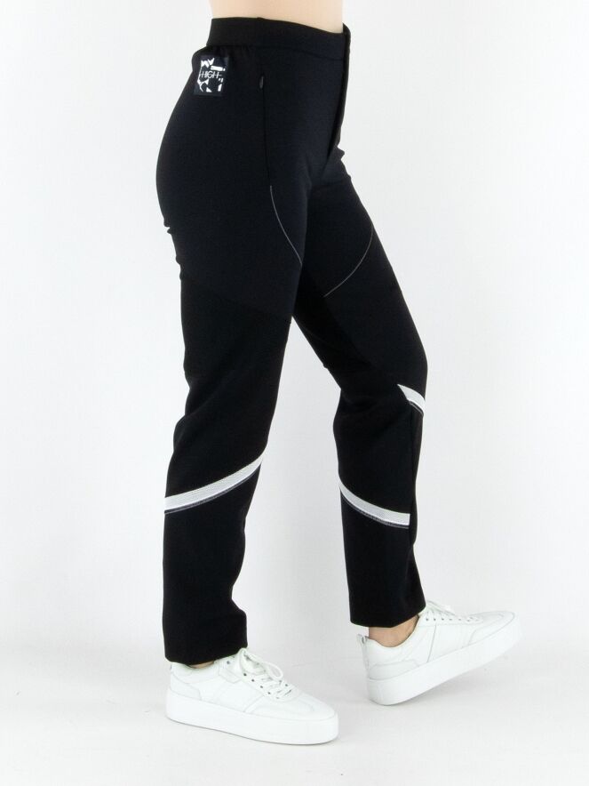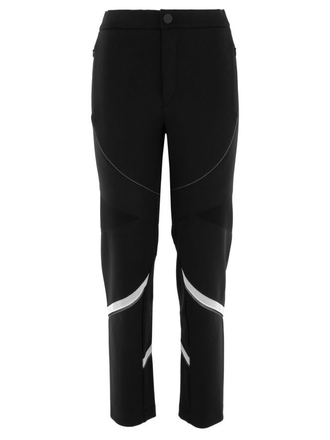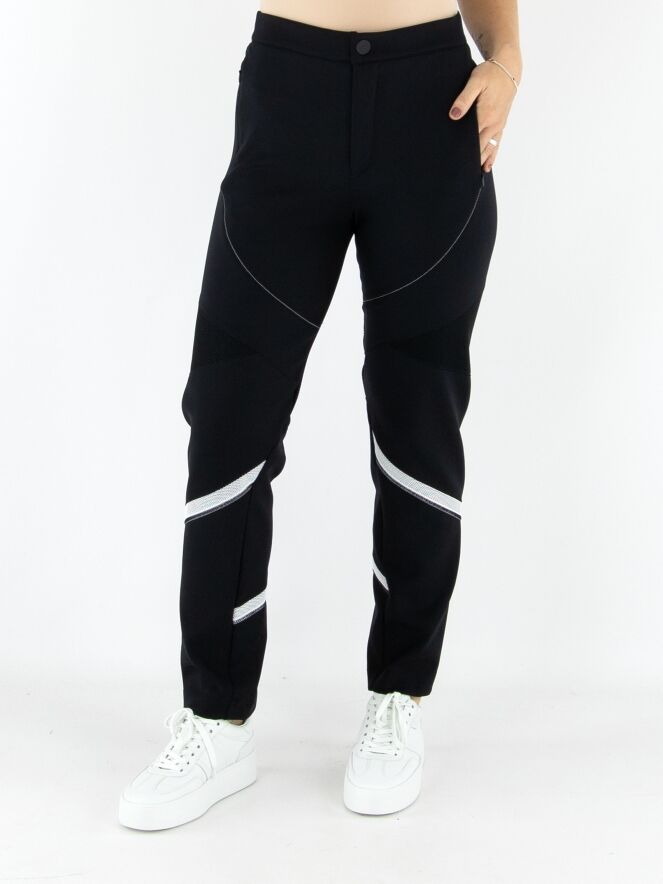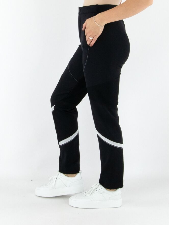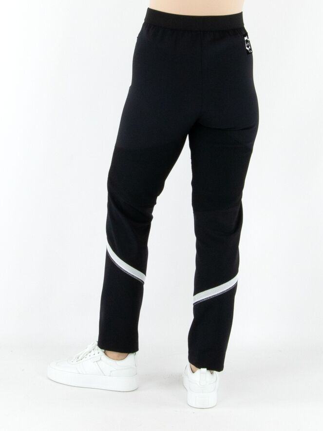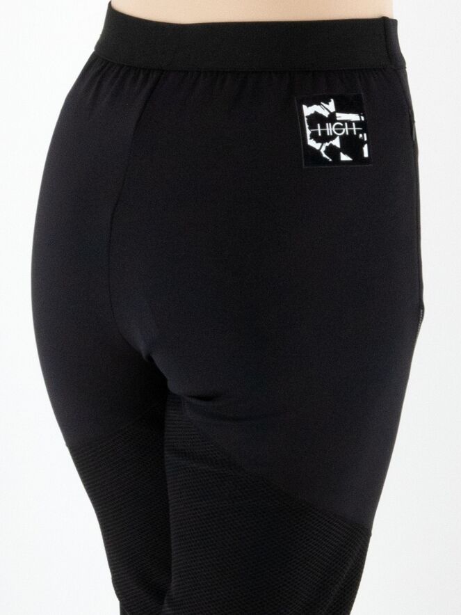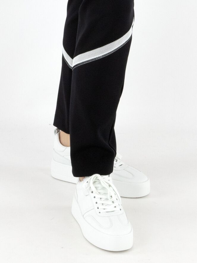 Trousers by High in classic black. The elastic waistband ensures extra comfort, while the side pockets feature practical zip closures. At knee level and along the lower leg, a black-and-white mesh detail adds a modern, sporty touch. A curved white seam starting from the pockets highlights the contemporary design. This exclusive designer trouser should be hand-washed.