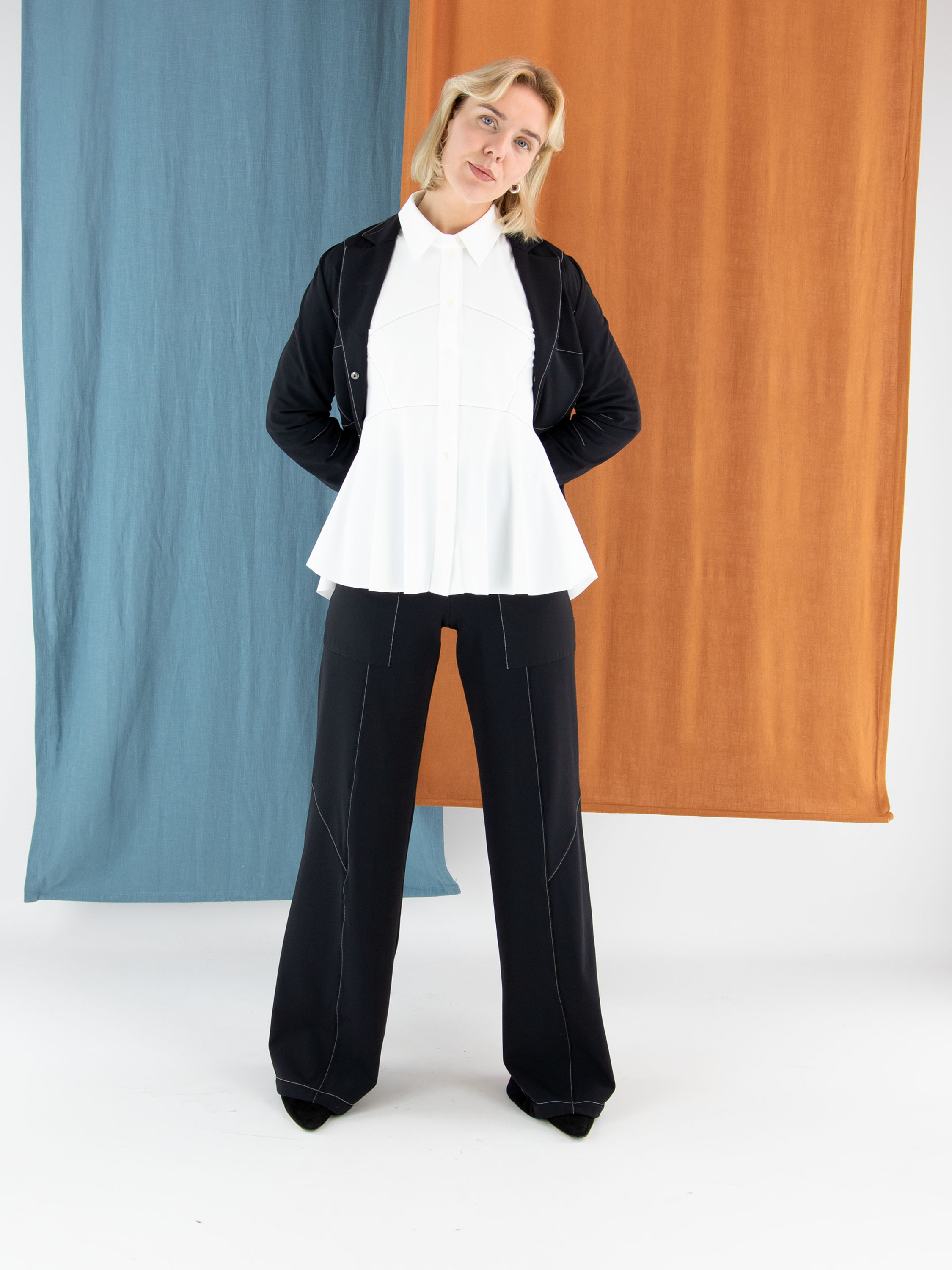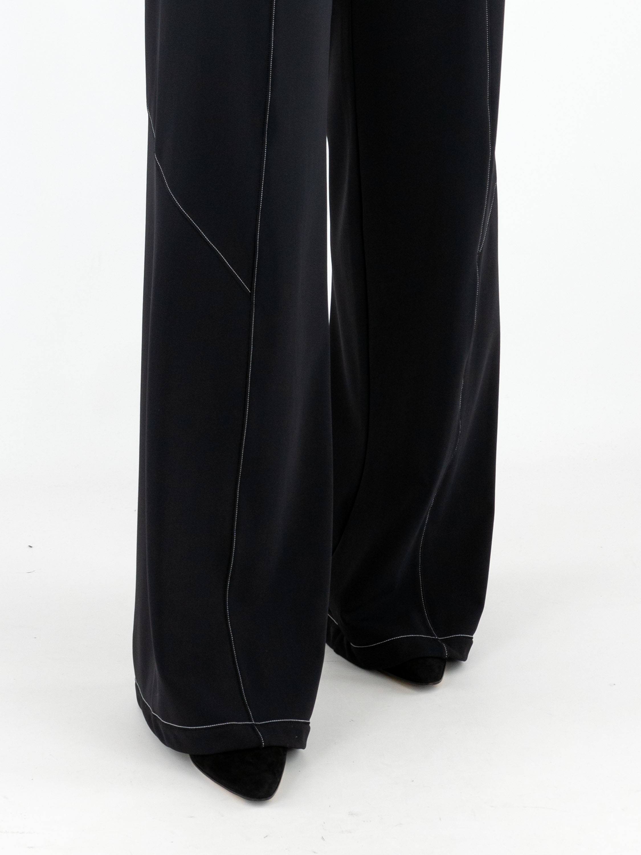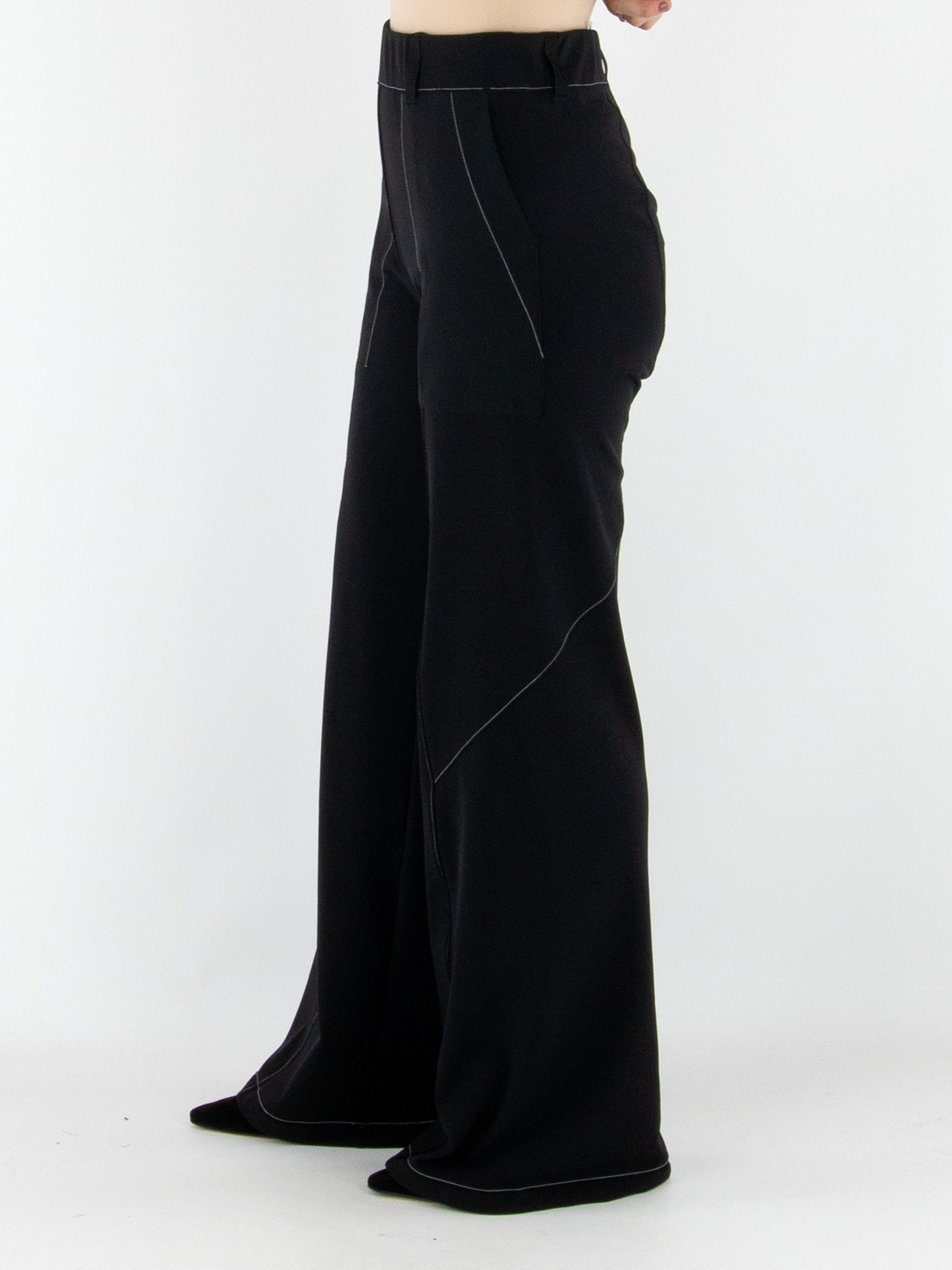 Quilted wide-leg trousers by High in elegant black. Designed with a wide elastic waistband for added comfort, this piece is finished with decorative topstitching in contrasting white. Side pockets complete this stylish and contemporary designer trouser. This exclusive women’s piece can be washed at 30 degrees.