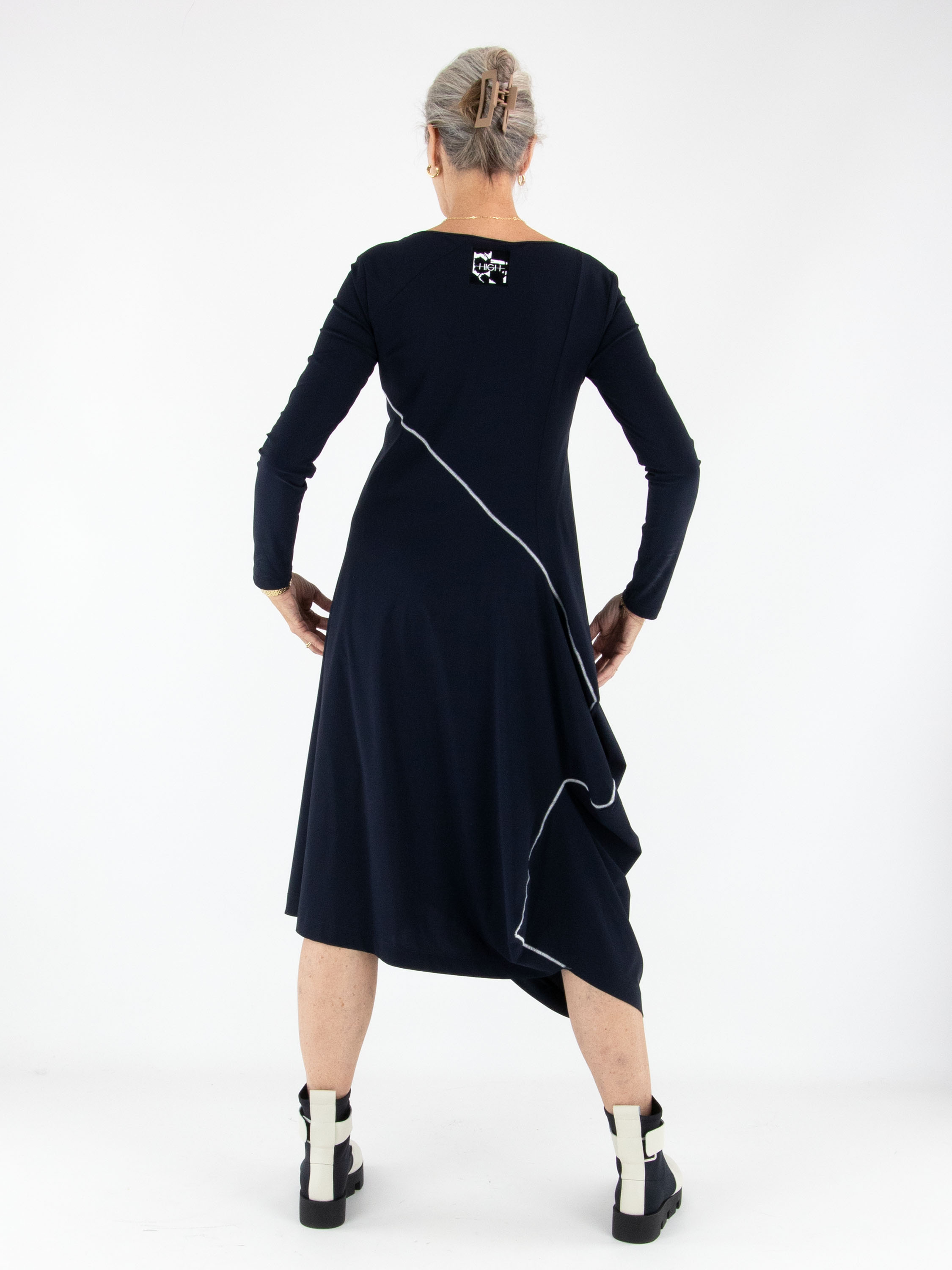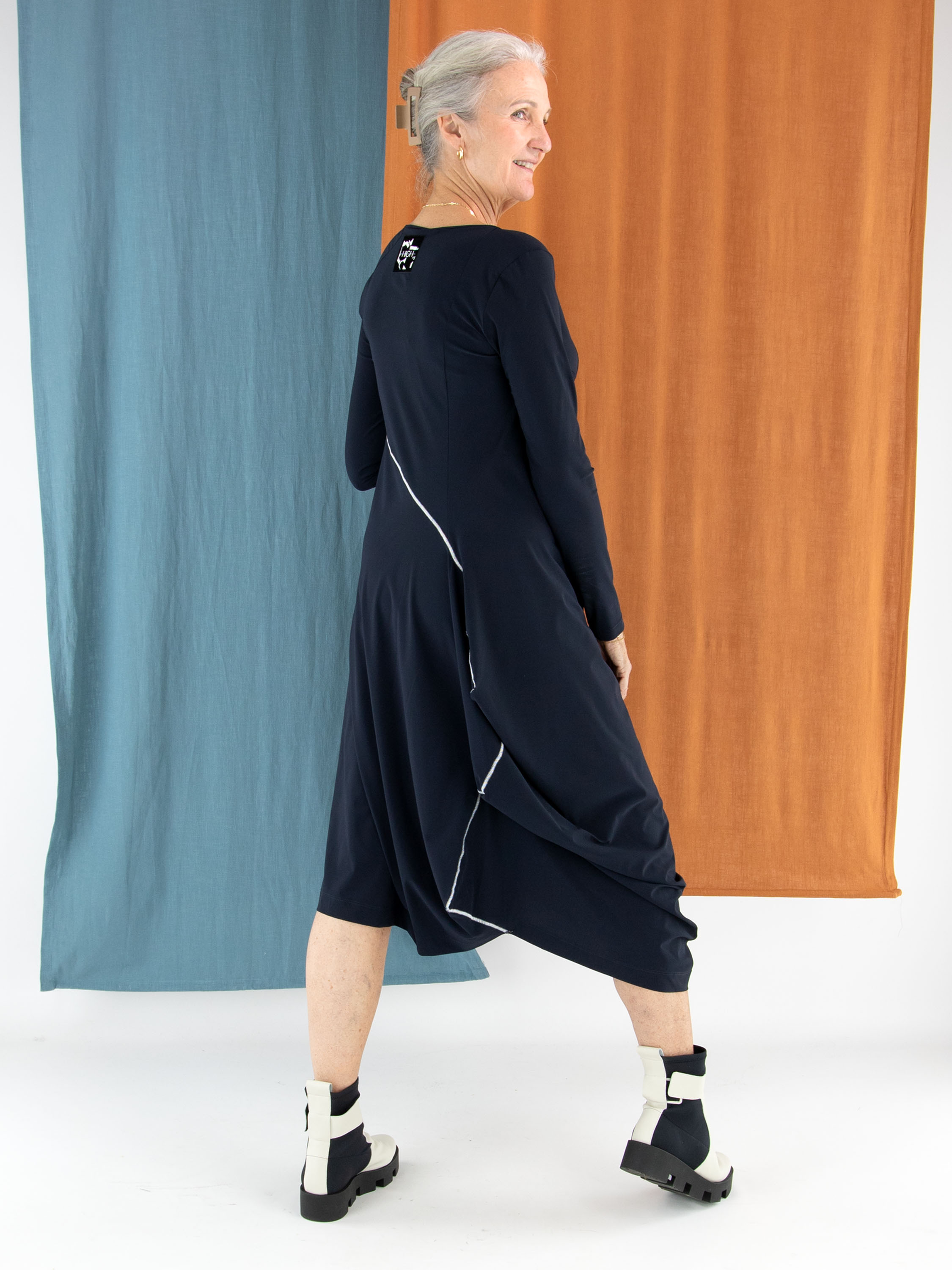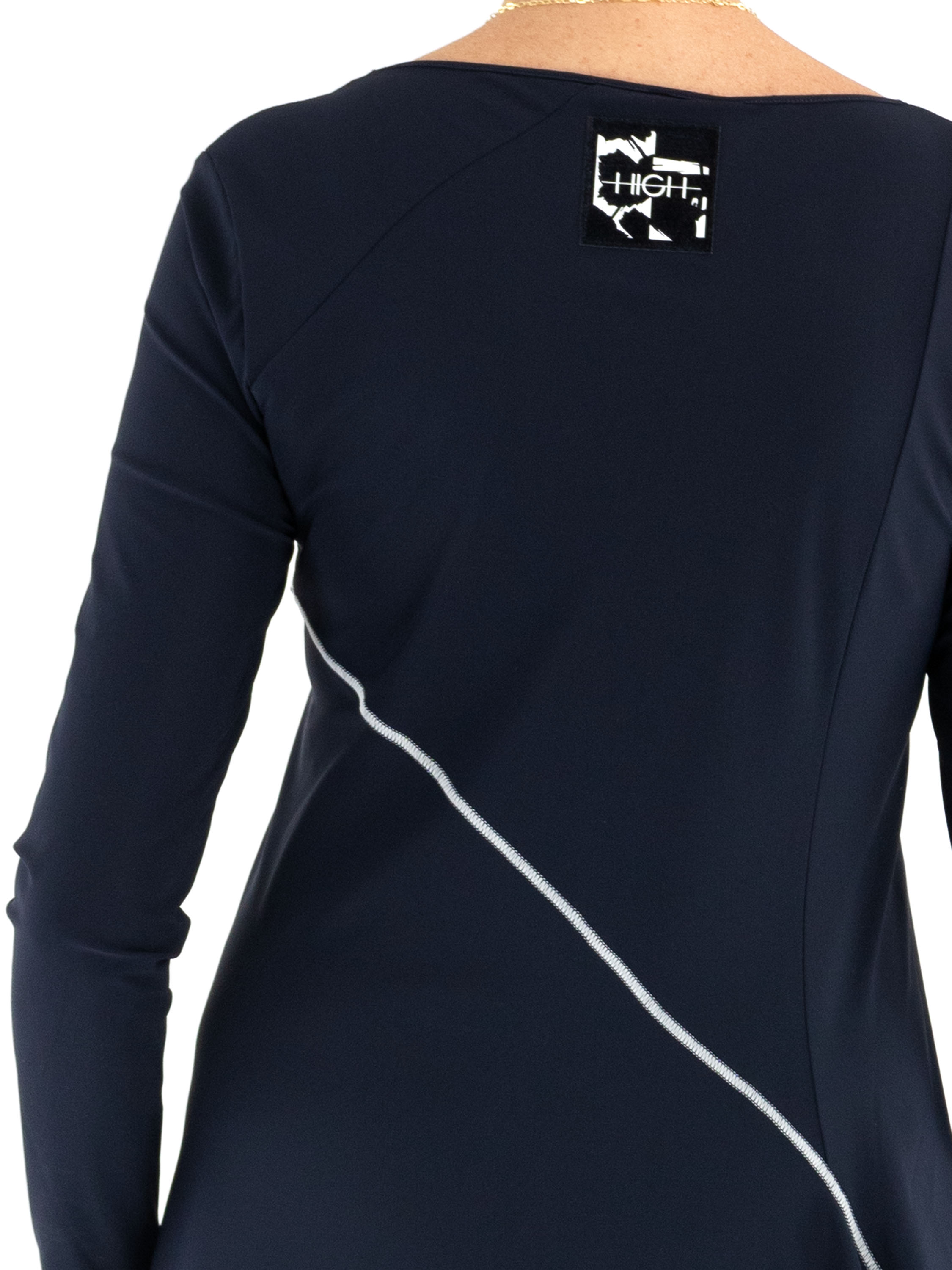 Dress by High in navy blue. A decorative seam runs diagonally from the left shoulder, adding a refined and modern detail to the design. At the waist on the right side, a discreet pocket enhances functionality. Featuring a round neckline and long sleeves, this exclusive designer dress can be washed at 30 degrees.