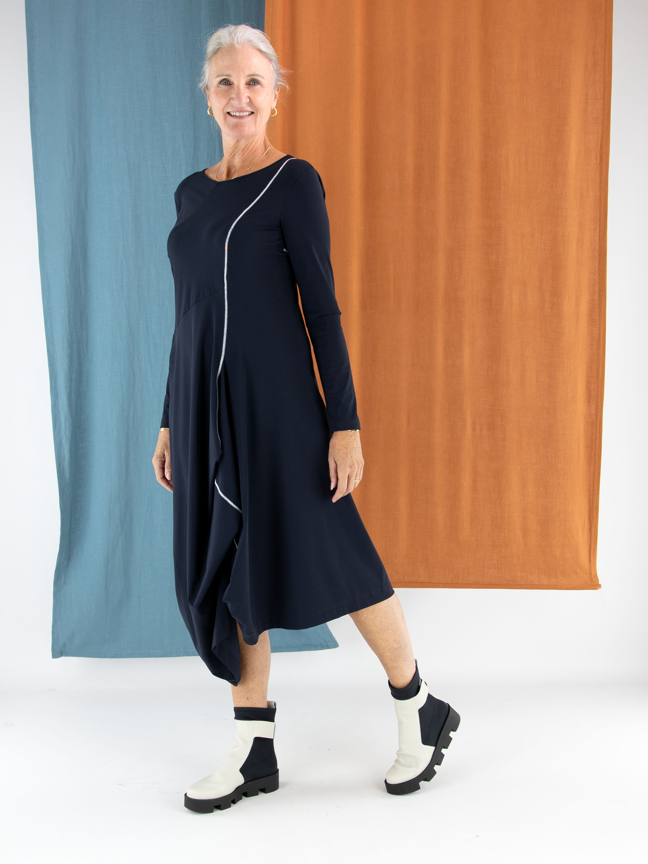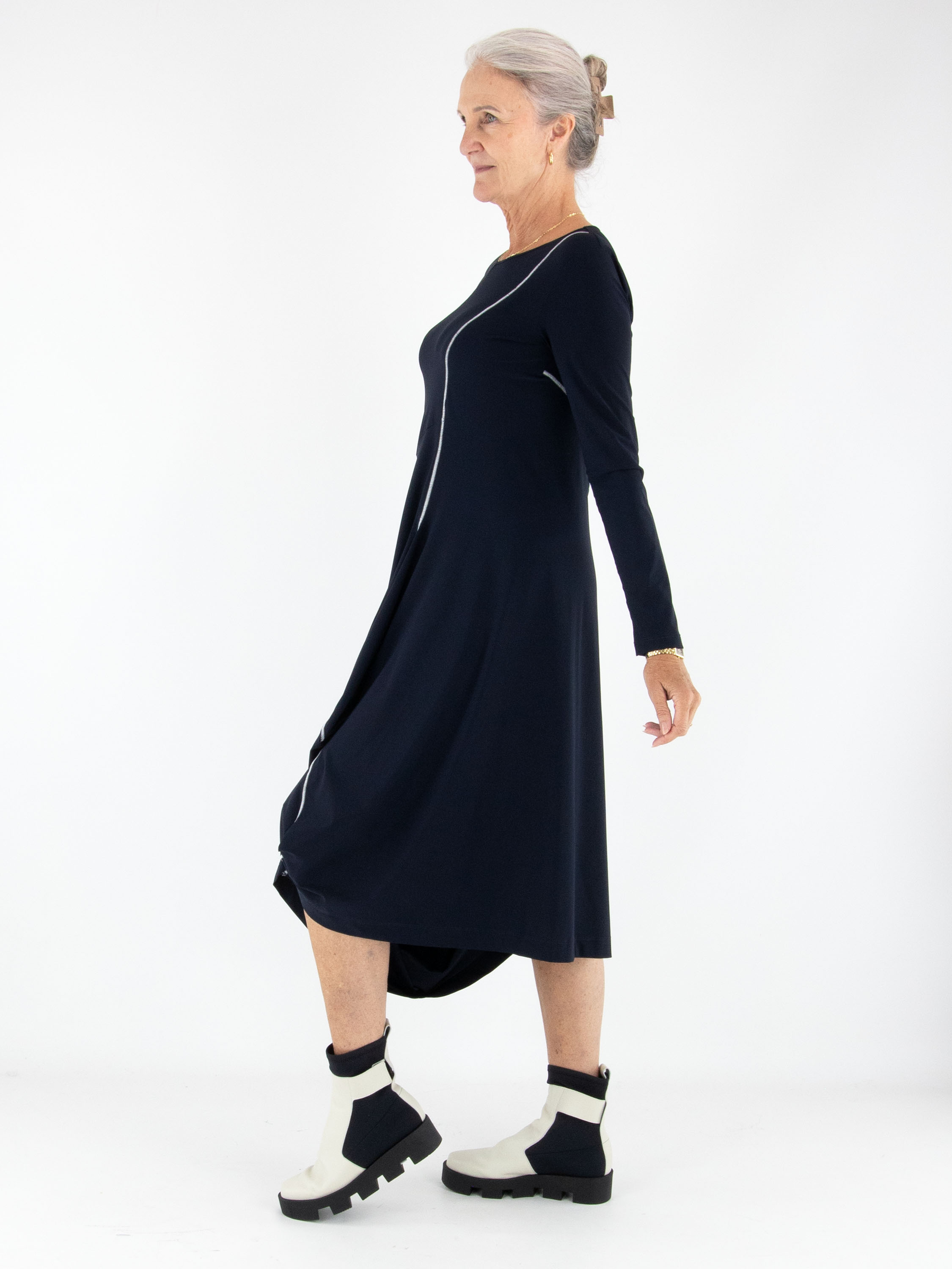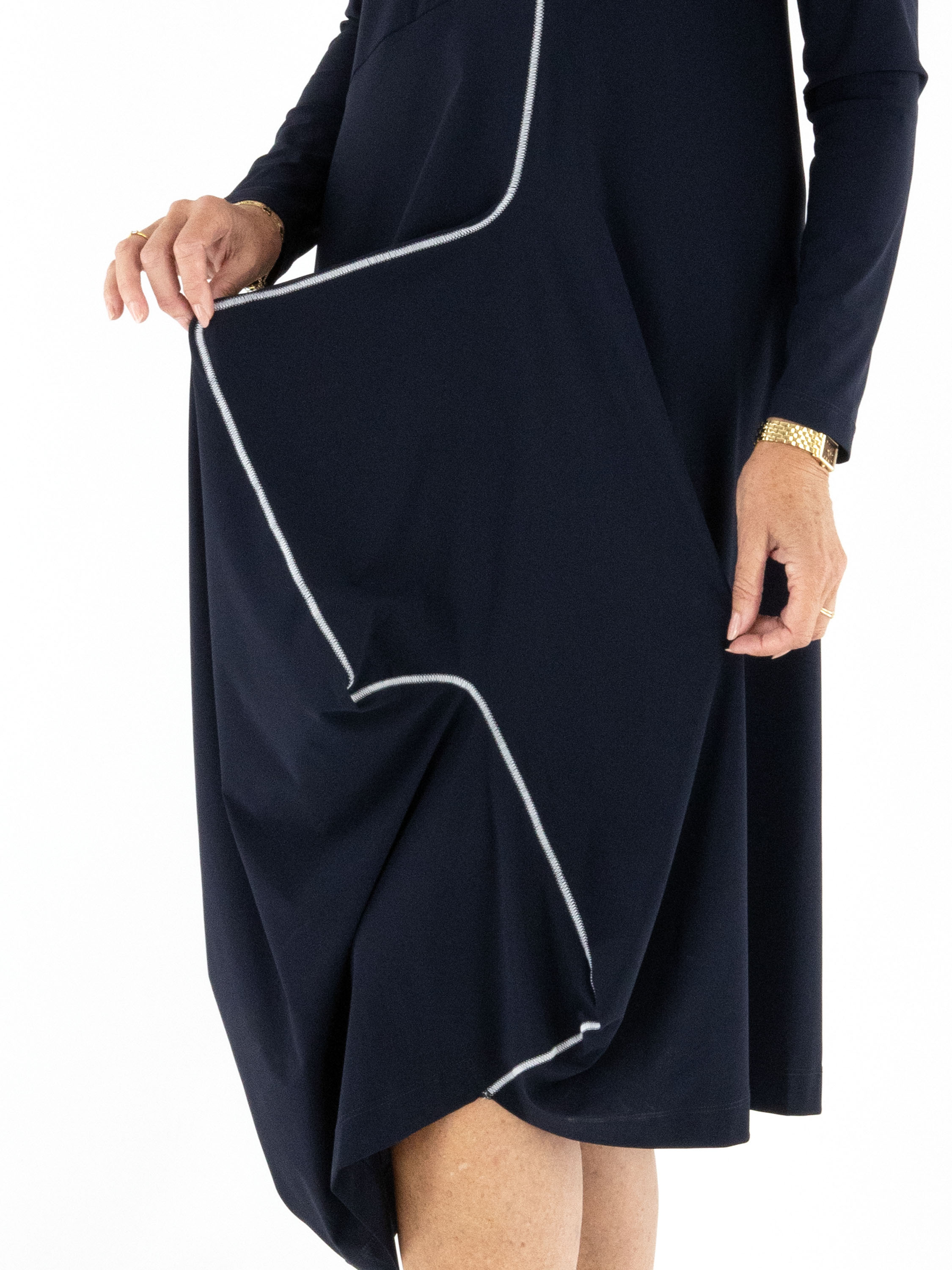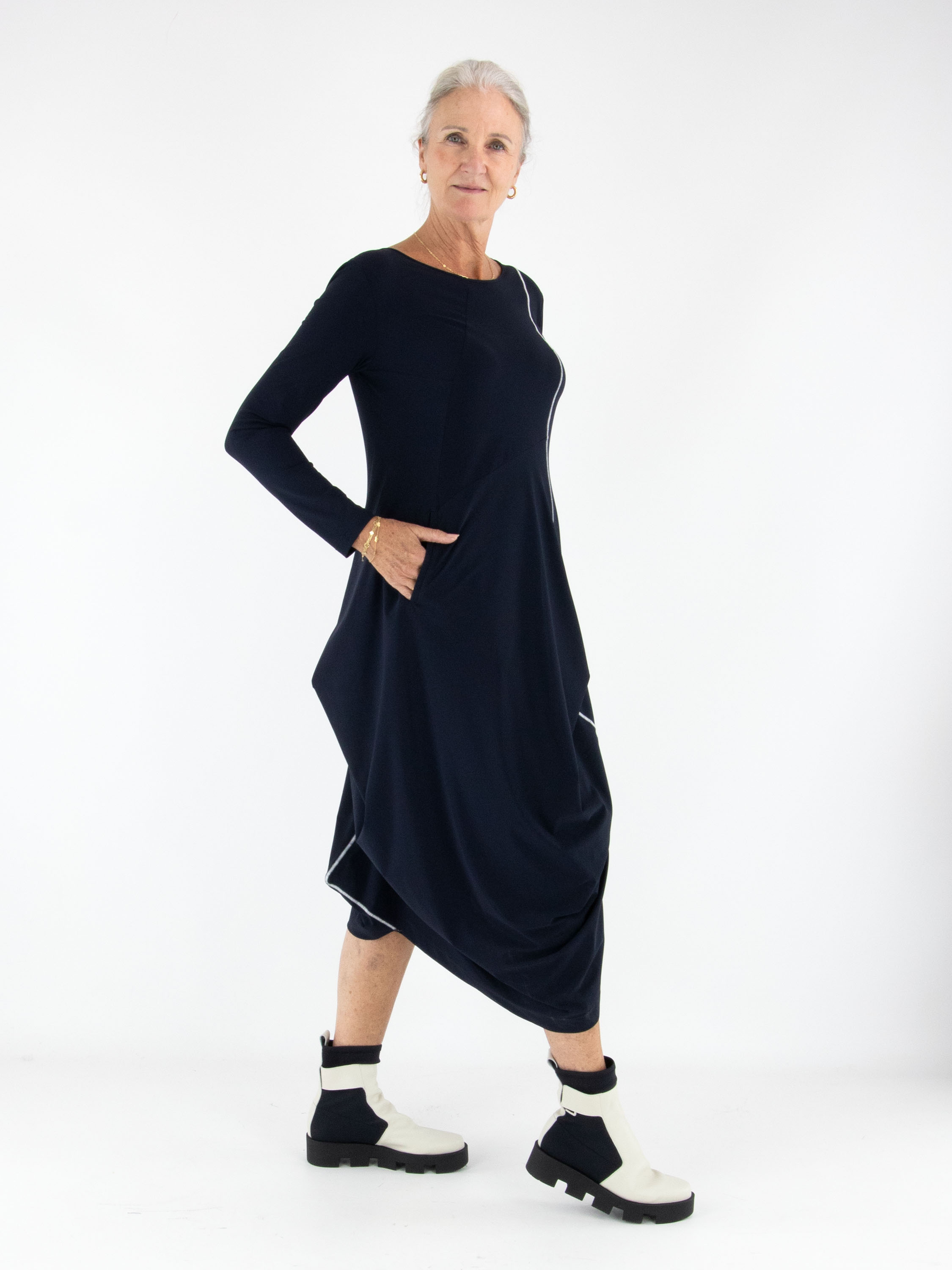 Dress by High in navy blue. A decorative seam runs diagonally from the left shoulder, adding a refined and modern detail to the design. At the waist on the right side, a discreet pocket enhances functionality. Featuring a round neckline and long sleeves, this exclusive designer dress can be washed at 30 degrees.