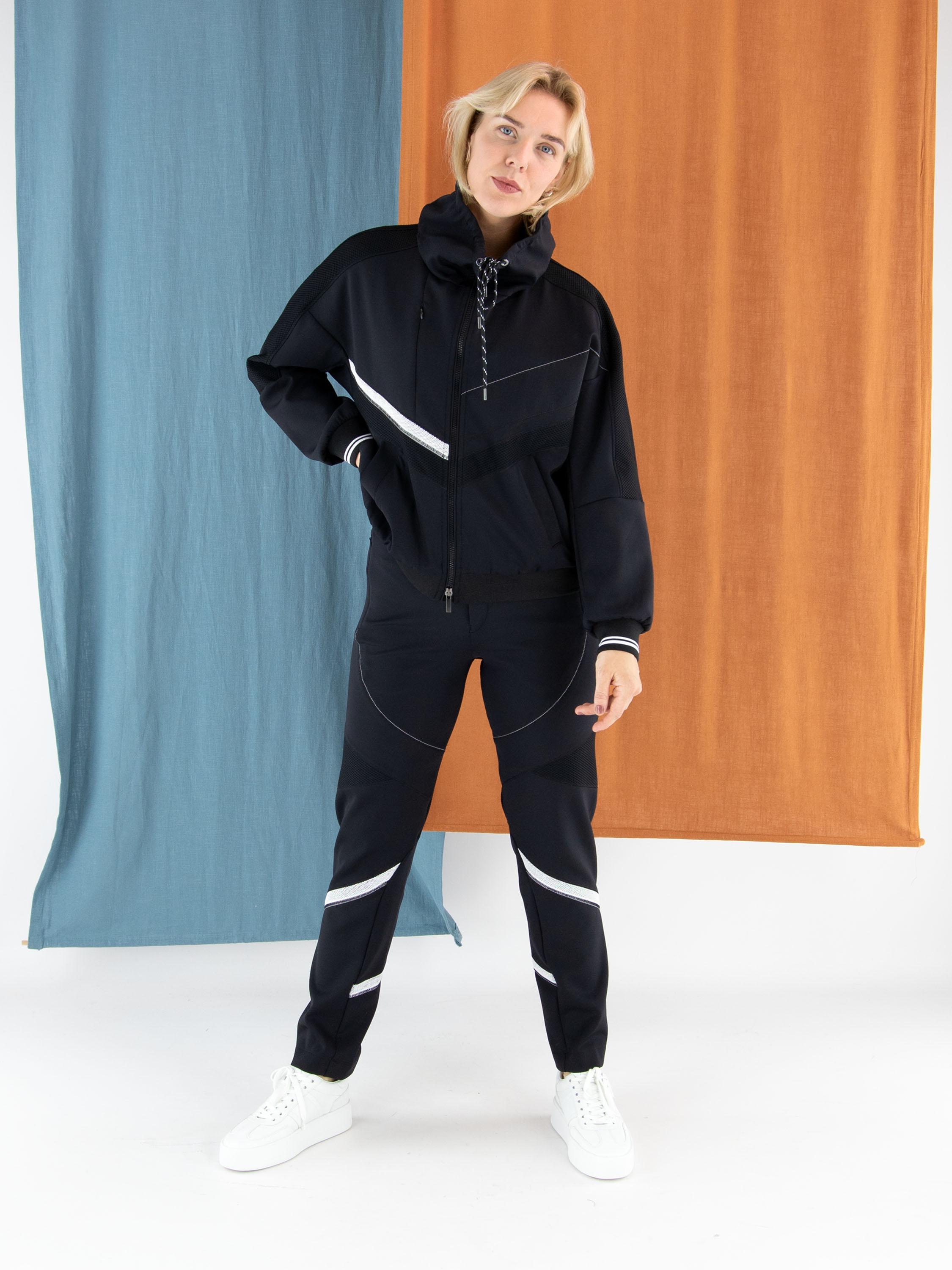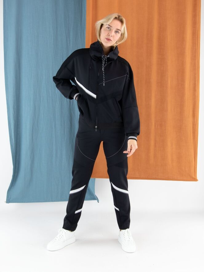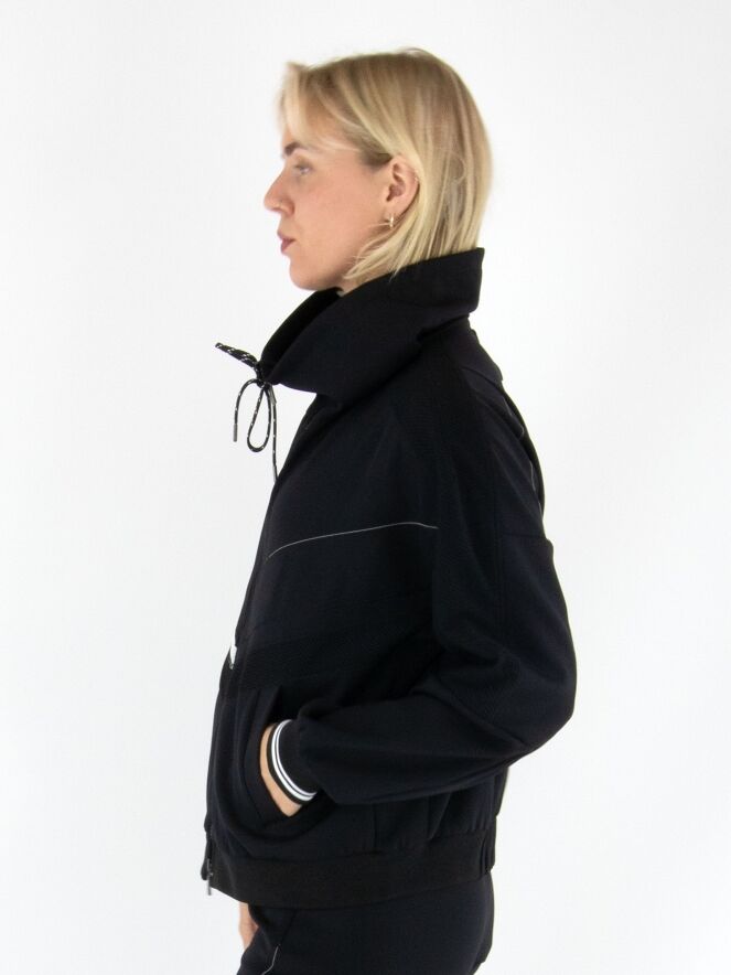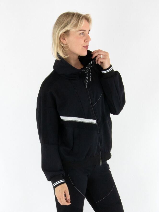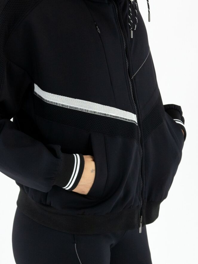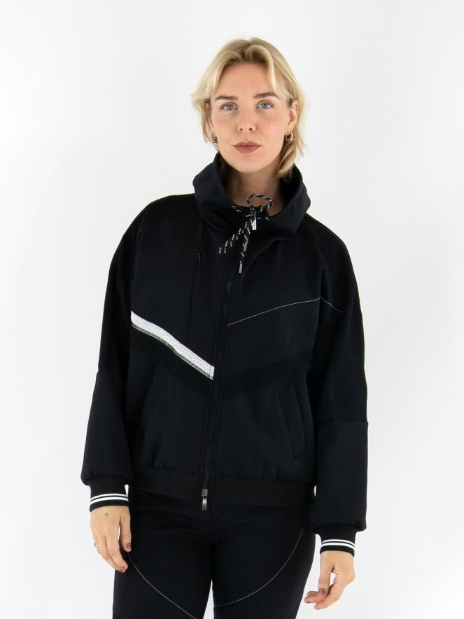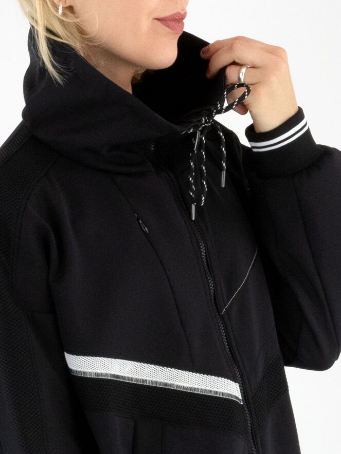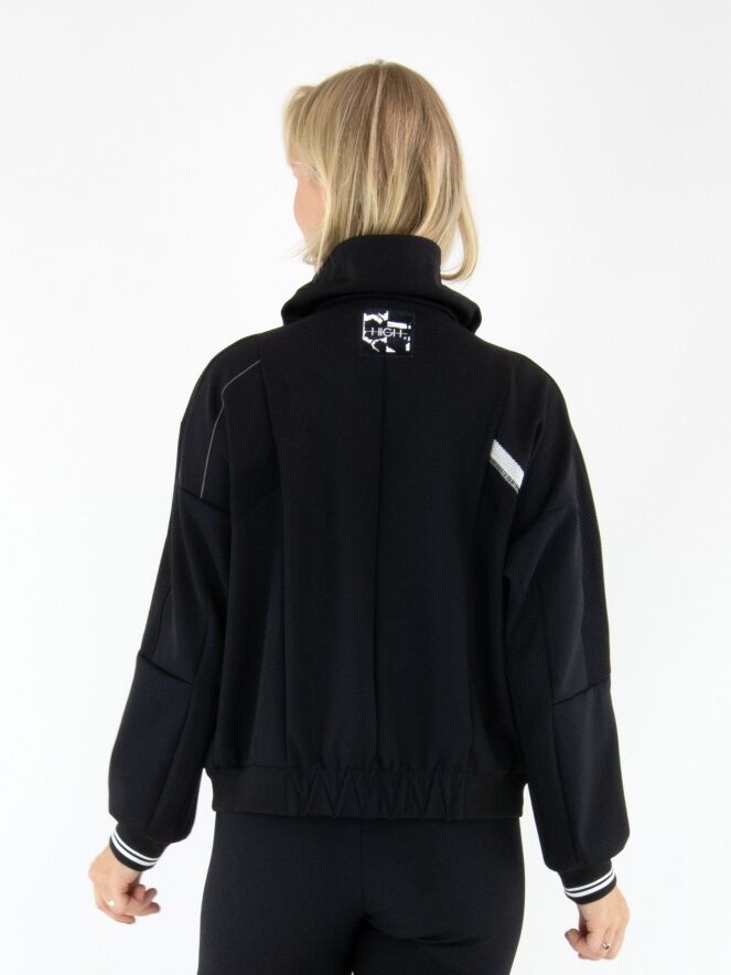 Quilted vest by High in black. A drawstring integrated into the collar allows for a refined pleated effect. At the front, diagonal mesh panels and a white decorative seam add a modern, sporty touch. The long sleeves are finished with fine ribbed knit cuffs, while practical side pockets complete the design. This exclusive designer vest should be hand-washed.