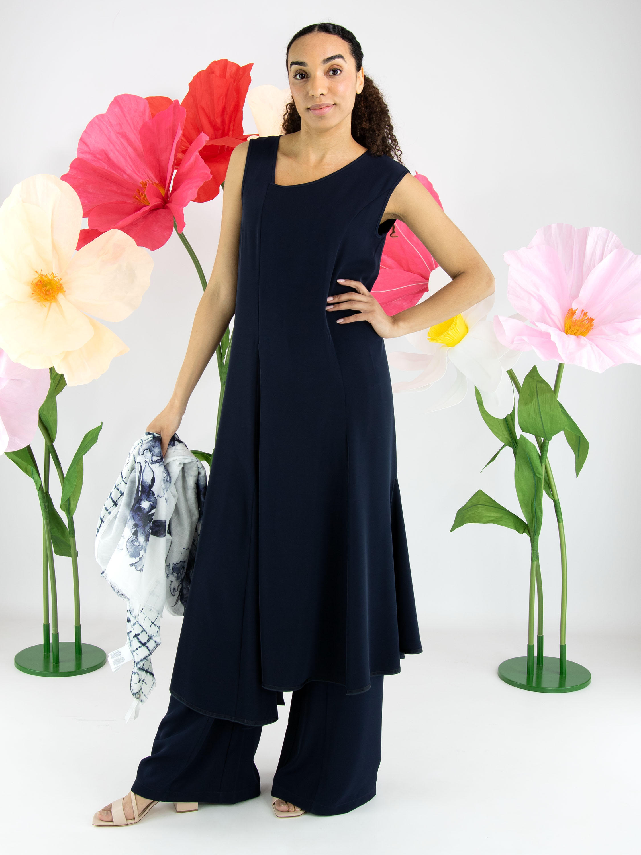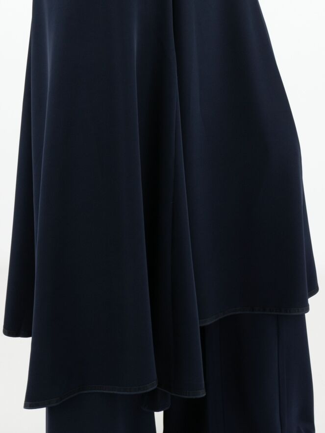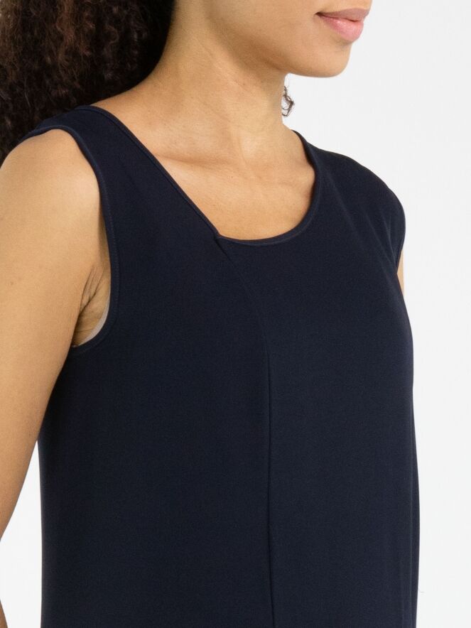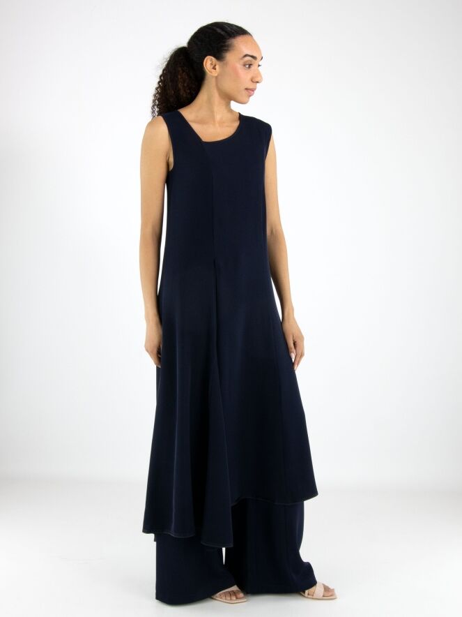Dress by High in an elegant navy blue shade. The V-neckline is designed asymmetrically, giving the piece a modern and distinctive character. From the waist, the dress falls into an A-line silhouette, enhanced by several pleats that create a fluid and feminine drape. This dress can be washed at 30 degrees.