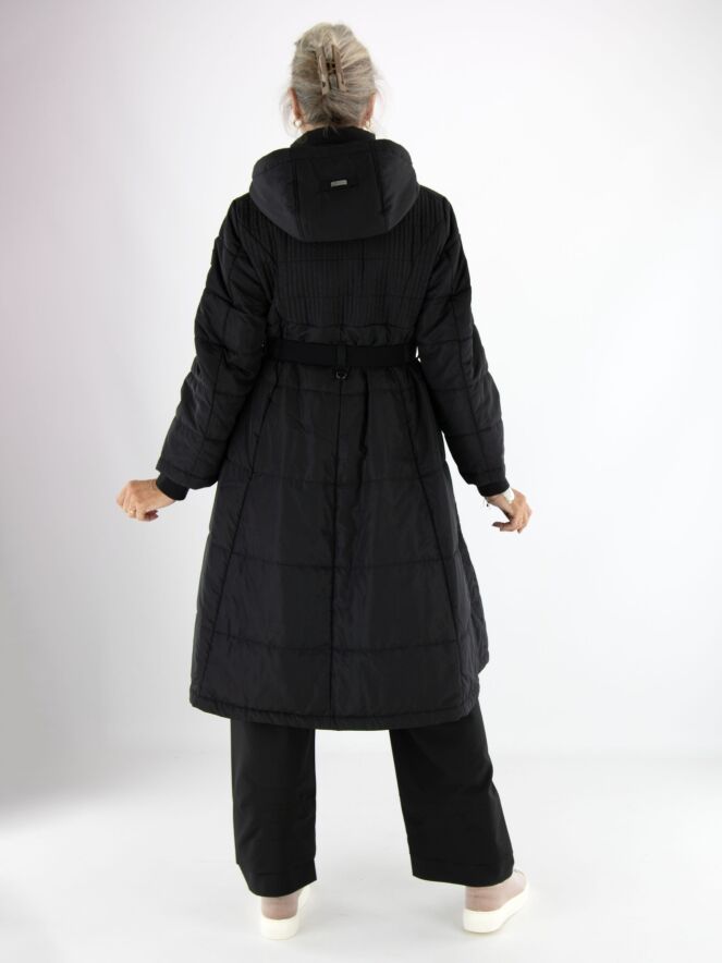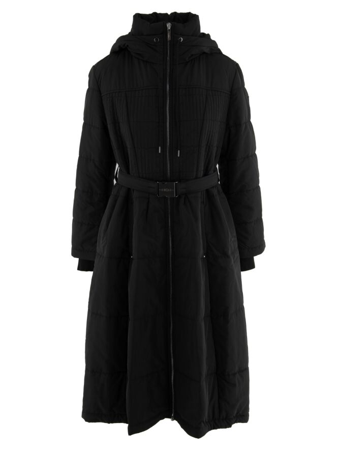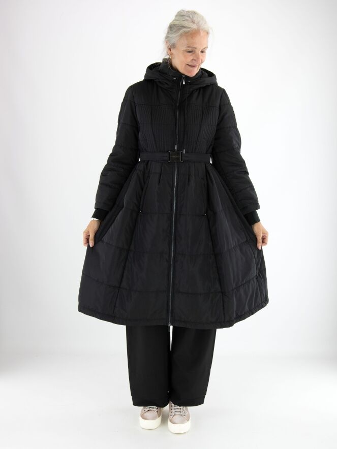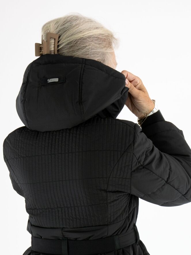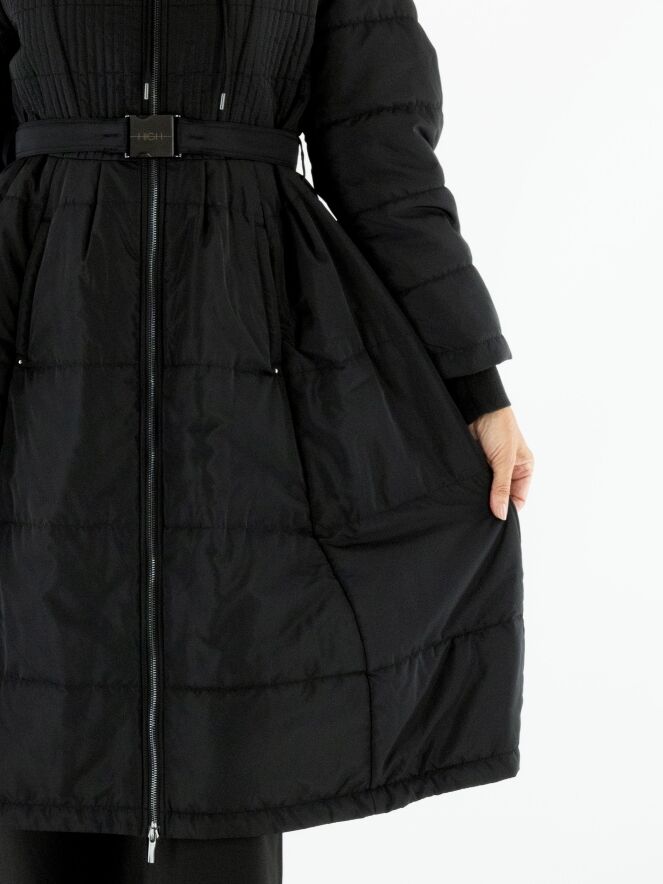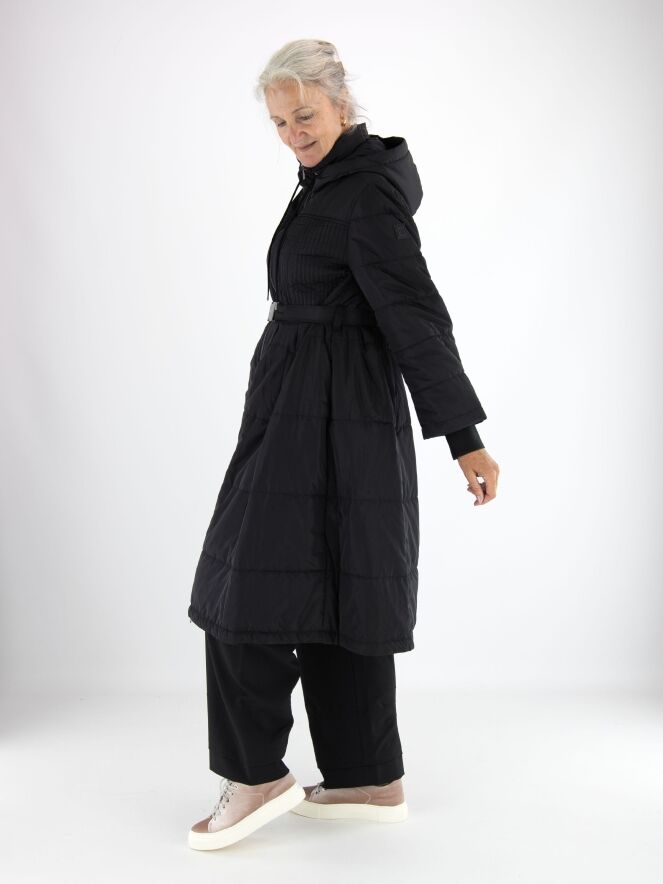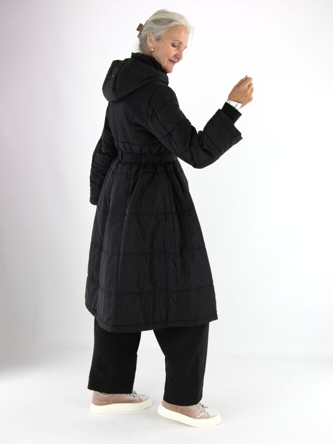A long coat by High in black. The hood features a drawstring in a tunnel construction. At the waist, there's a belt with a nickel-coloured buckle. From chest height to the waist, the fabric is stitched in a smocked pattern. The coat has slit pockets and can be washed at 30 degrees.
