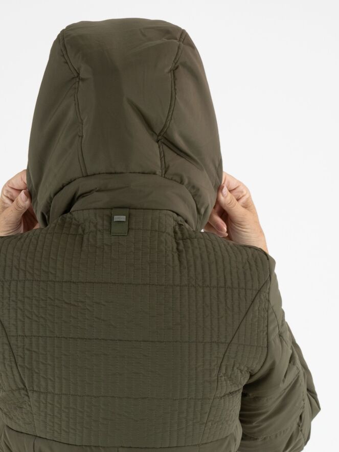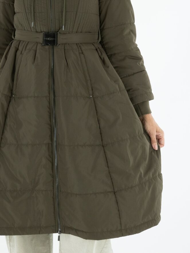 A long coat by High in olive green. The hood edge features a drawstring in a tunnel design. At the waist, there's a belt with a nickel-colored buckle. From the bust to the waist, the fabric is stitched in a smocked pattern. The coat has side pockets and can be washed at 30 degrees.