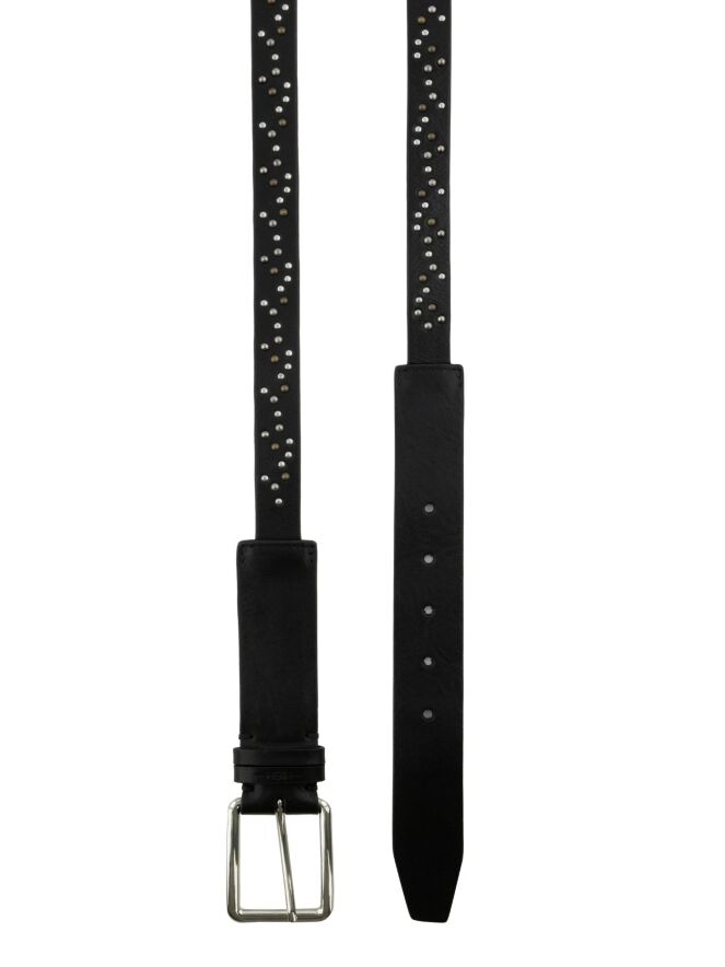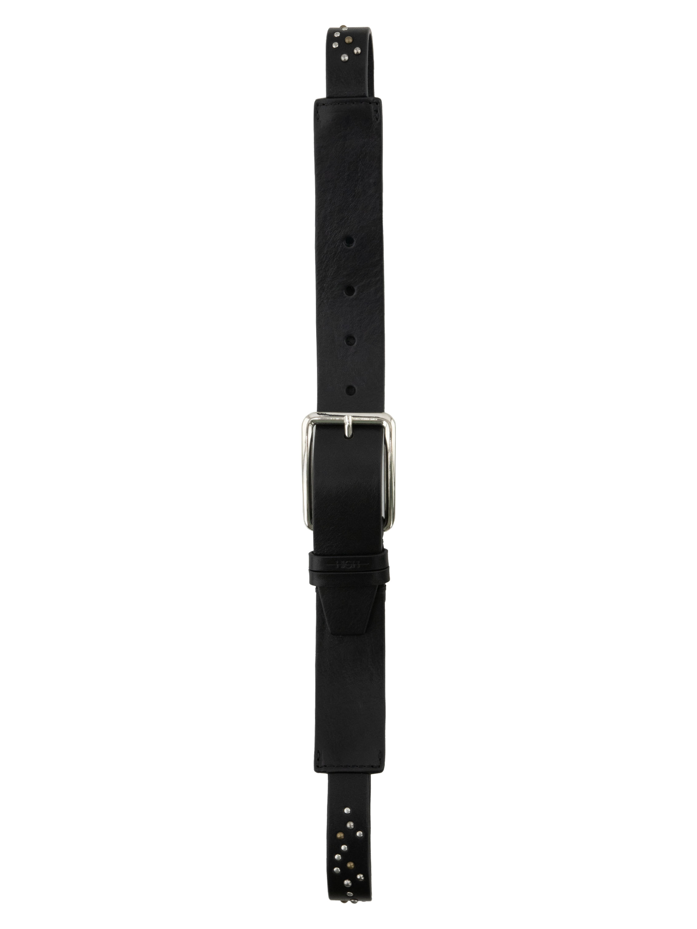 A leather belt from High in black. The silver-coloured buckle has a rectangular shape. The central part of the belt is 2 cm wide and features small decorative studs.