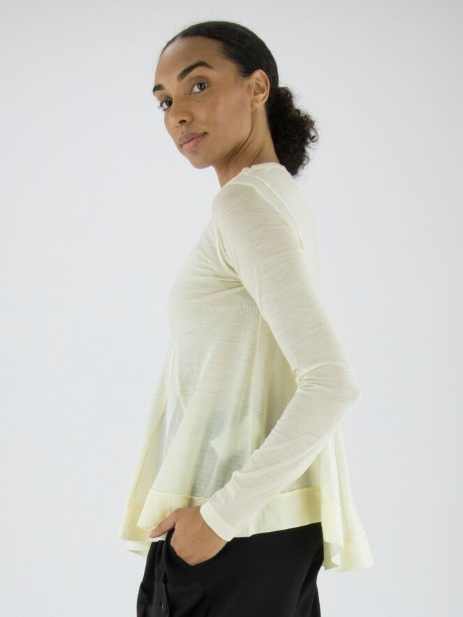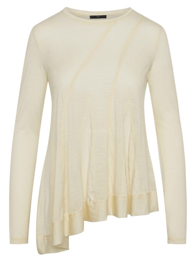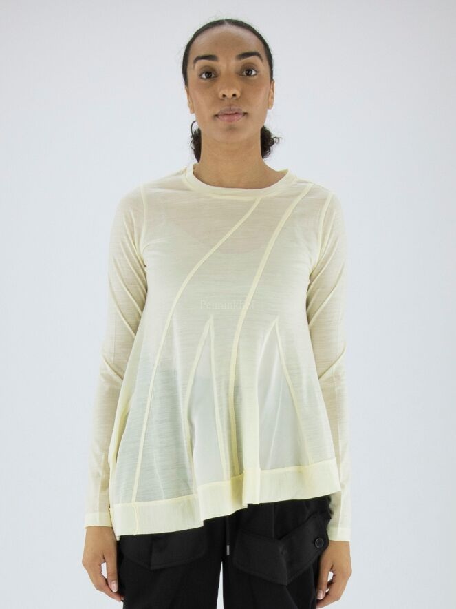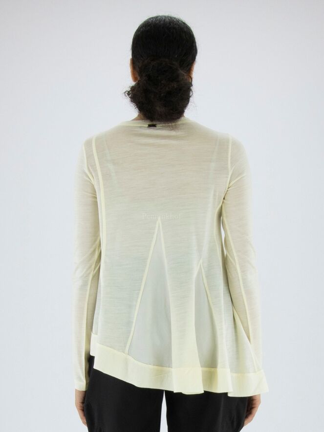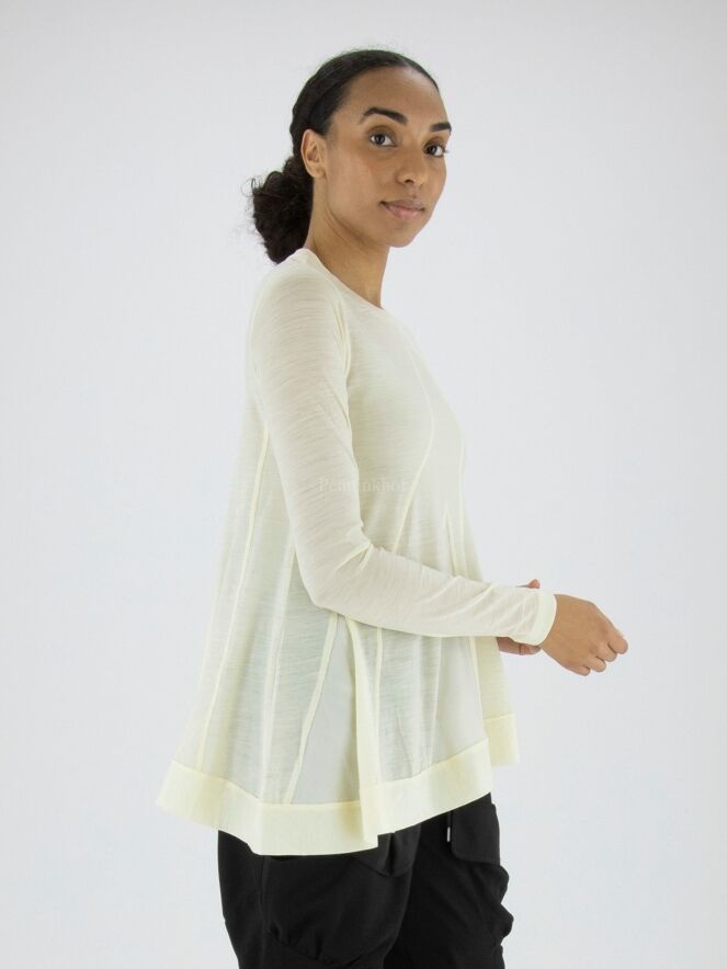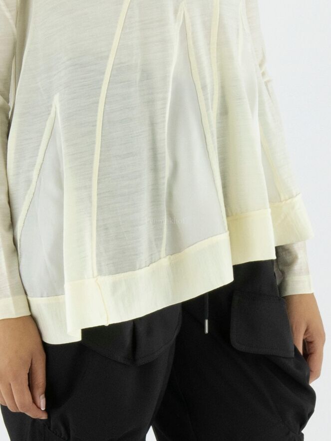 A shirt from High in a creamy white colour. At the front are several diagonal stitching seams between which is a matt satin fabric. At the bottom is a wide band with a stitching seam. This shirt may be hand washed.