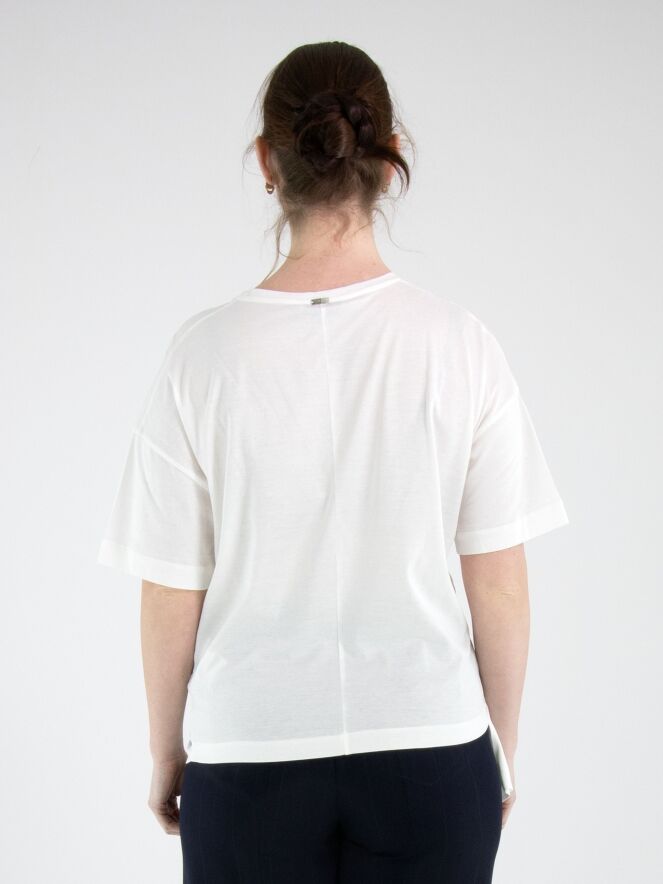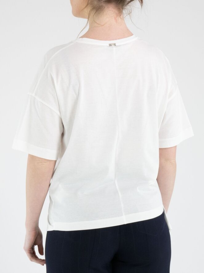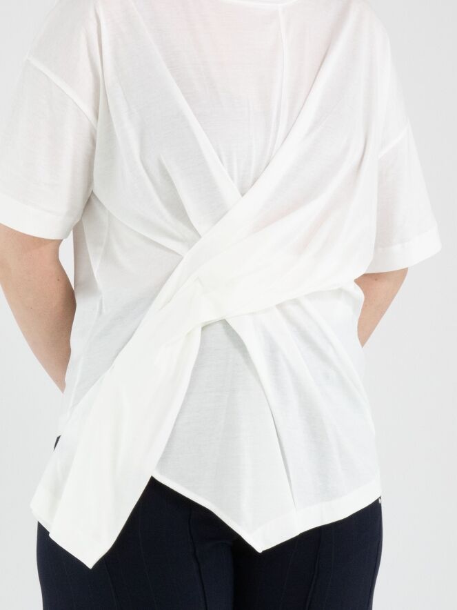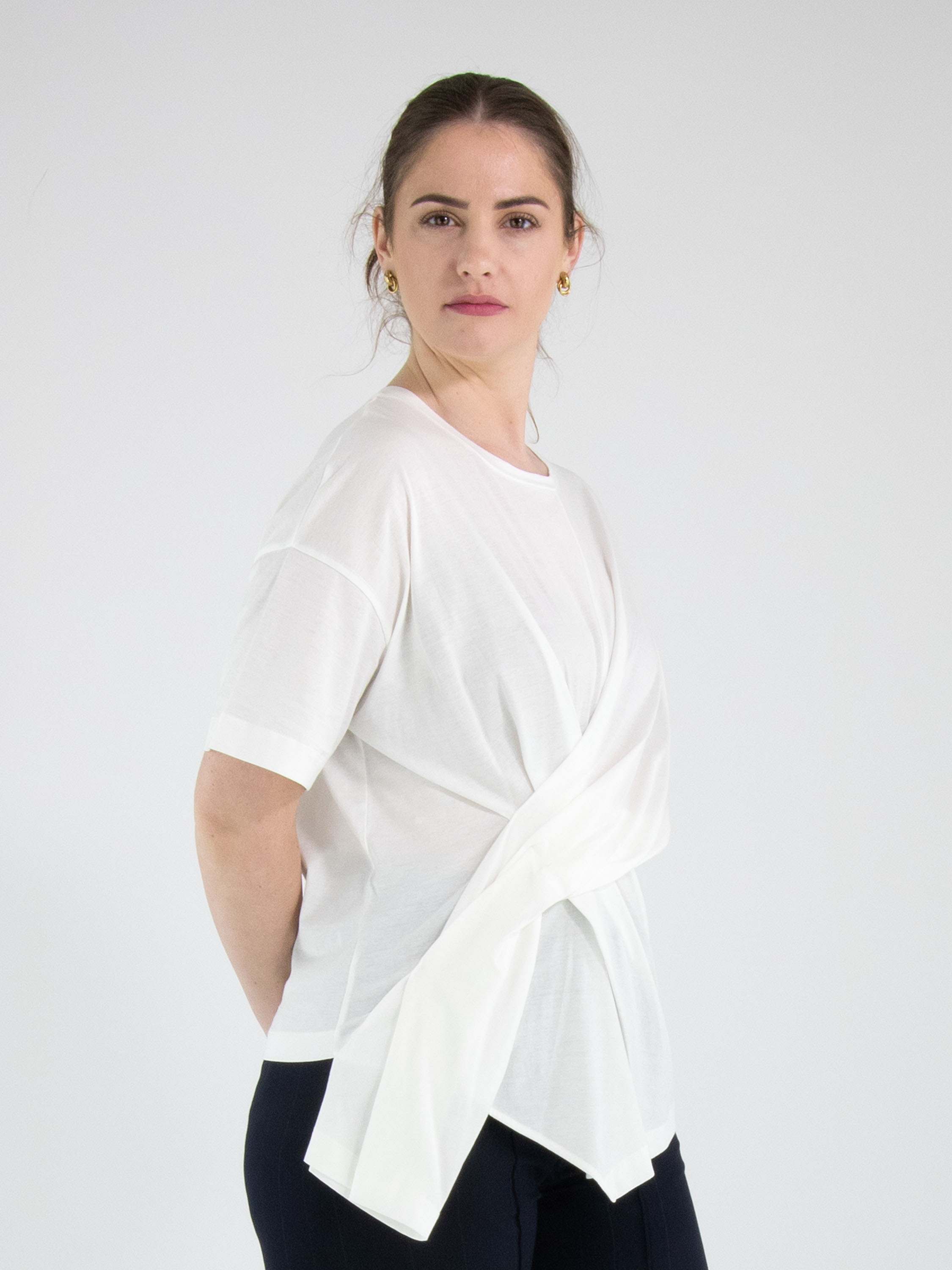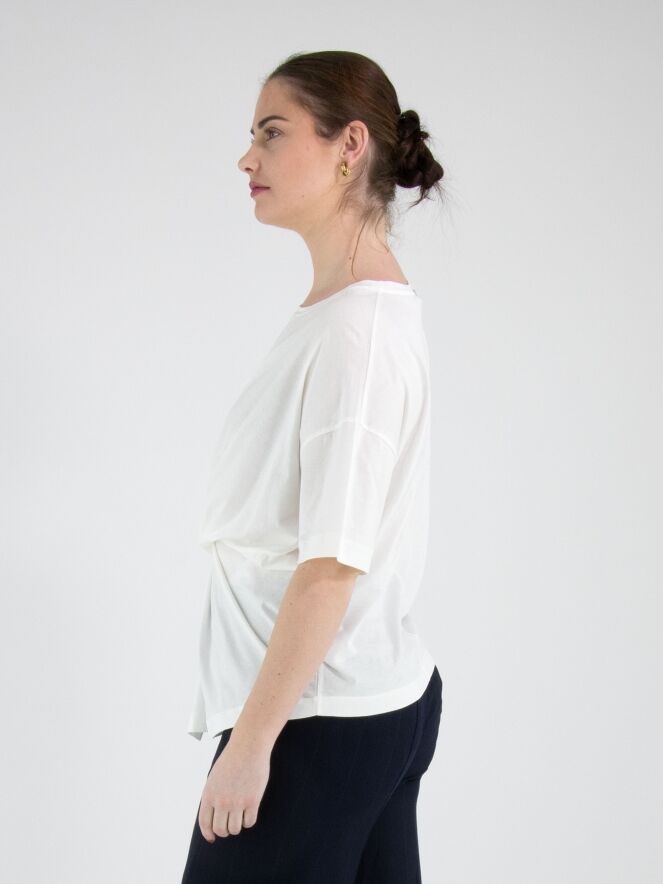 A shirt from High in an off-white colour. Visually, the shirt has a wrap effect created by subtle pleats on the right side of the waist. The shirt features a round neckline and short sleeves. This shirt can be hand-washed.
