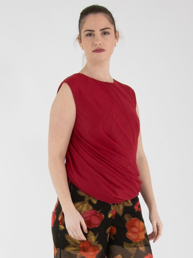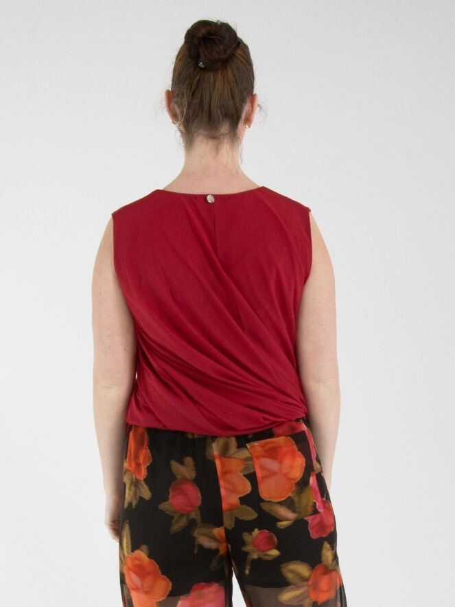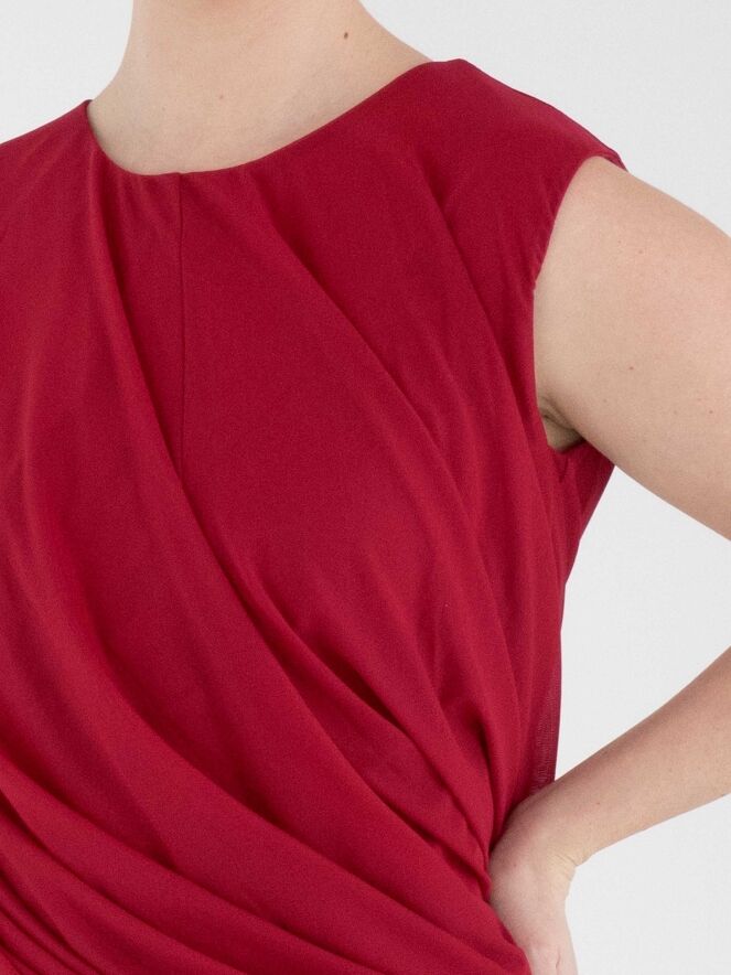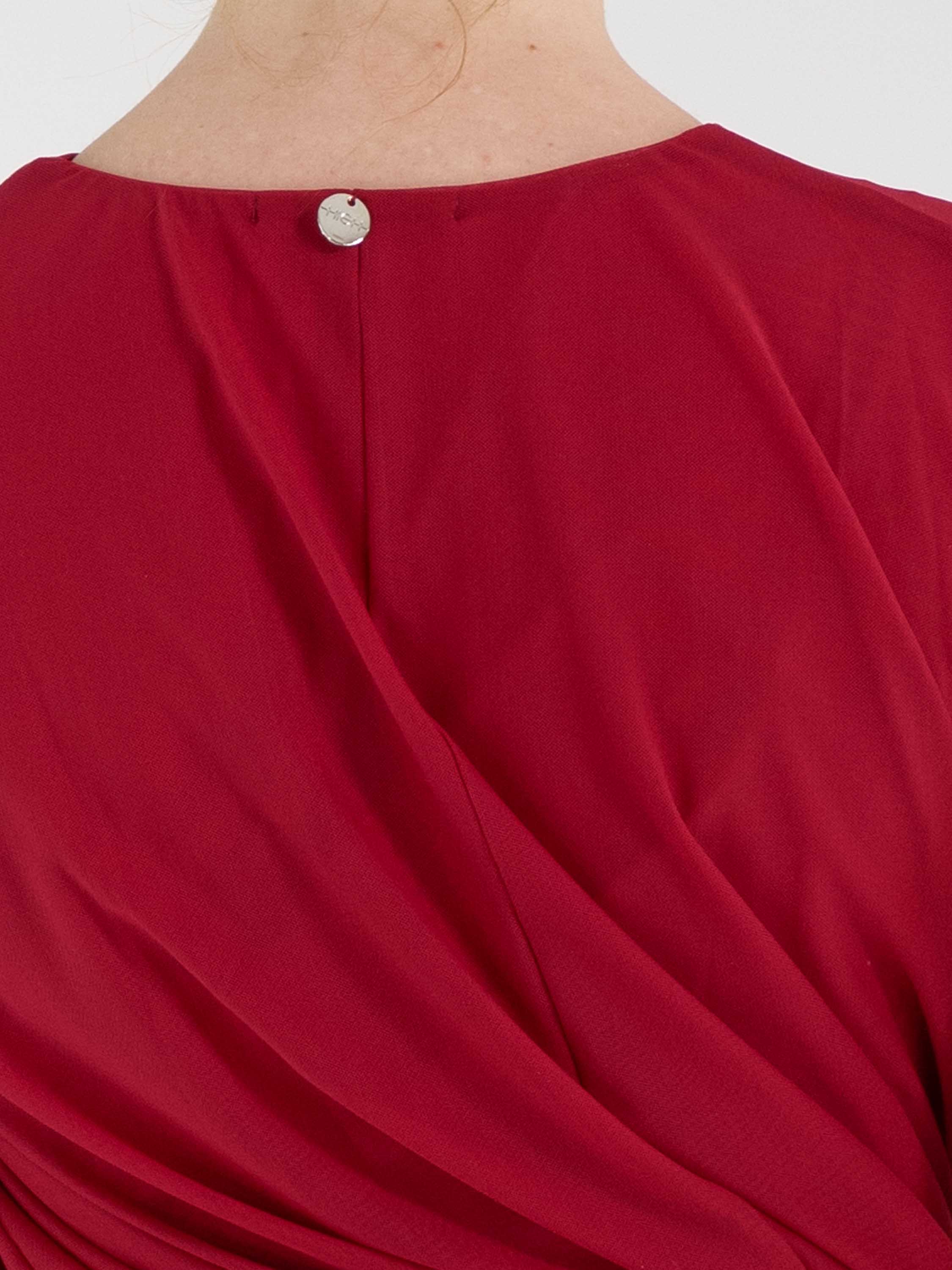 A top by High in raspberry red. The top is designed with a double-layered fabric that is twisted on the inside, creating a unique draping effect. The top features a round neckline and can be hand-washed.