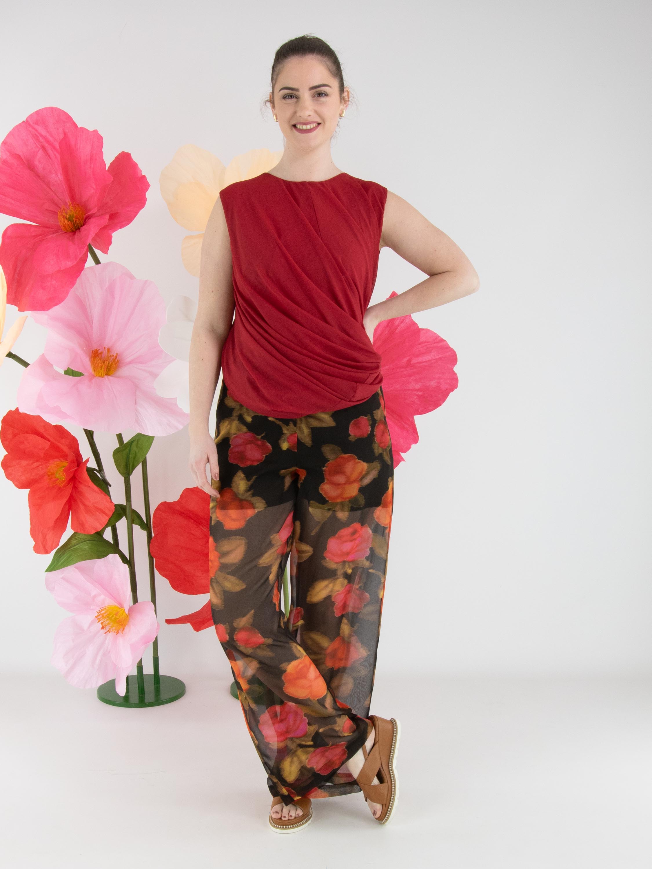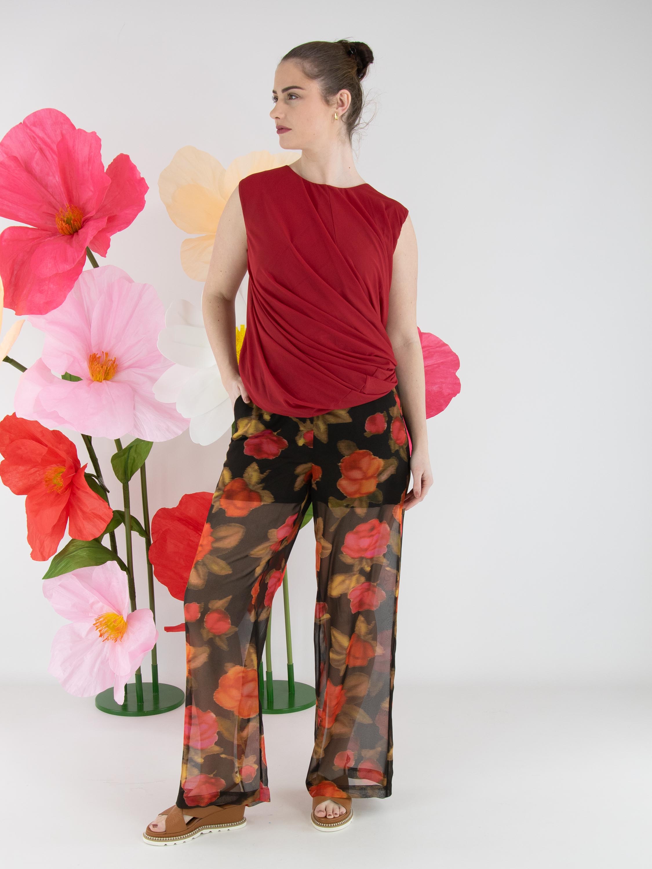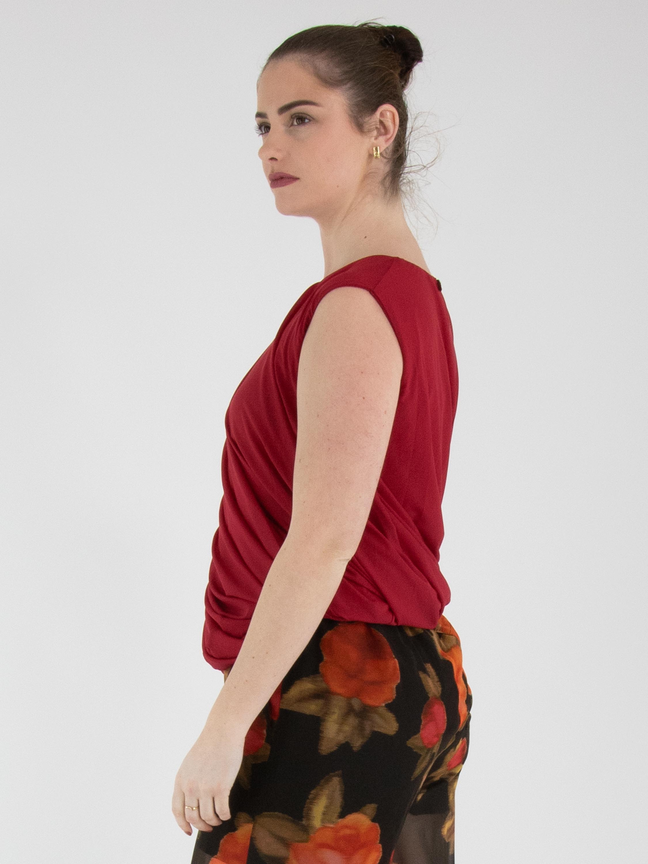 A top by High in raspberry red. The top is designed with a double-layered fabric that is twisted on the inside, creating a unique draping effect. The top features a round neckline and can be hand-washed.