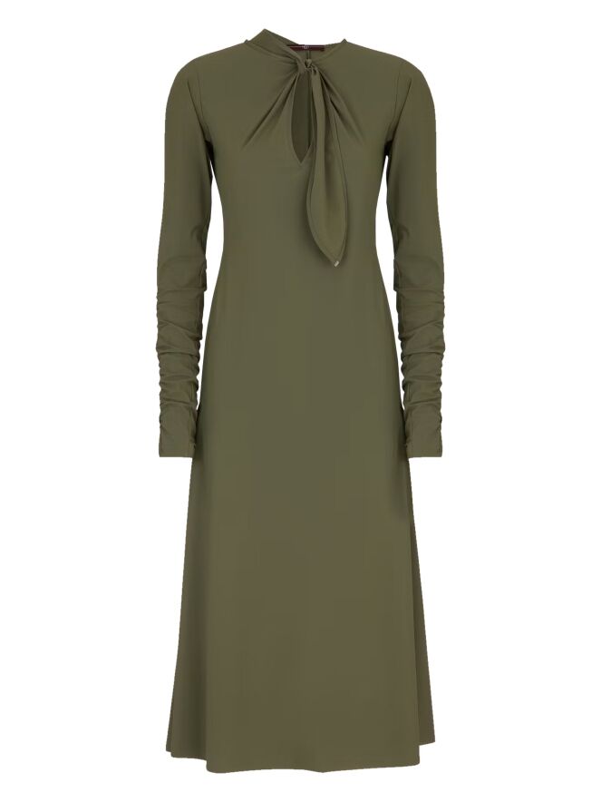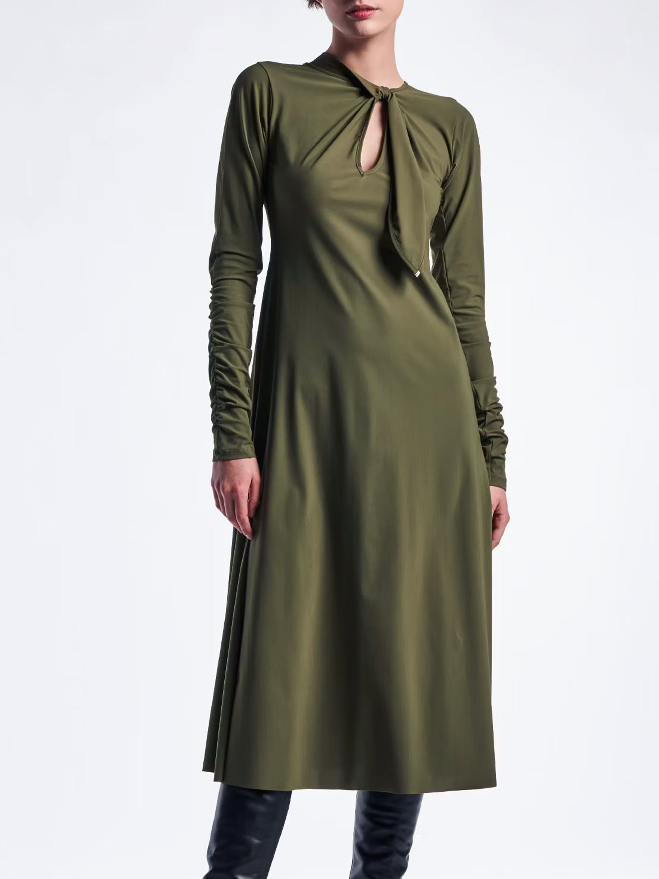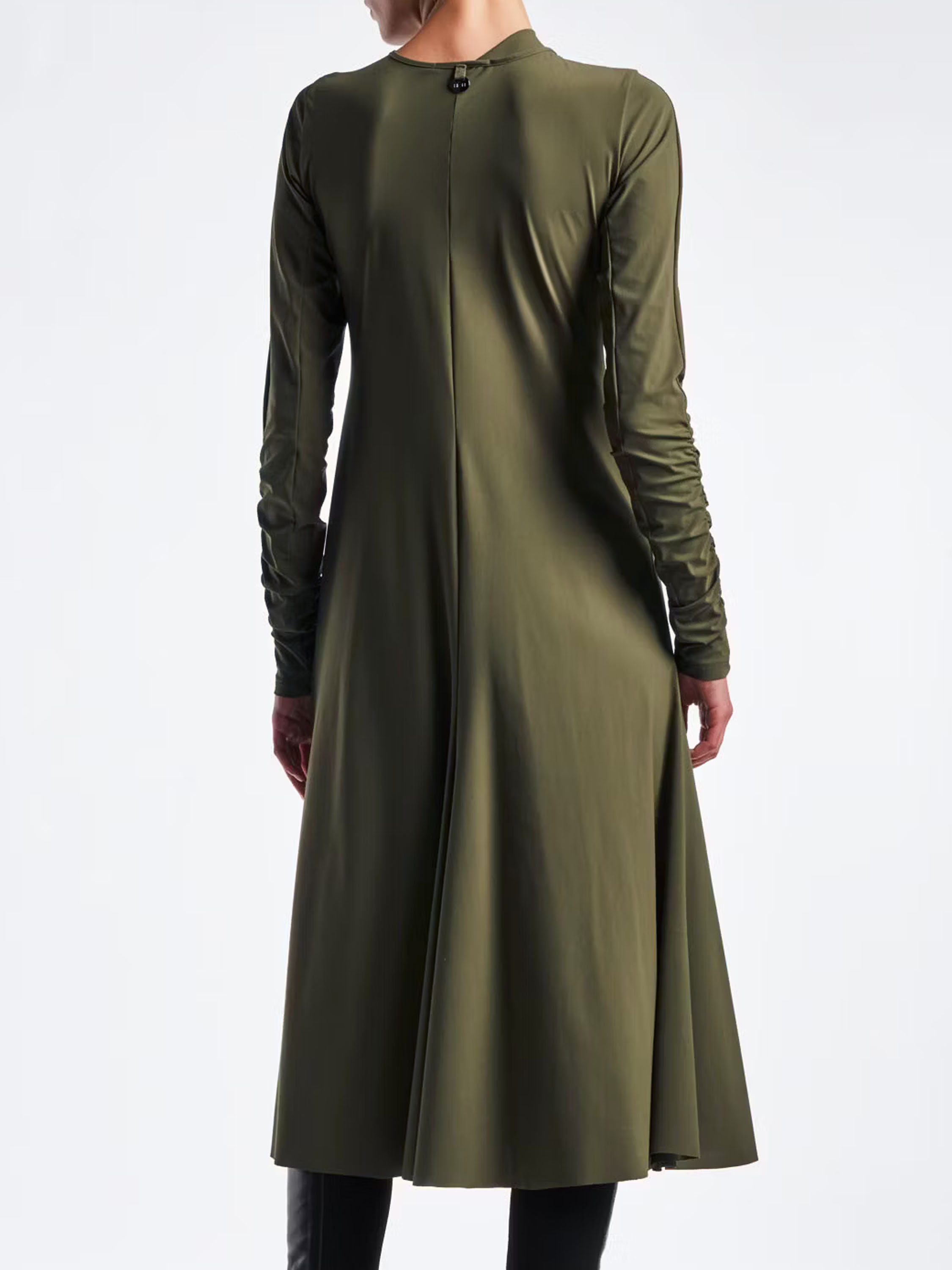 A dress by High in olive green color. In the center of the high round neckline, there is a wrap-over with a cut-out extending to the bust. The fabric of the long sleeves is finely pleated along the seam from the elbow. From the waist, the dress has a slight A-line shape. This dress can be hand-washed.