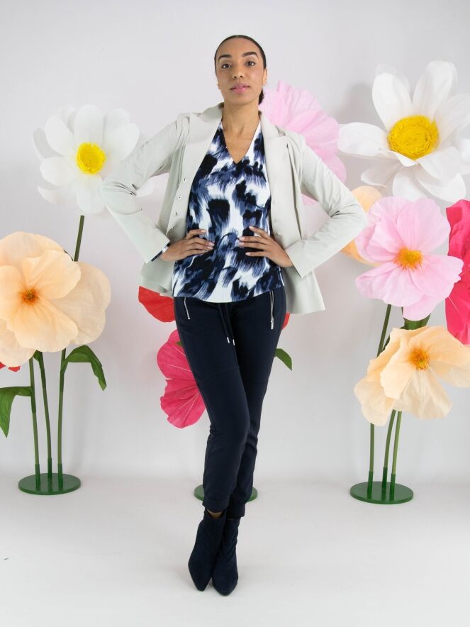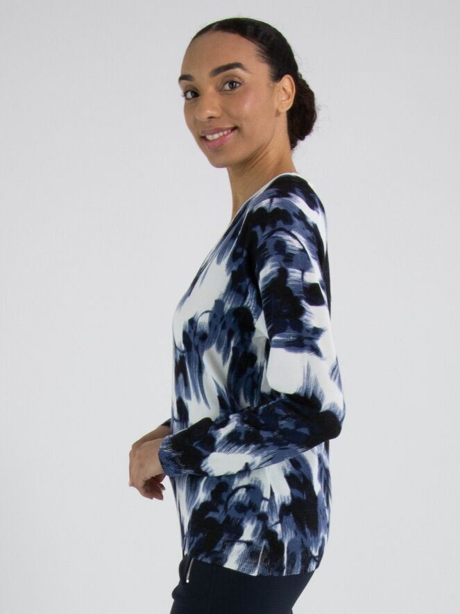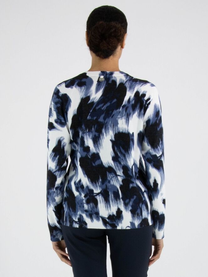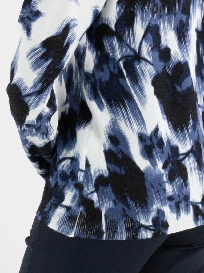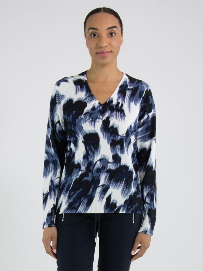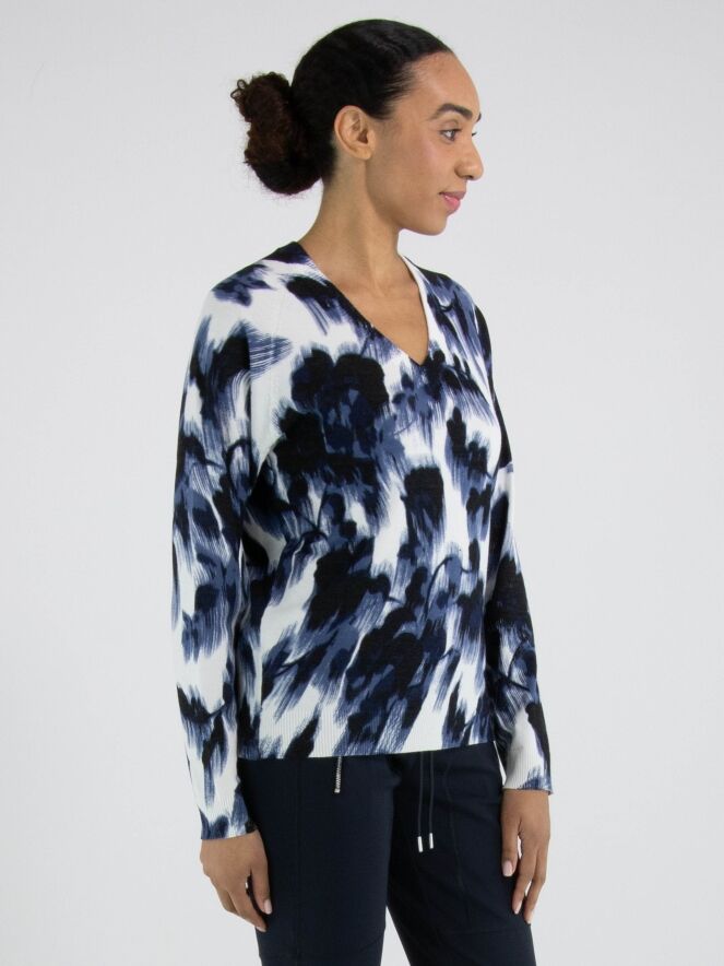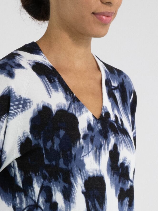 A pullover from High Tech with a graphic print in various shades of blue. Along the edge of the V-neckline, the ends of the long sleeves and the hem, there is a finely ribbed knit trim. This pullover must not be washed.