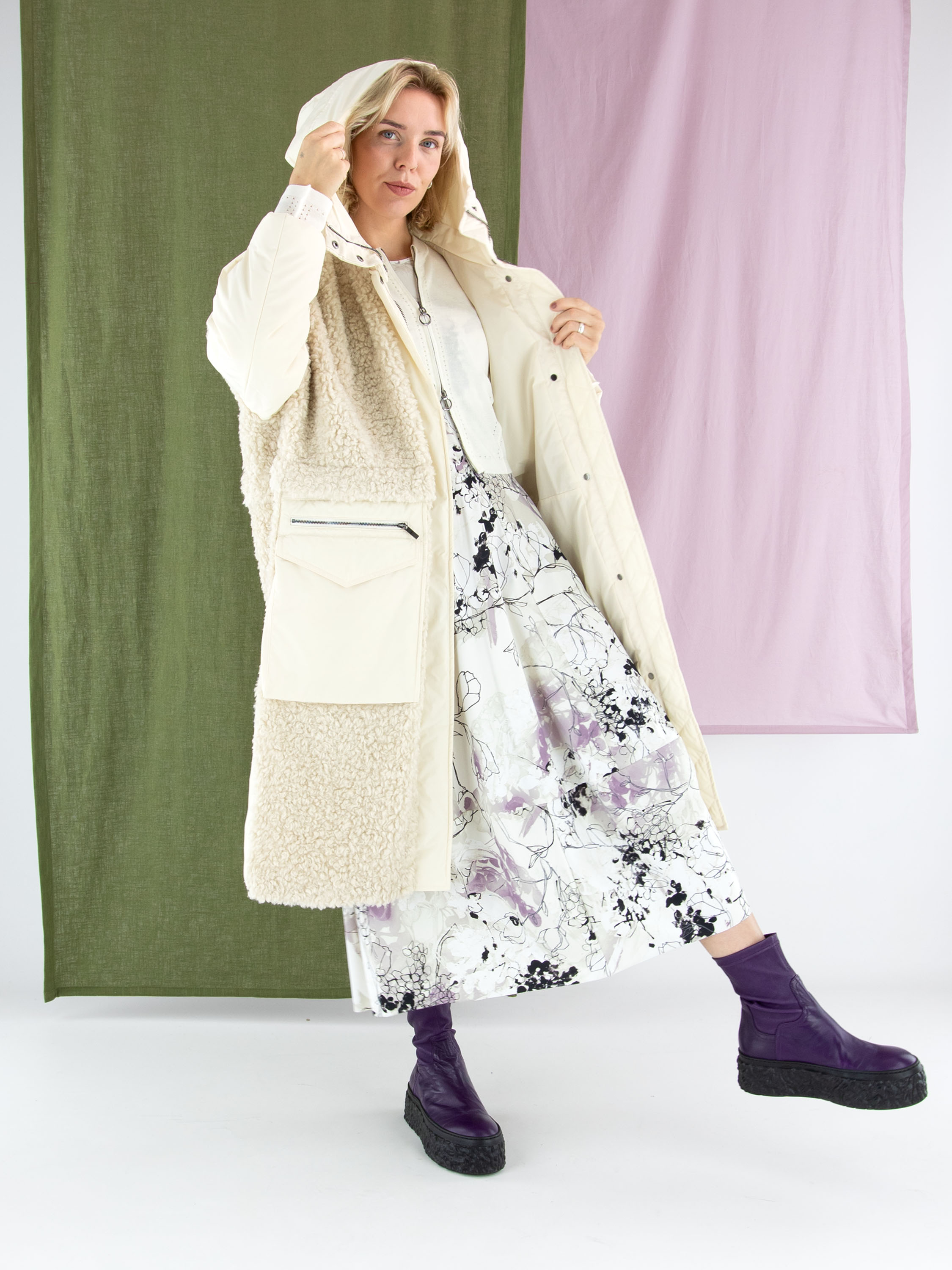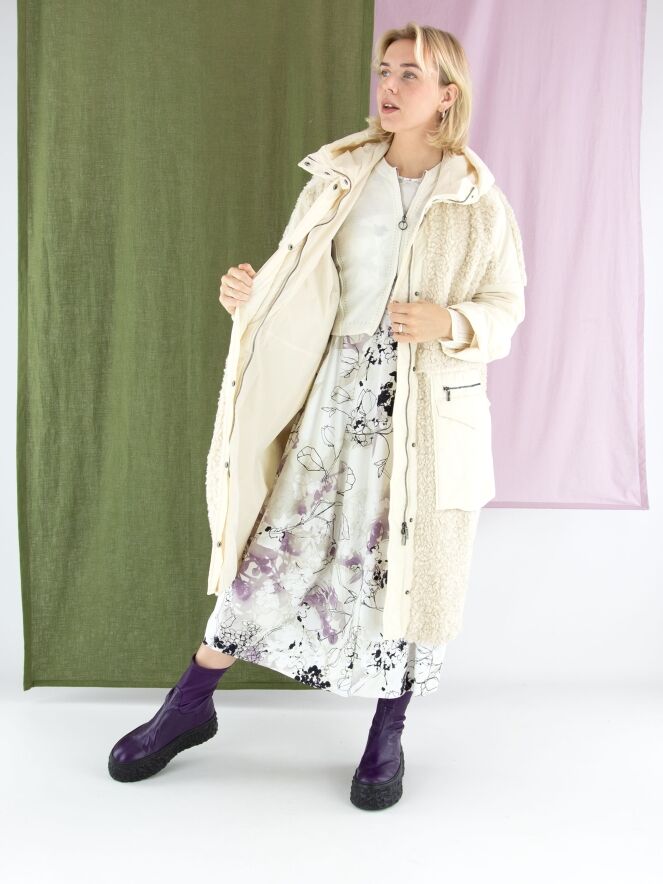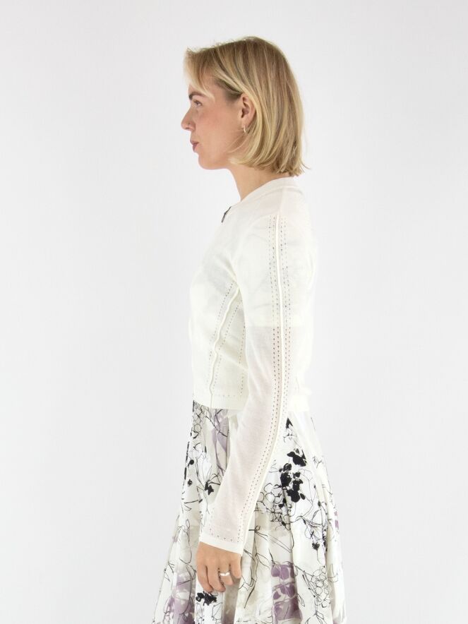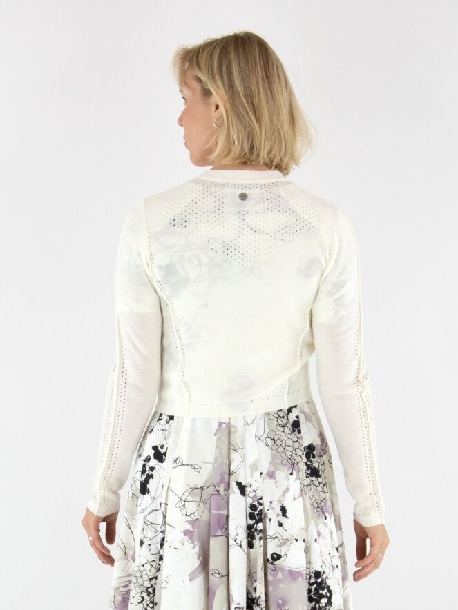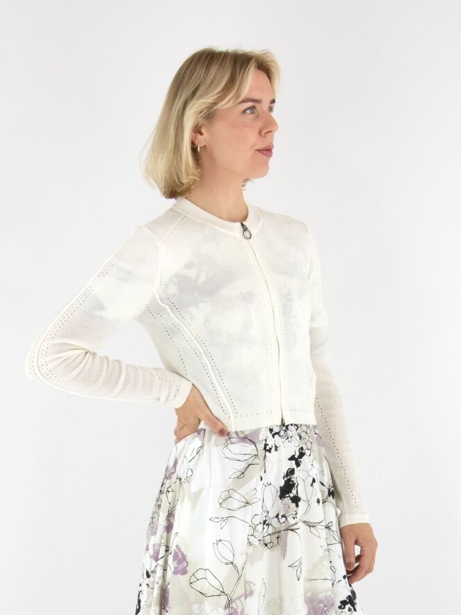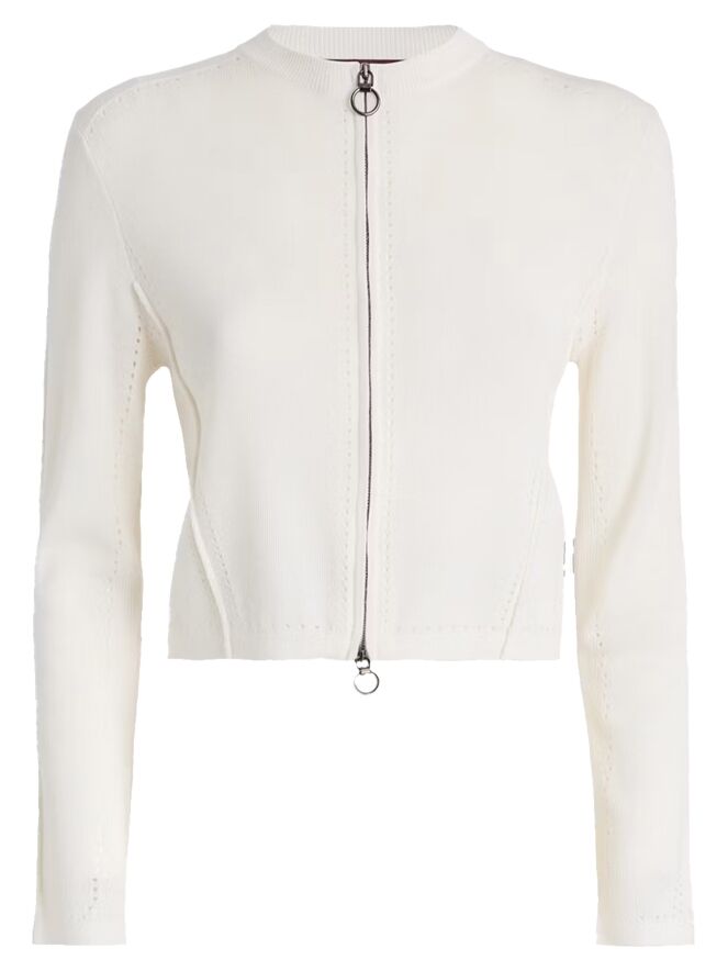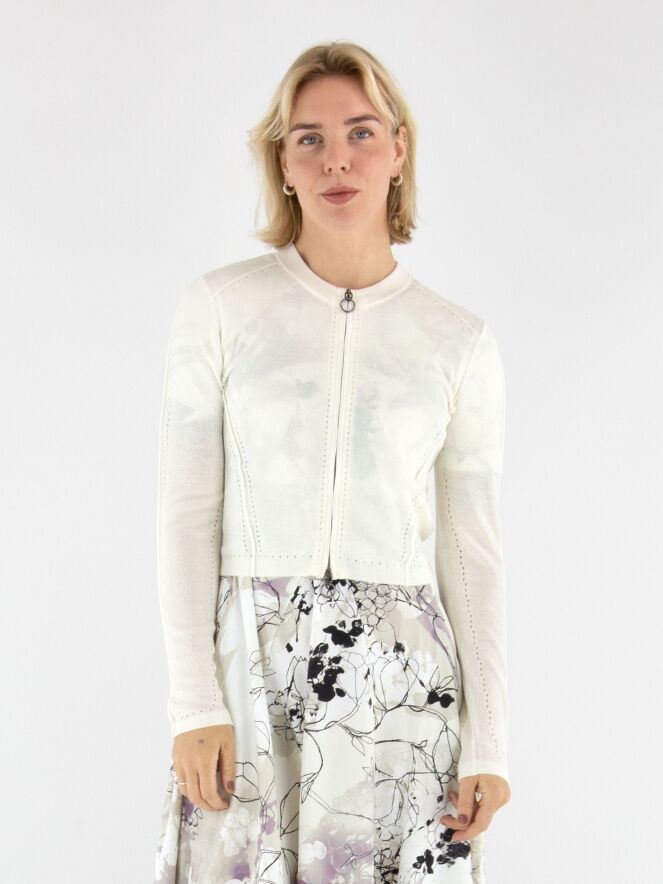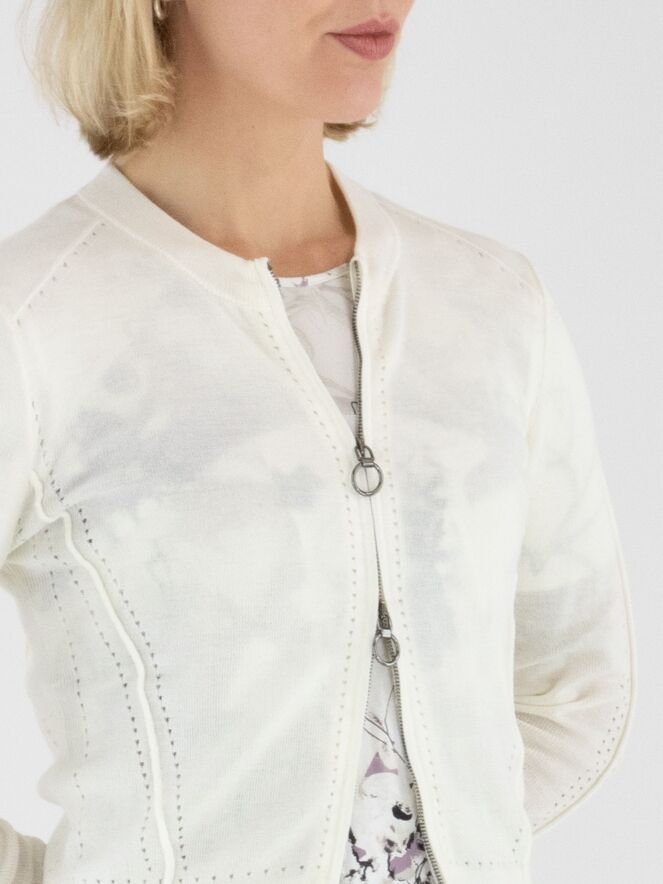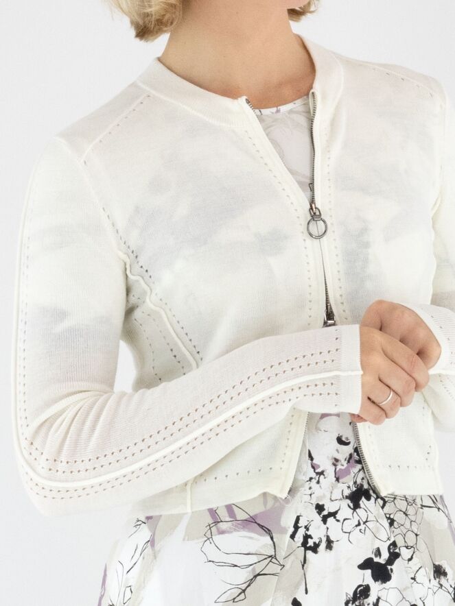 A short cardigan from High in off-white. A finely ribbed knit trim runs along the round neckline. Delicate openwork lines are incorporated along the zipper, the sides, and across the long sleeves, giving the cardigan a refined and airy look. This cardigan can be hand-washed.