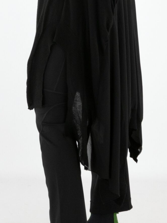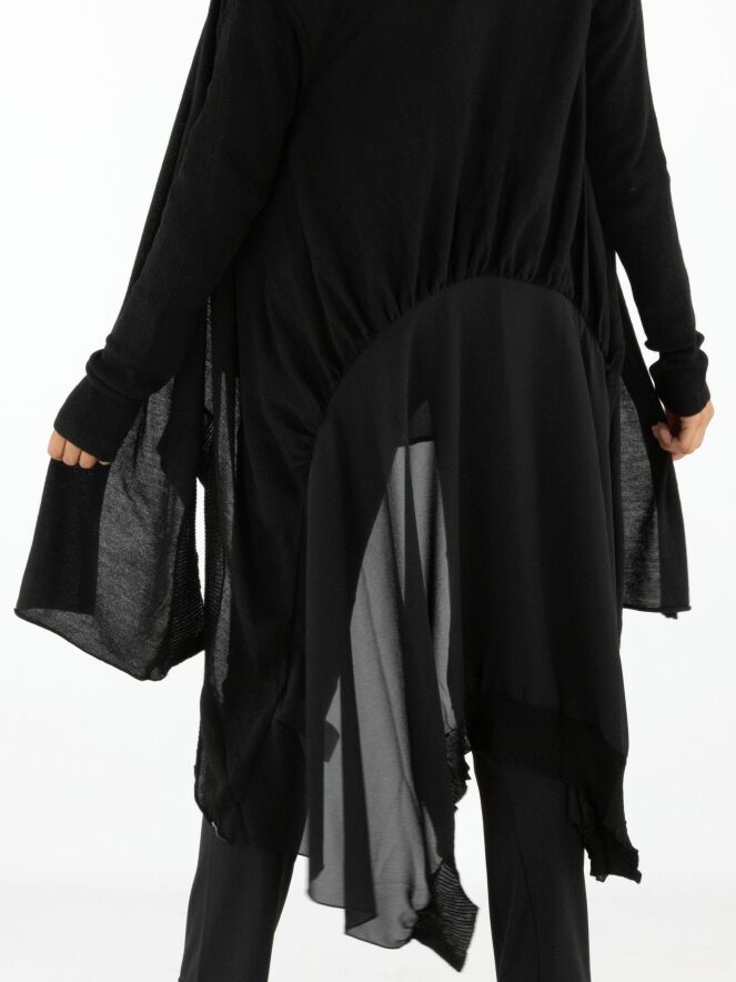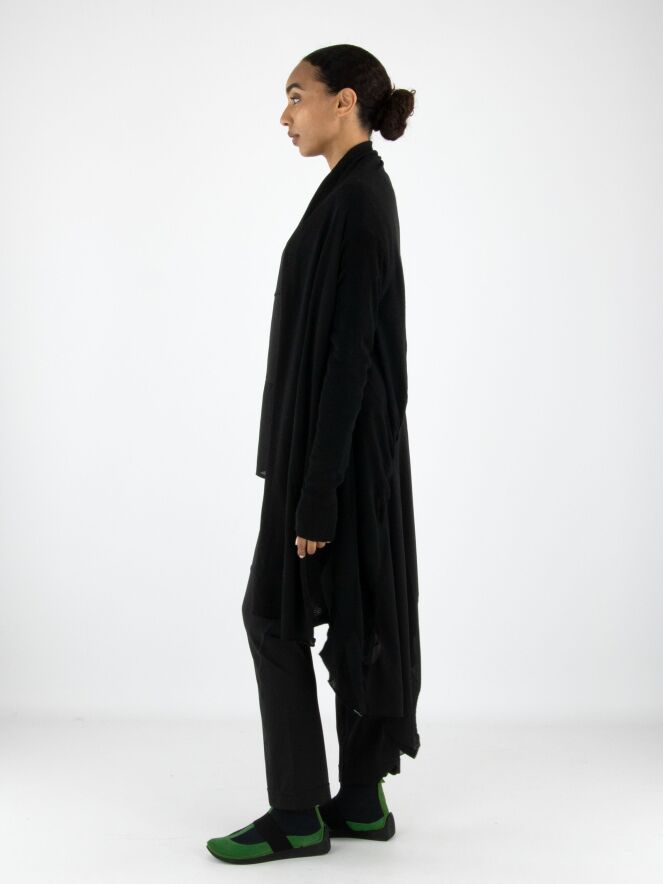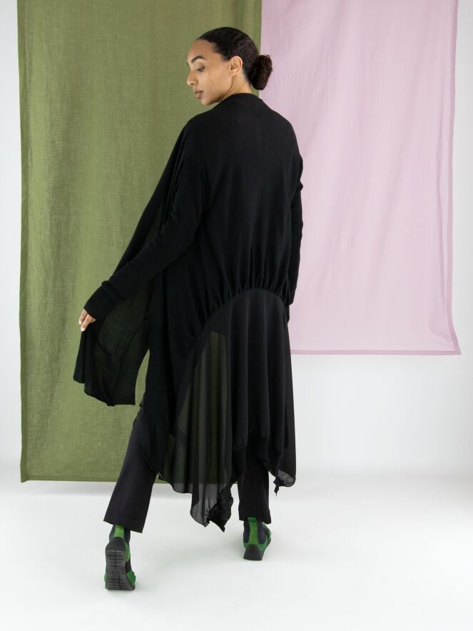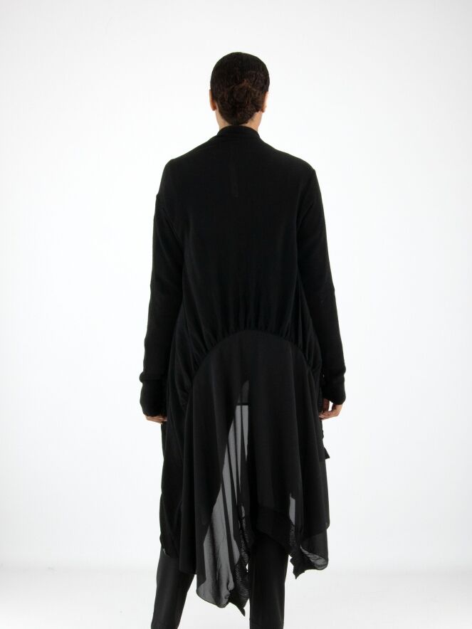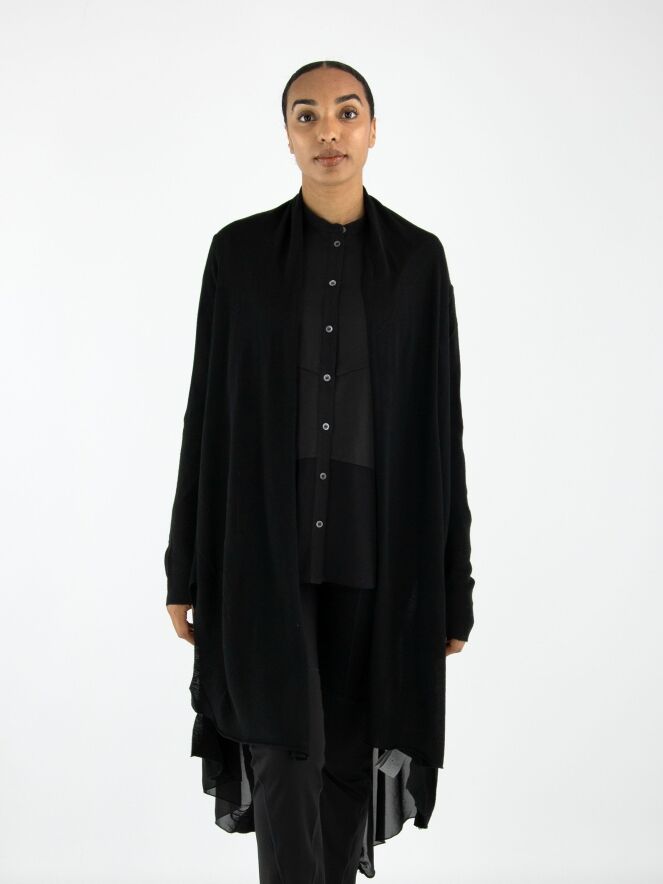 A long, luxurious cardigan by High in black. The cardigan features a shawl collar and has no fastening. At the back, at waist height, there is a curved seam below which the fabric is transparent. This cardigan should be hand-washed.