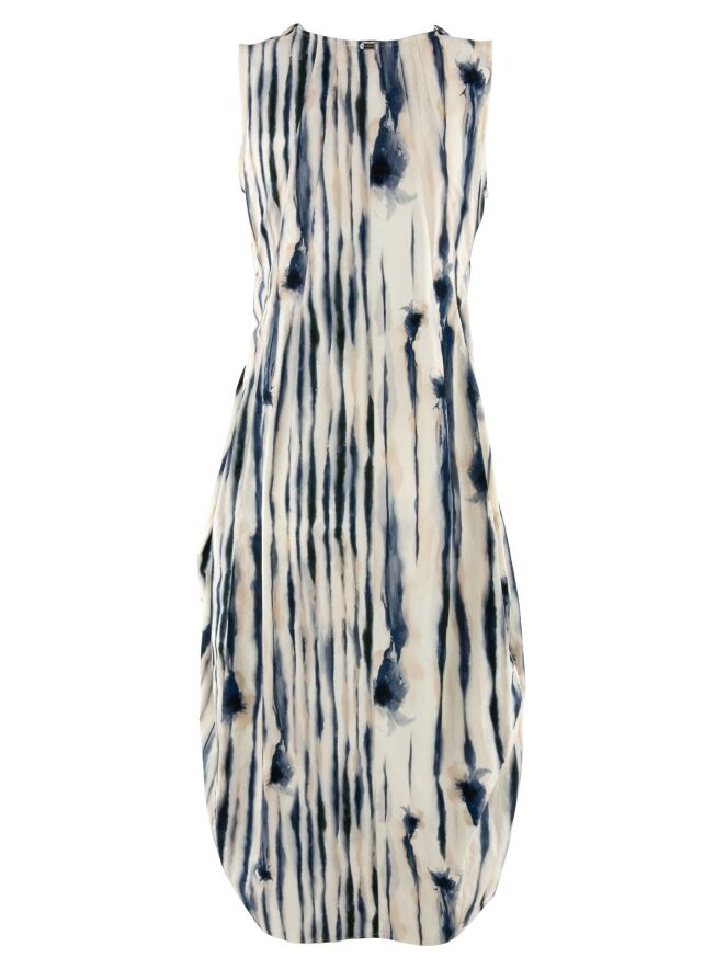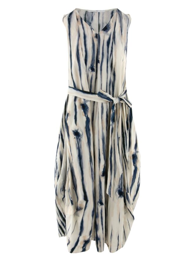 Dress by High featuring a graphic paint print with vertical lines in multiple shades of blue on an off-white background. At the waist, a belt in the same fabric as the dress is integrated and runs through the inside at the back, subtly defining the silhouette. From the waist down, the dress develops a gentle balloon shape, creating a contemporary and playful effect. Side pockets are positioned at waist level. This dress can be washed at 30 degrees.