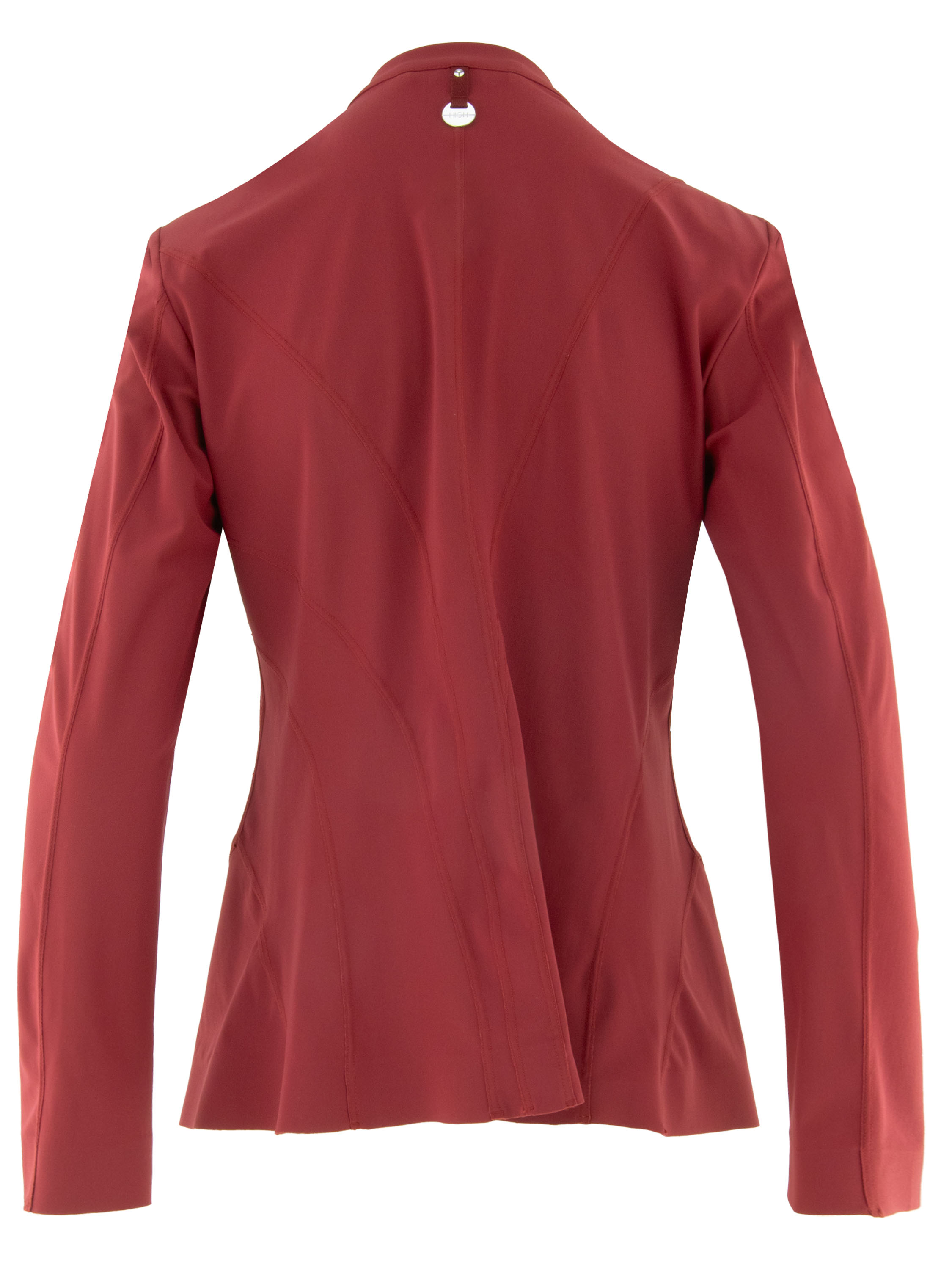 Blazer by High in a rich raspberry red shade. The design features a teardrop-shaped V-neckline and a closure with three snap buttons. Diagonal seams create a beautifully tailored silhouette. The blazer is unlined, ensuring a light and fluid drape. This blazer should be hand-washed.