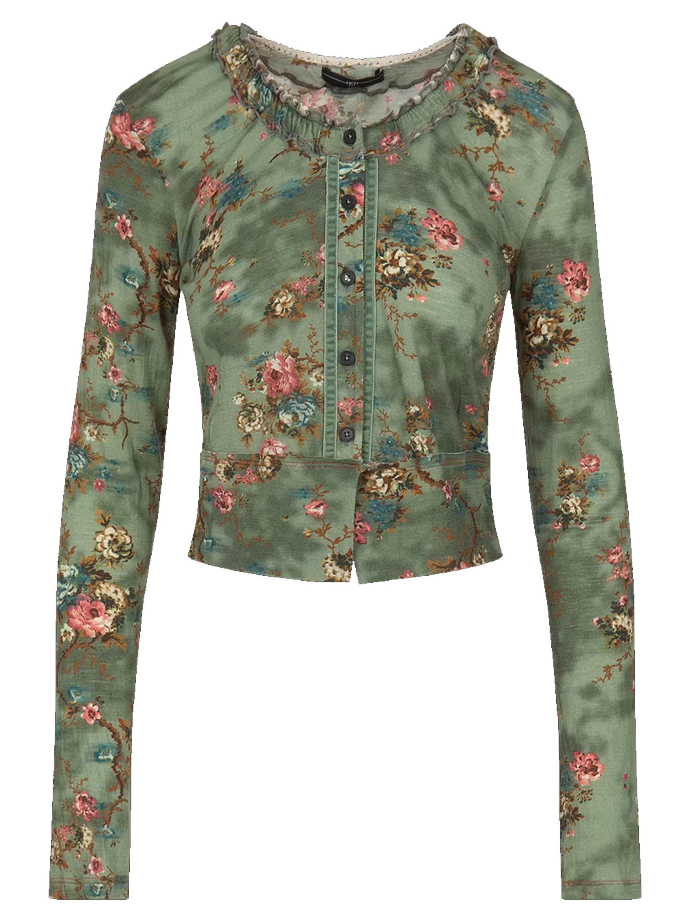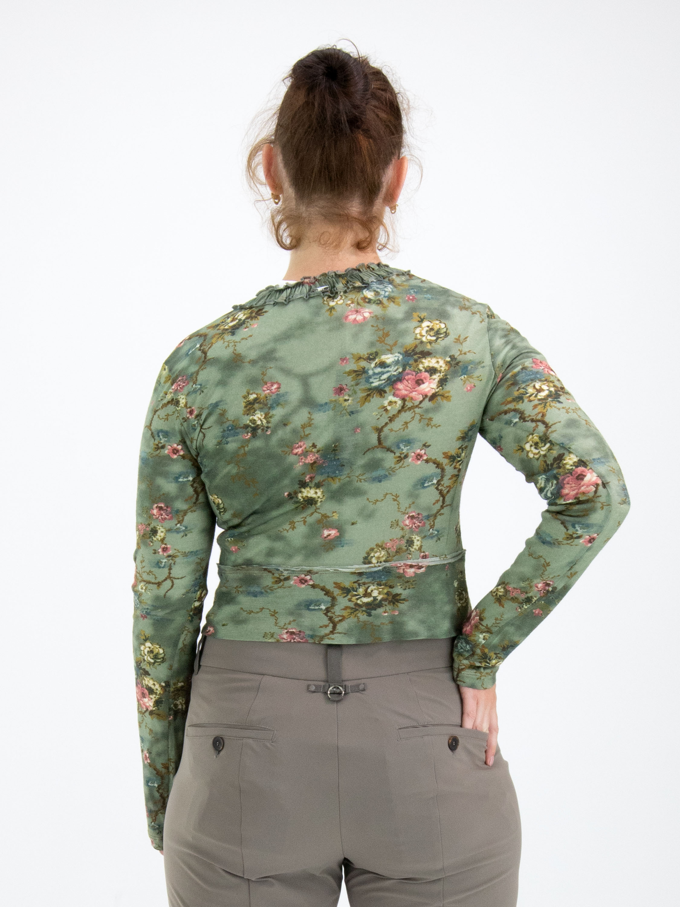 A short cardigan from High in a floral print with multiple shades of blue, taupe, and red on an olive green background. Along the round neckline, there is a trim where the fabric is finely pleated along both edges. Along the button closure, there is a velvet trim on both sides. This cardigan can be hand washed.