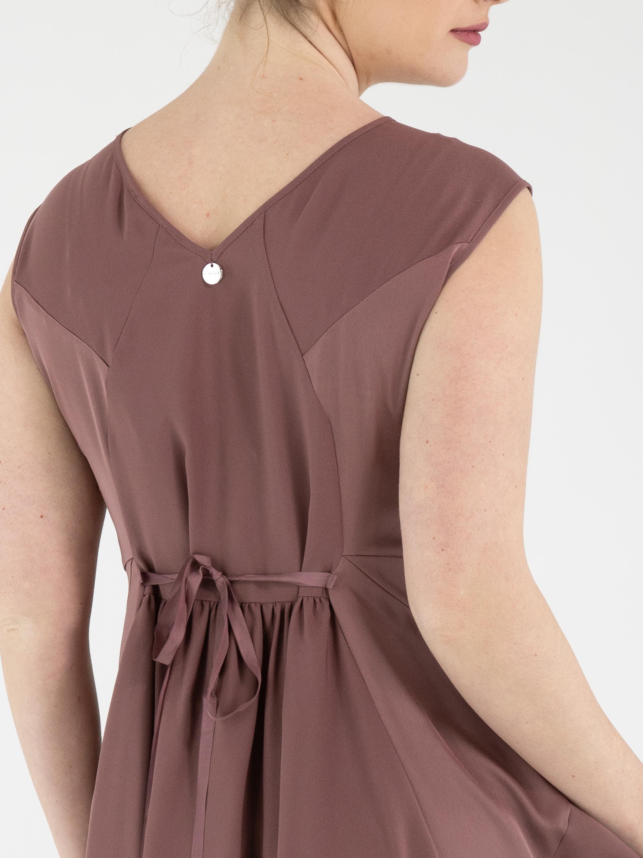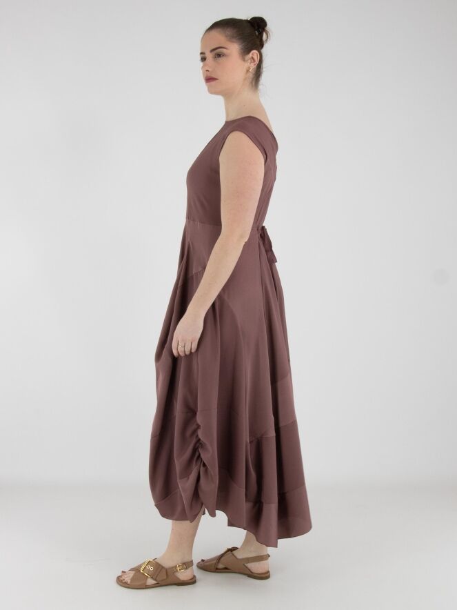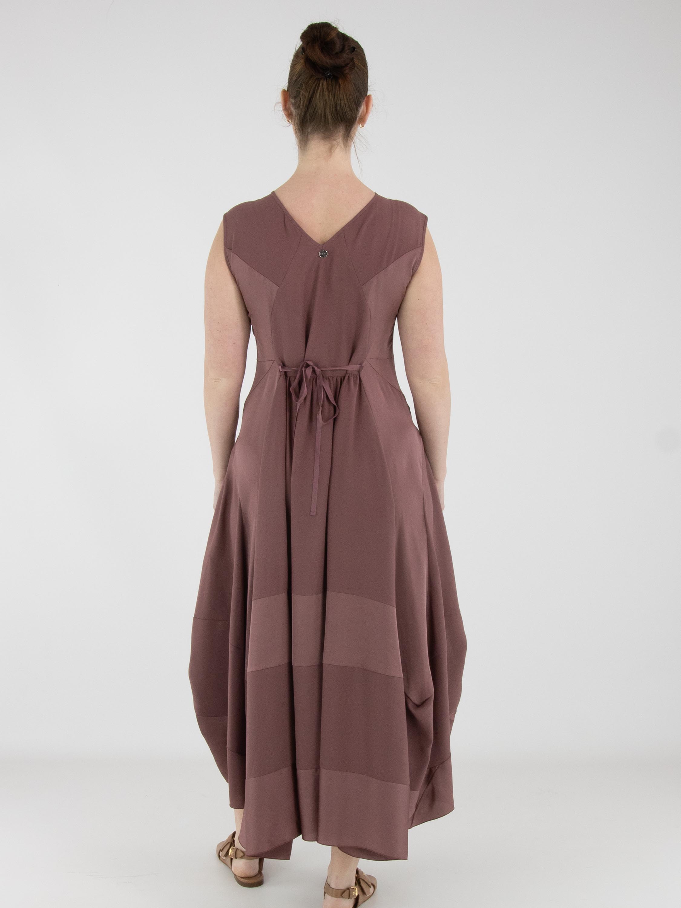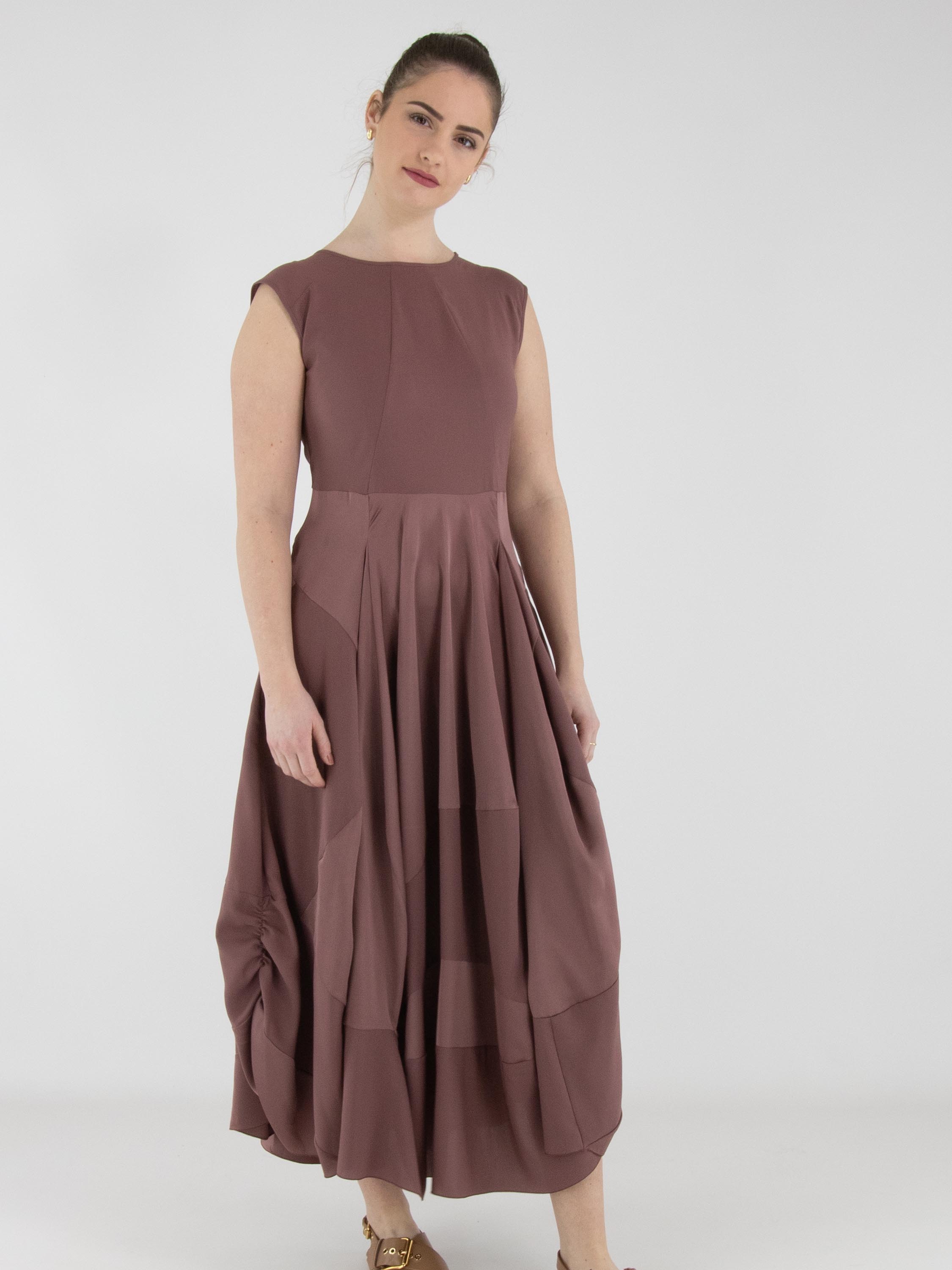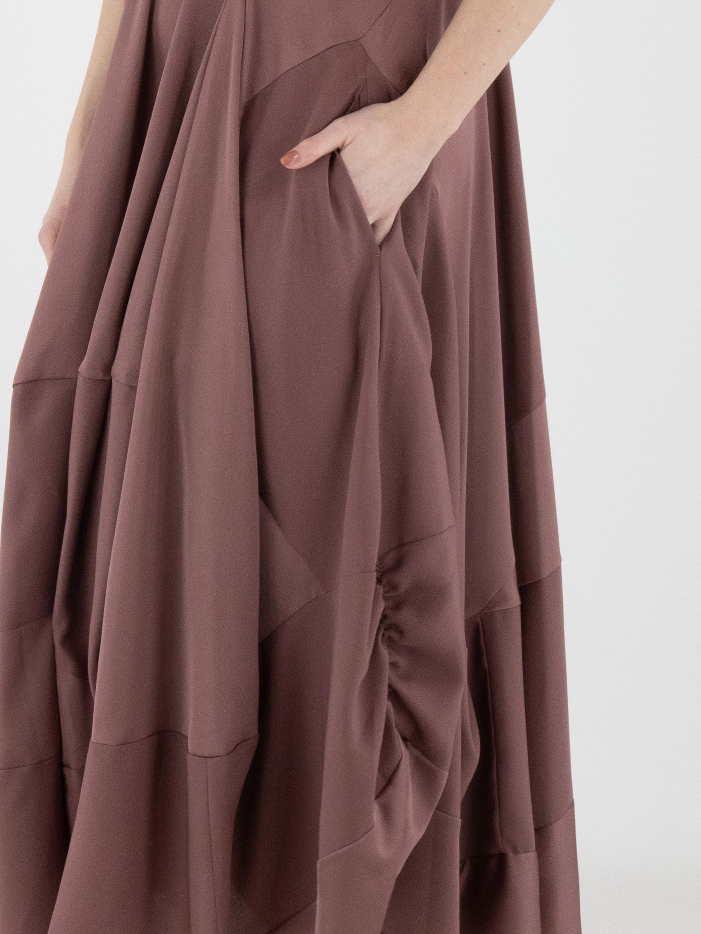 A dress by High in mauve. The dress features sections in matte satin combined with a matte fabric. From the waist, the silhouette flares into a wide A-line shape. Side pockets are positioned at waist level. This dress can be hand-washed.