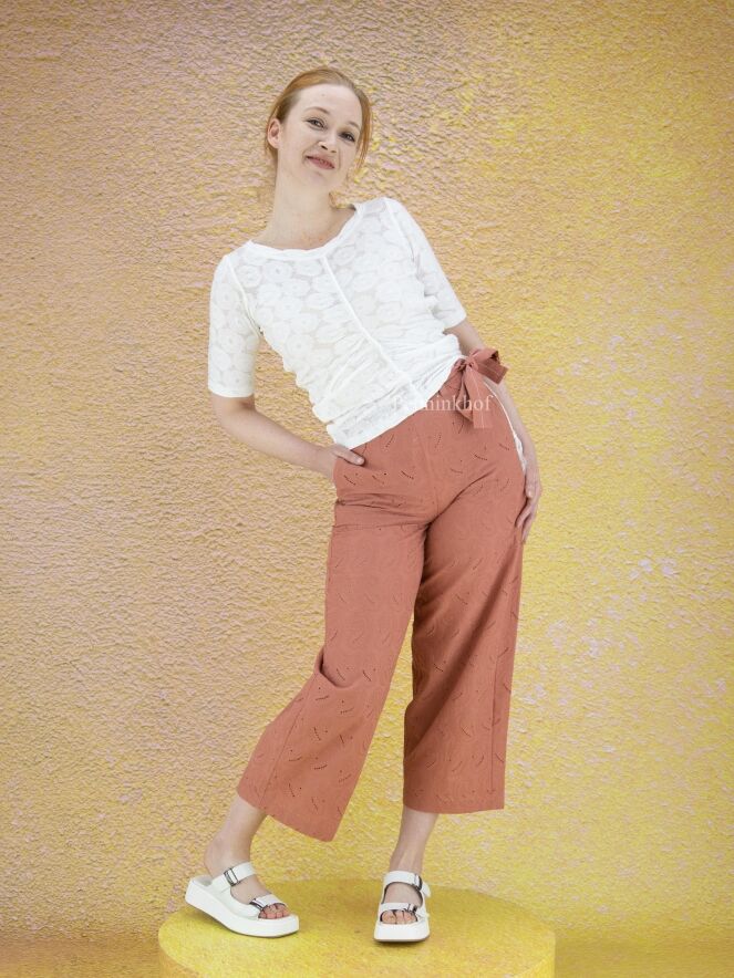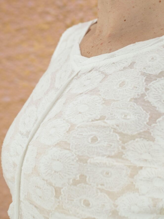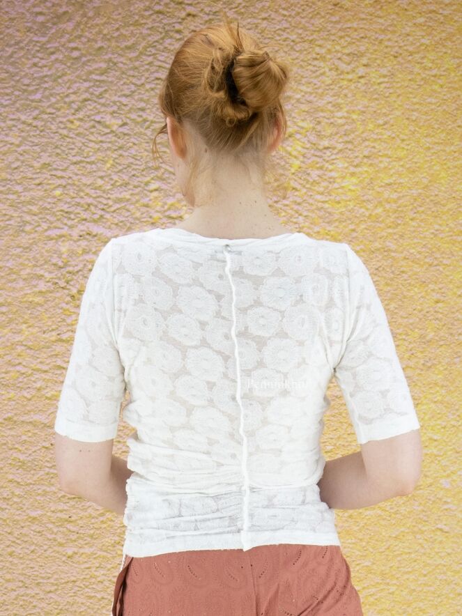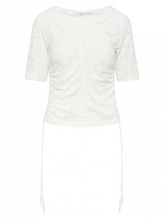 A slightly transparent shirt from High in a floral pattern in a creamy white color. Along the sides from the armpit is a cord with which a pleated effect can be created. There is a stitching seam in the middle. This shirt can be hand washed.