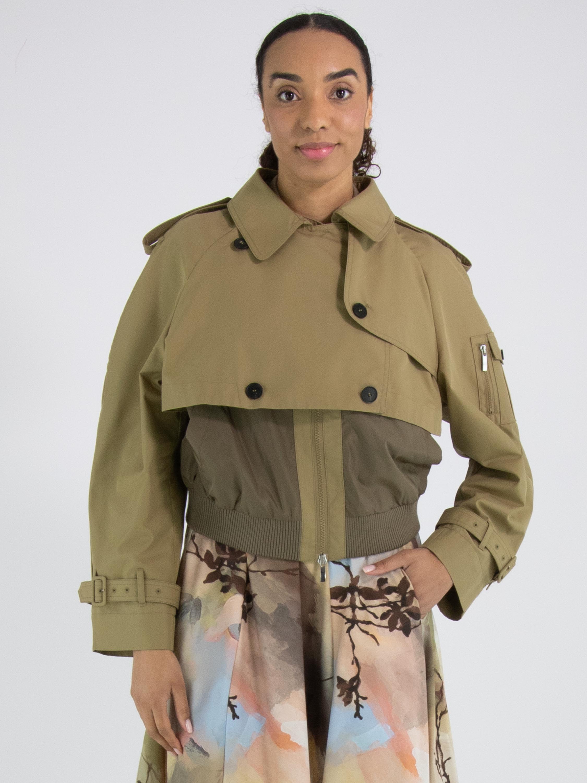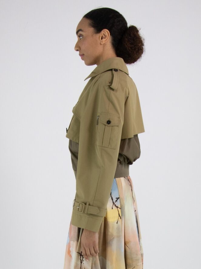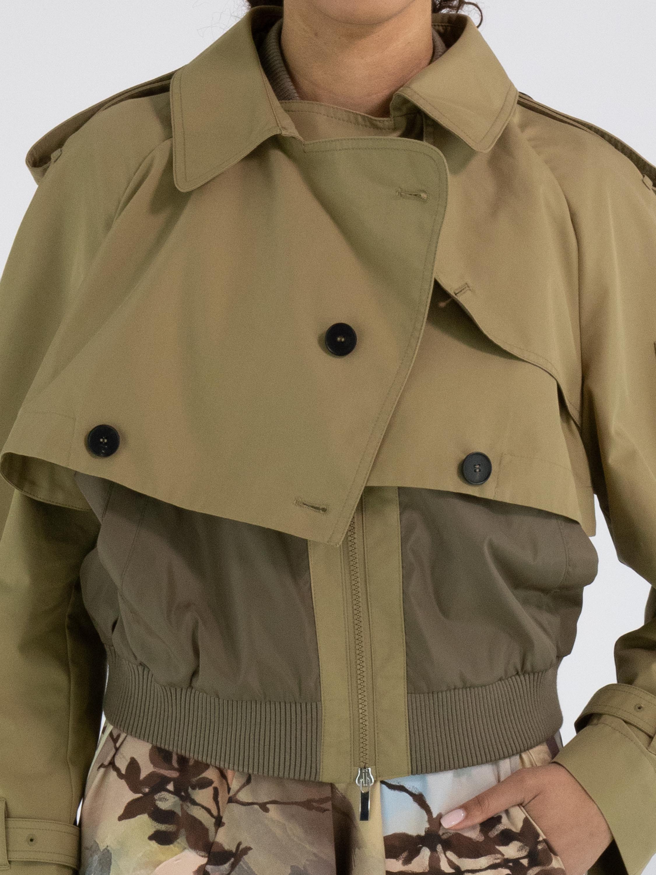 A short coat with a gabardine look from High in a rich sand color. Along the neckline and hem is a finely ribbed knit trim. The coat features slit pockets and a zipper hidden beneath the gabardine layer. The shoulders are detailed with epaulettes. This coat must not be washed.