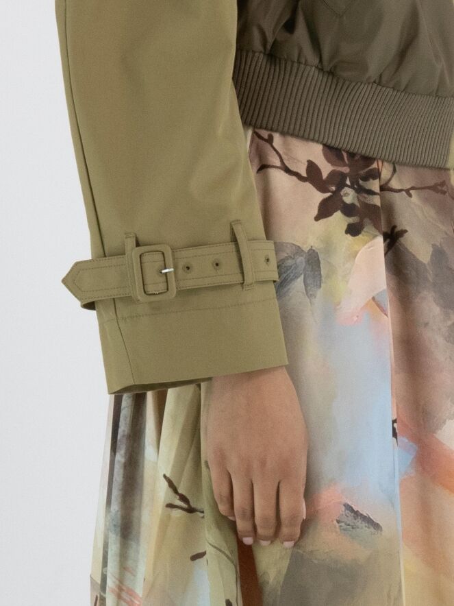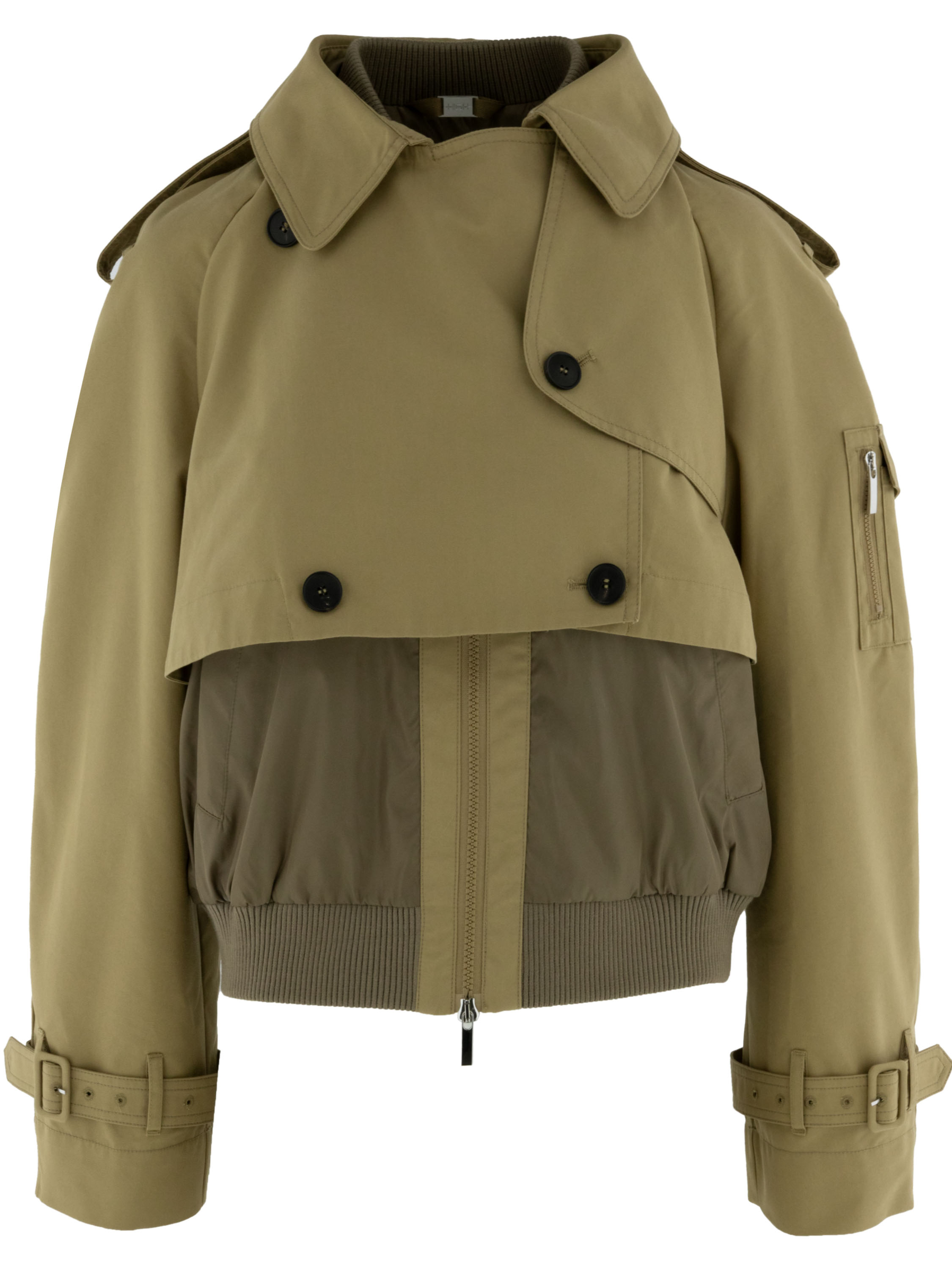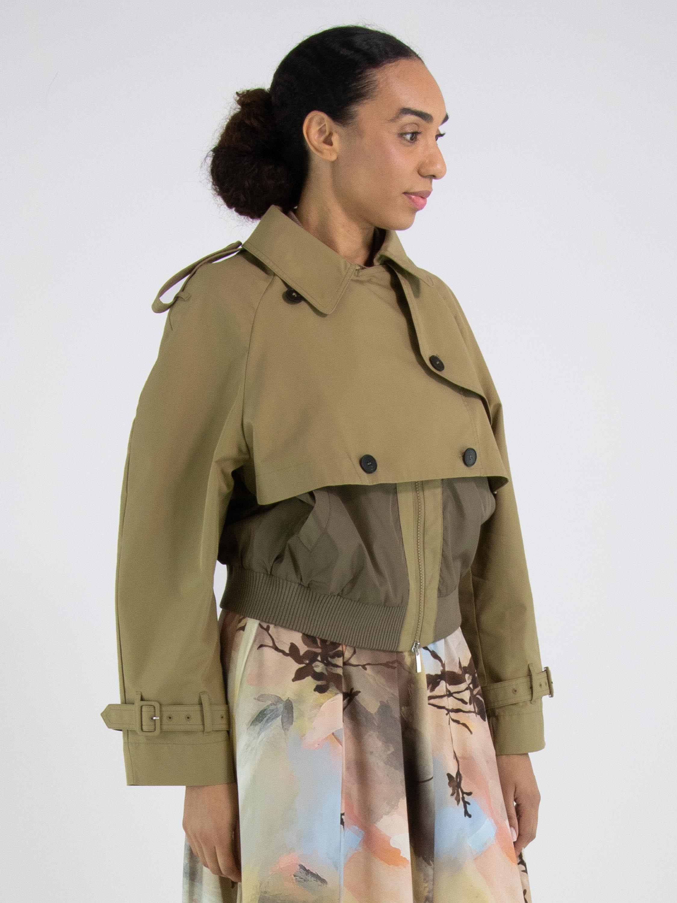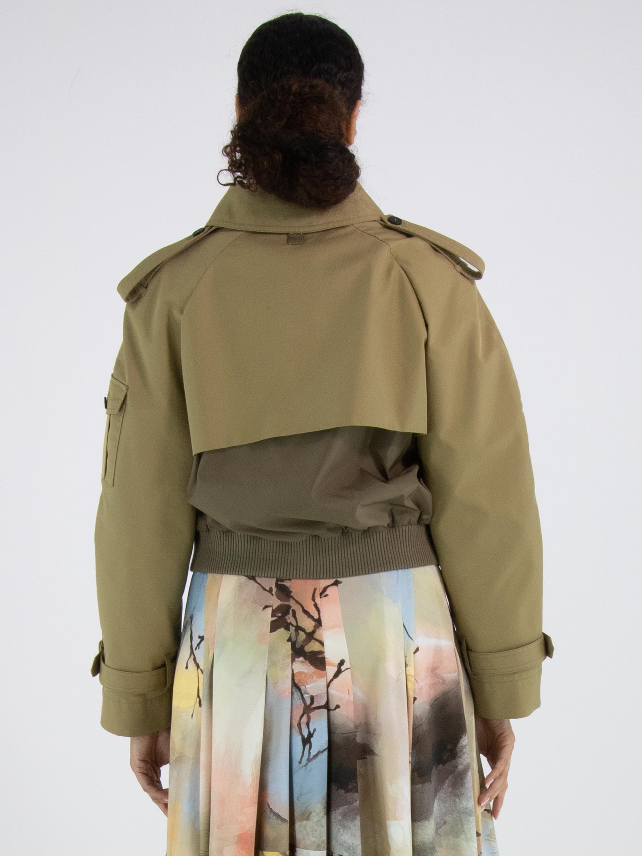 A short coat with a gabardine look from High in a rich sand color. Along the neckline and hem is a finely ribbed knit trim. The coat features slit pockets and a zipper hidden beneath the gabardine layer. The shoulders are detailed with epaulettes. This coat must not be washed.