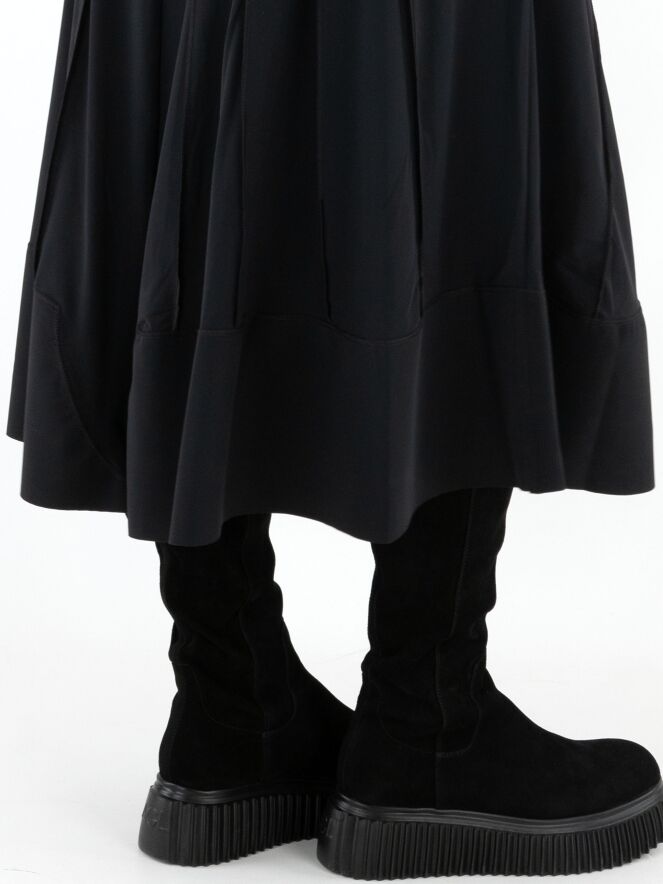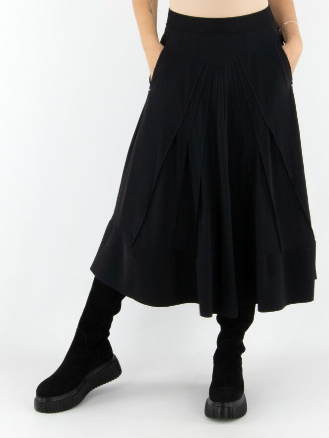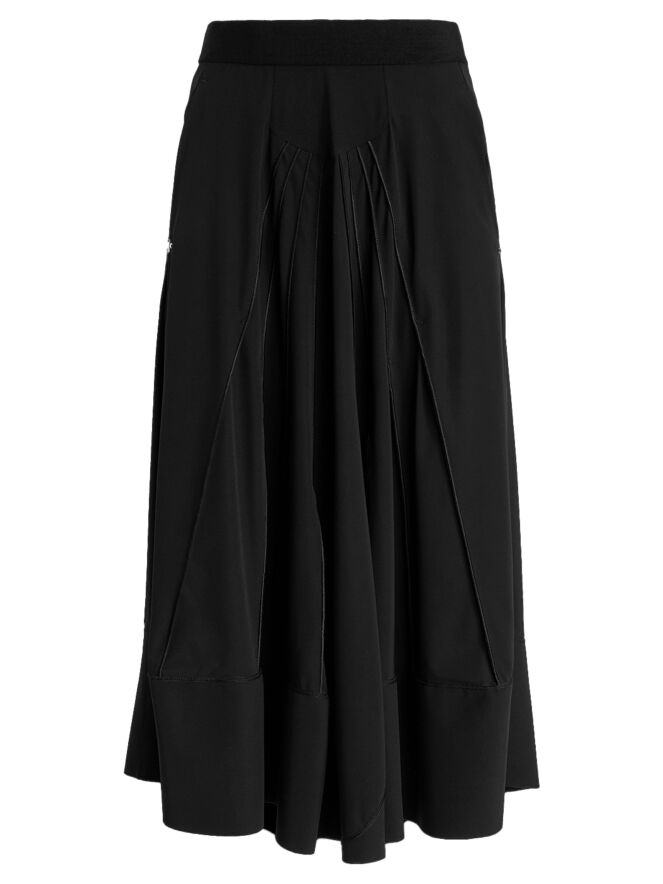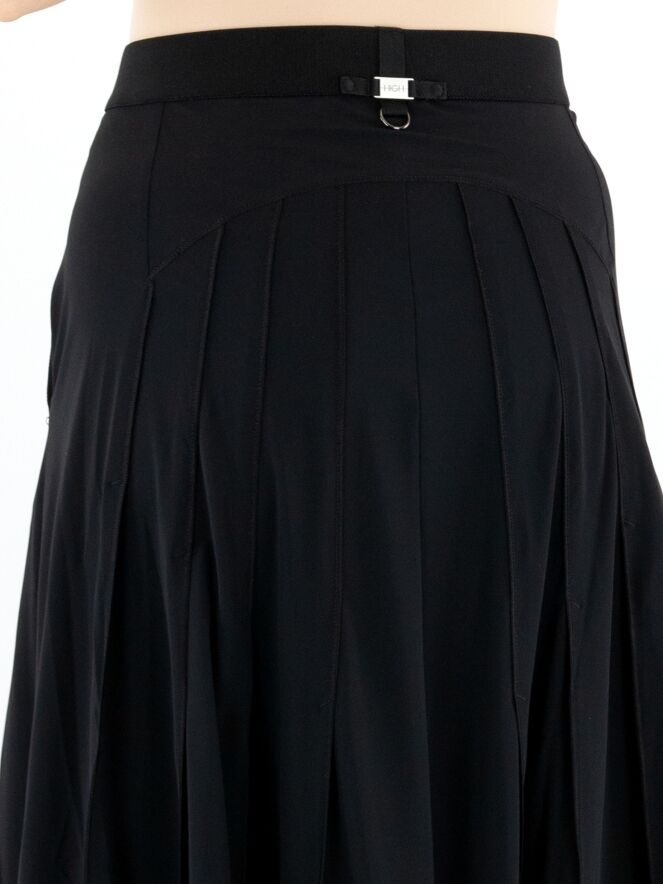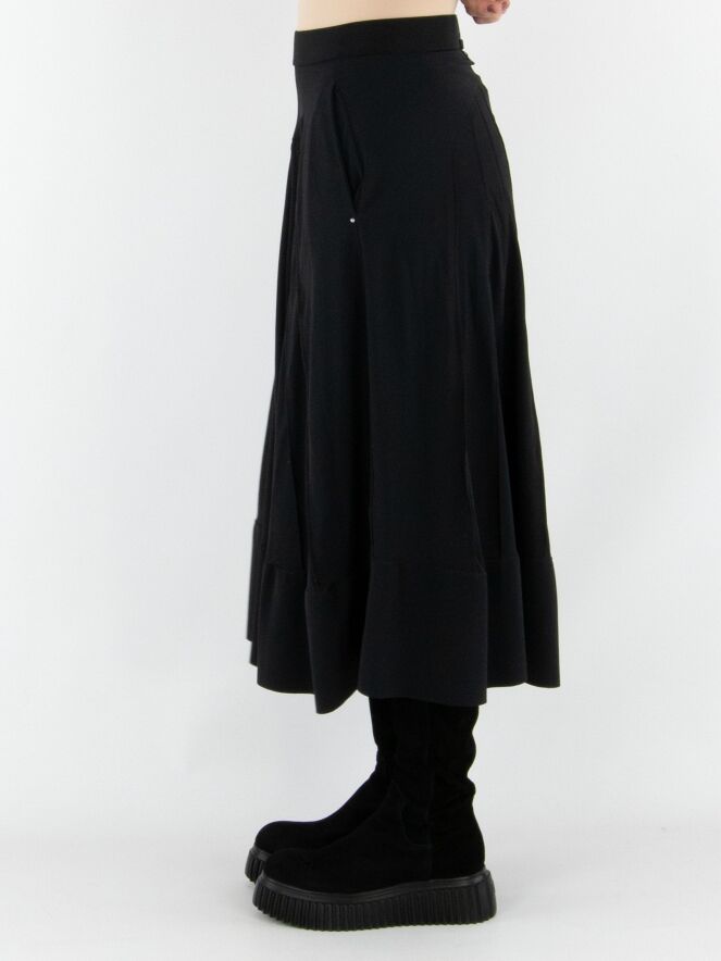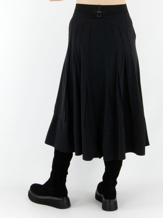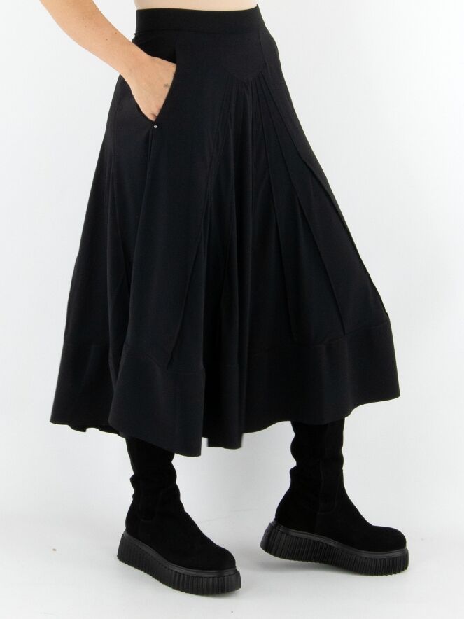 A wide, long skirt from High in black. The waist features a comfortable elastic band. Below the waistband, several inverted vertical seams run along the front and back, giving the skirt a playful and contemporary look. The skirt is designed with practical slit pockets and can be hand-washed.